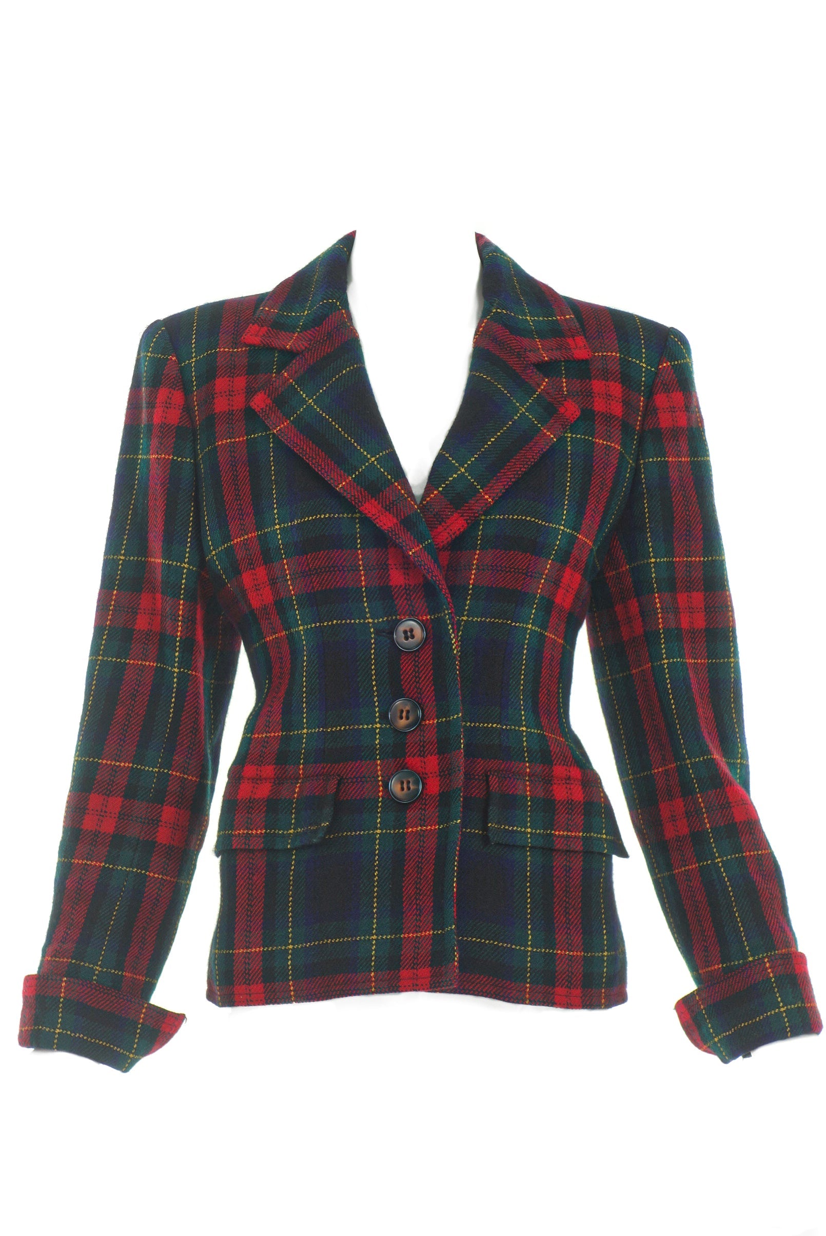 The jacket is a Saint Laurent Rive Gauche tartan print blazer. Blazer is is fitted with three tortoiseshell buttons down the front to close jacket with a notched lapel. Sleeves are cuffed with three tortoiseshell buttons. Circa 1970s. Jacket is available in boutique for purchase.