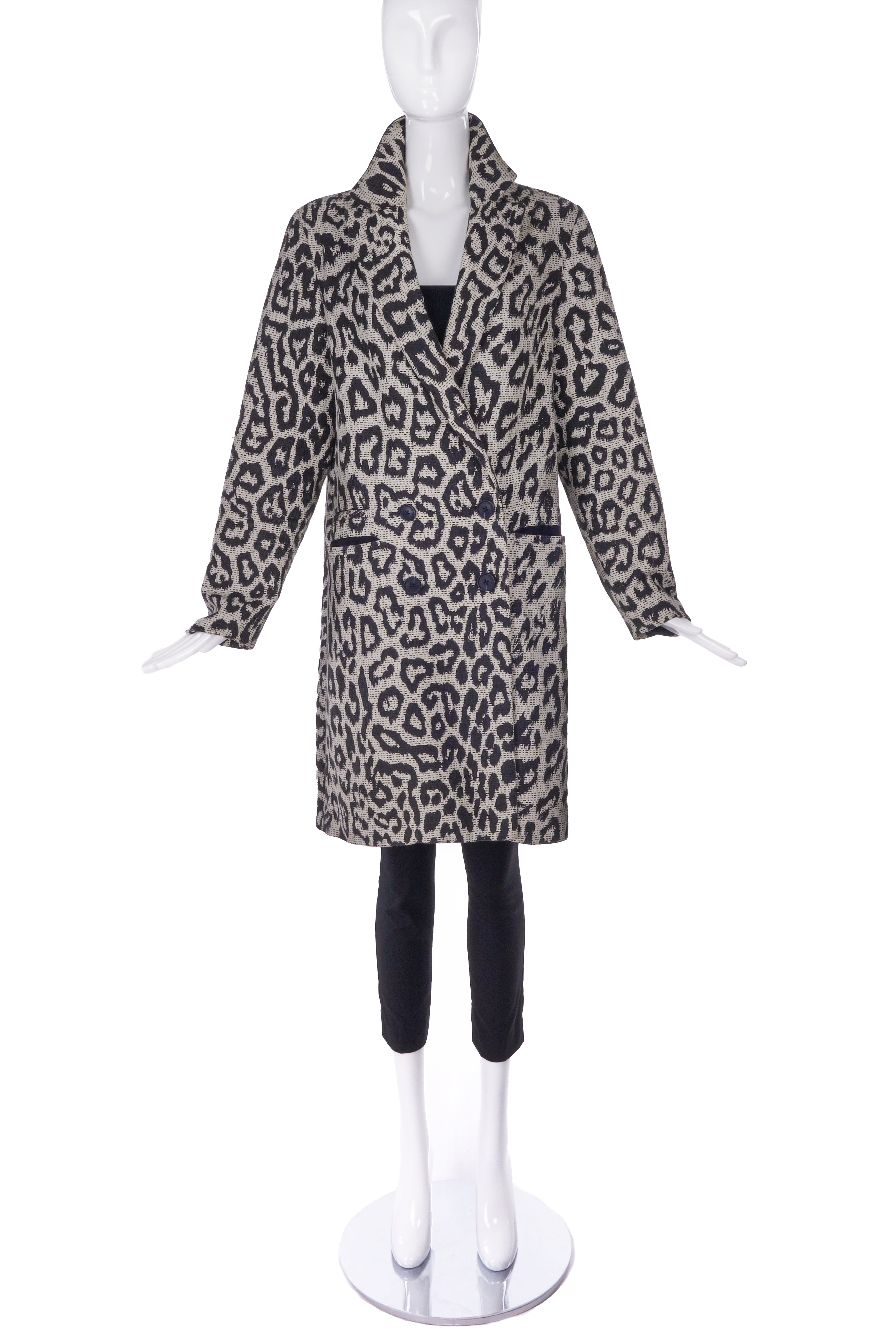 A Sea New York cotton double breasted overcoat with a textured leopard print throughout the coat. The coat has an oversized notched lapel with four black buttons along the front.