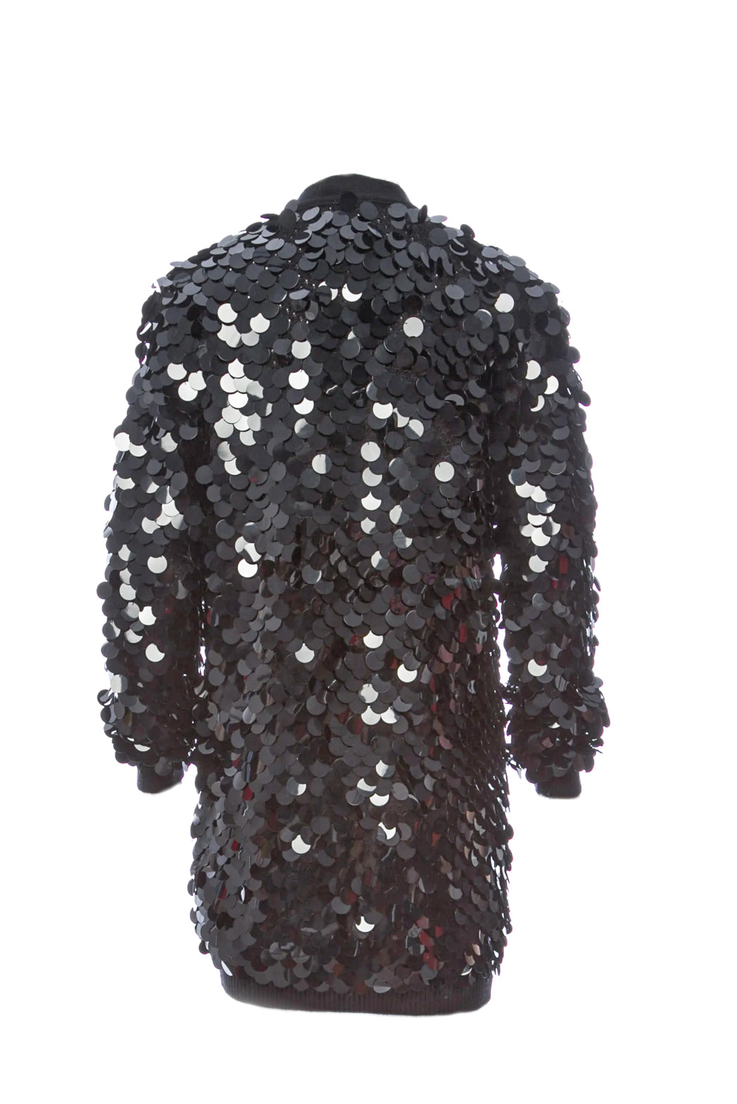 Black Sonia Rykiel wool knit cardigan with sequin embellishments, long sleeves and button closures at center front. Can be worn as a dress.