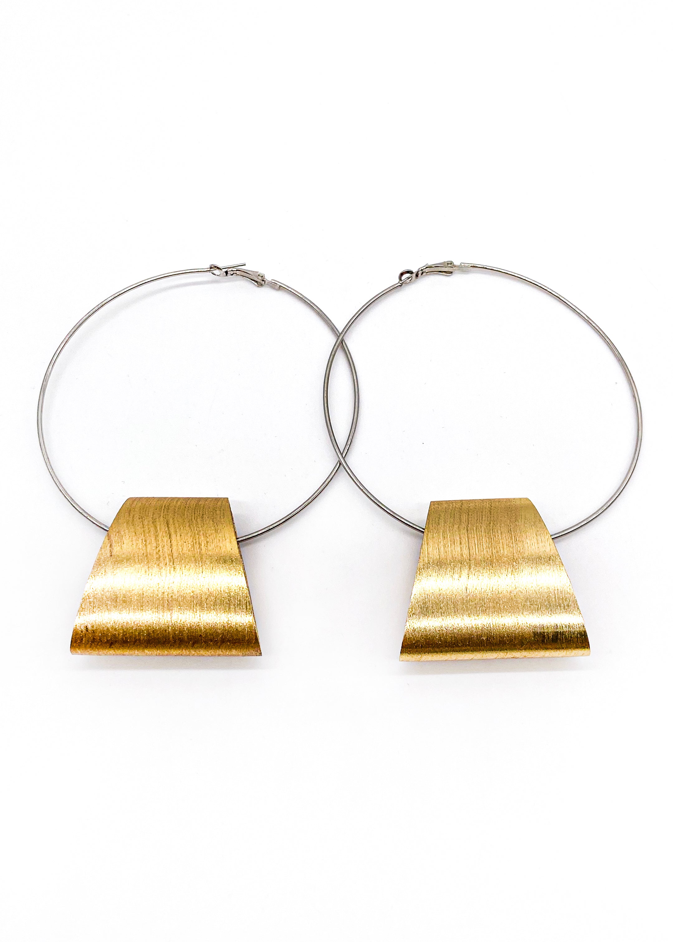 A custom hoop style earring set with golden trapezoid details with one trapezoid able to become a singular earring with earring backing.