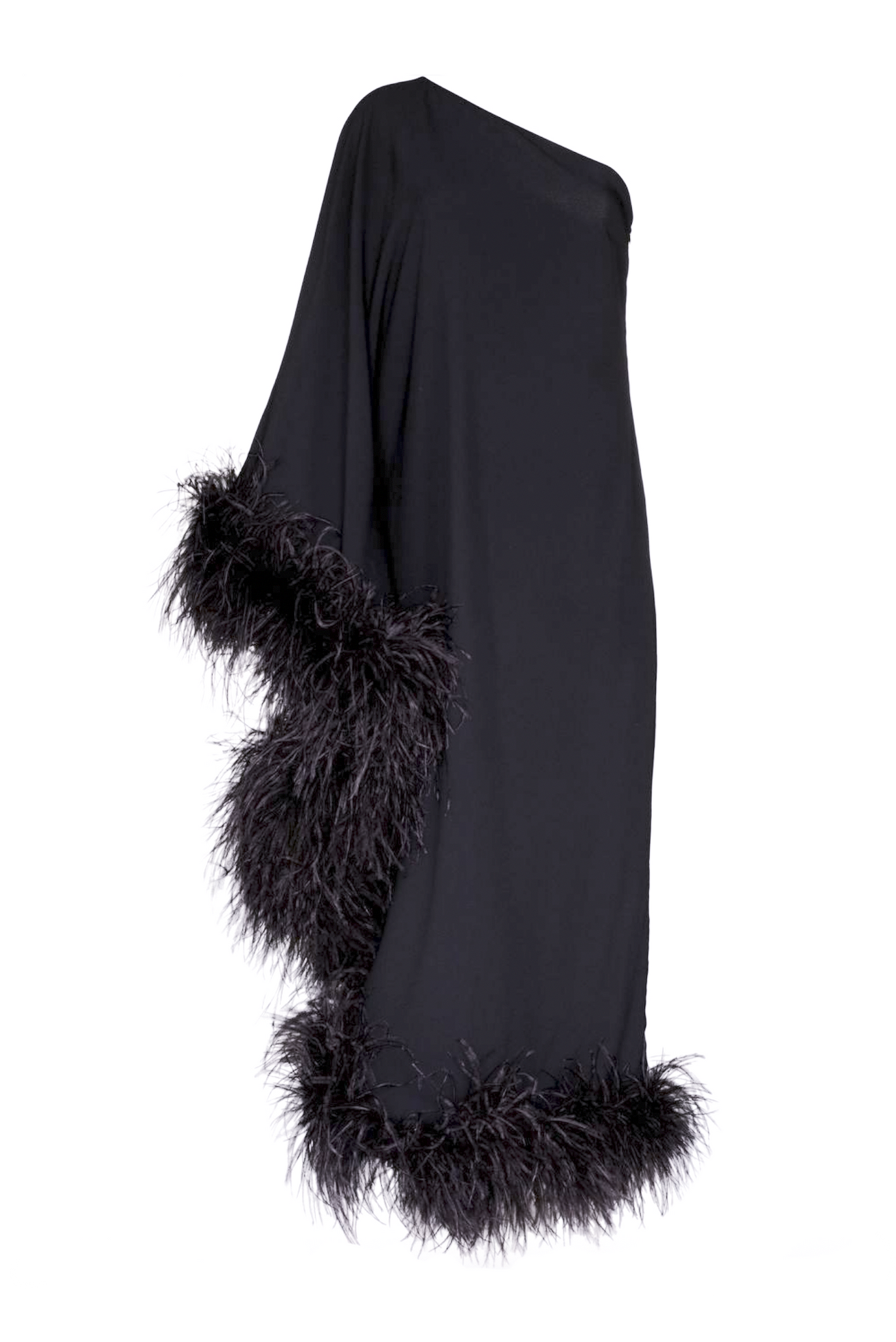 Taller Marmo Black One Shoulder Asymmetric Feather Trim Dress Gown