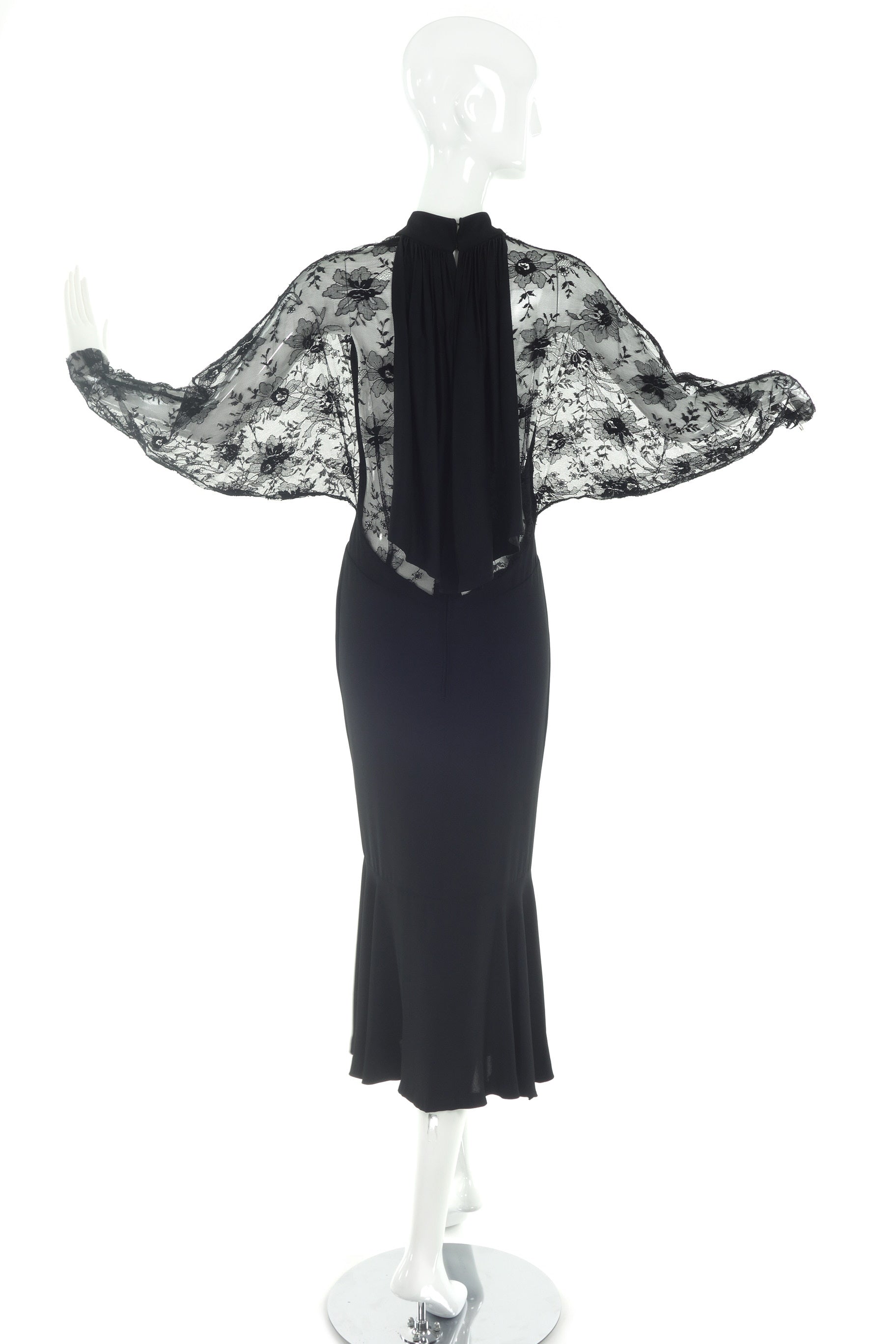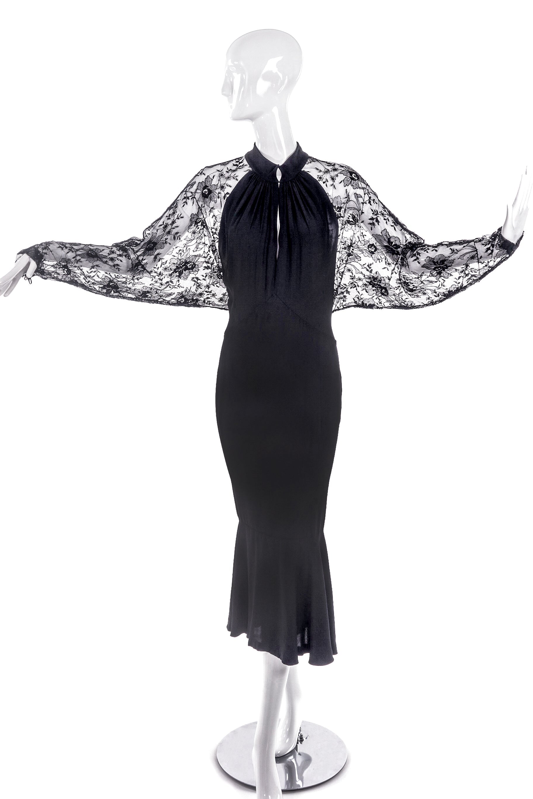 Magnificent creation - by Ted Lapidus Paris. Black crepe satin hourglass shape with fishtail bottom - dolmain lace sleeves and an open lace back.