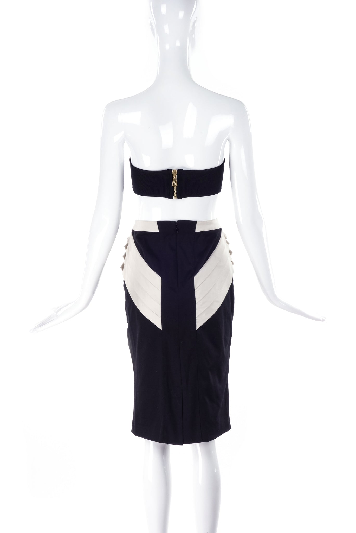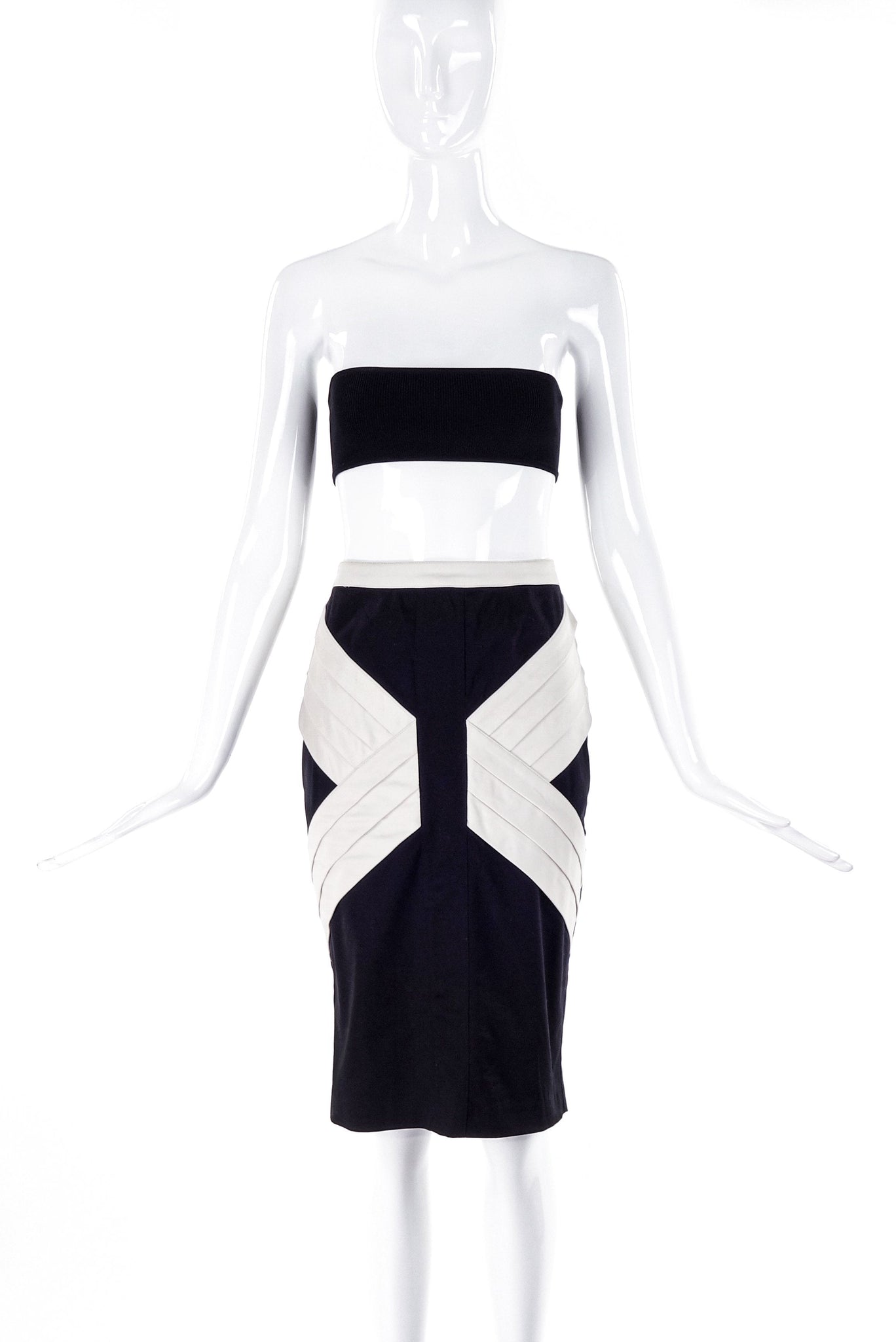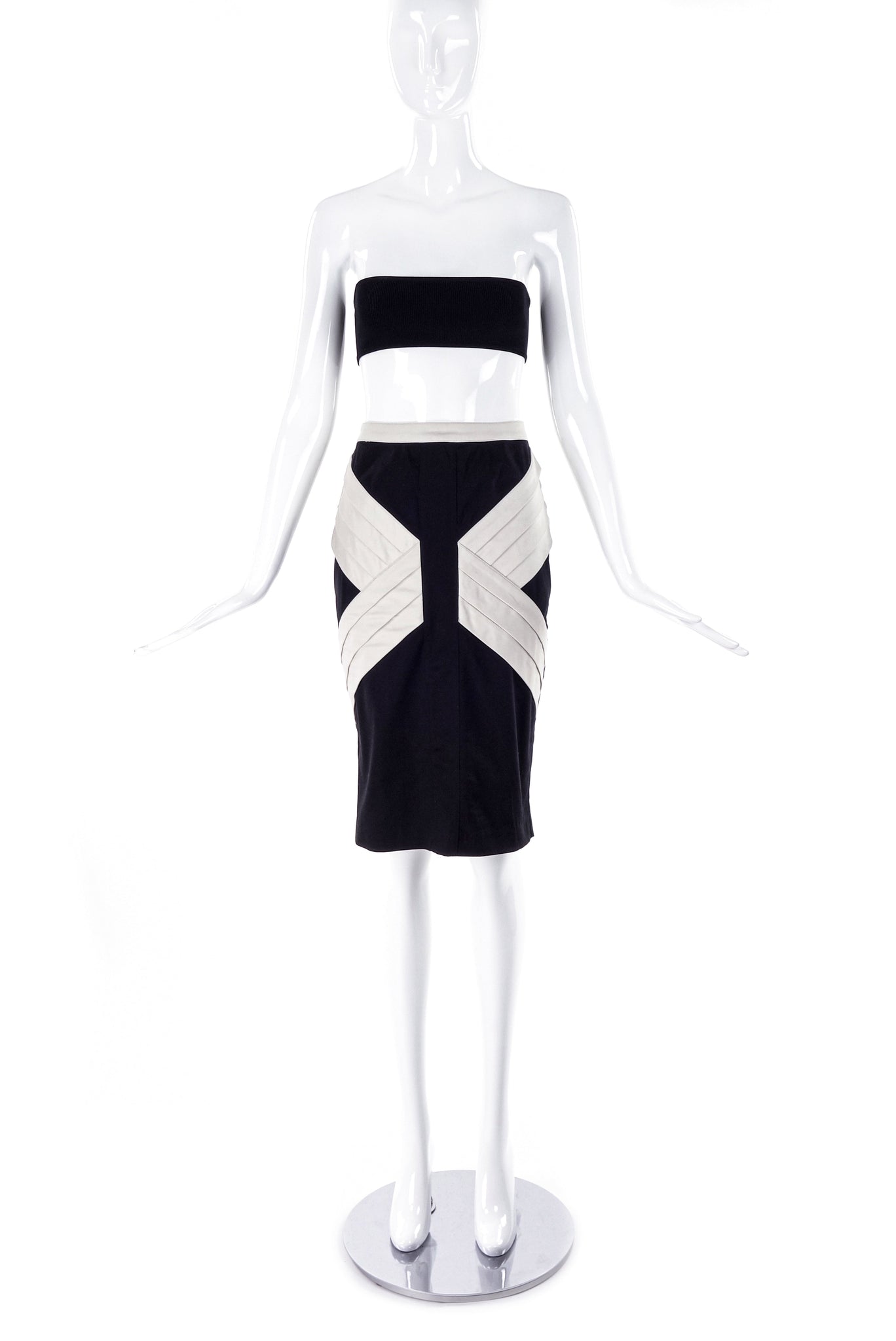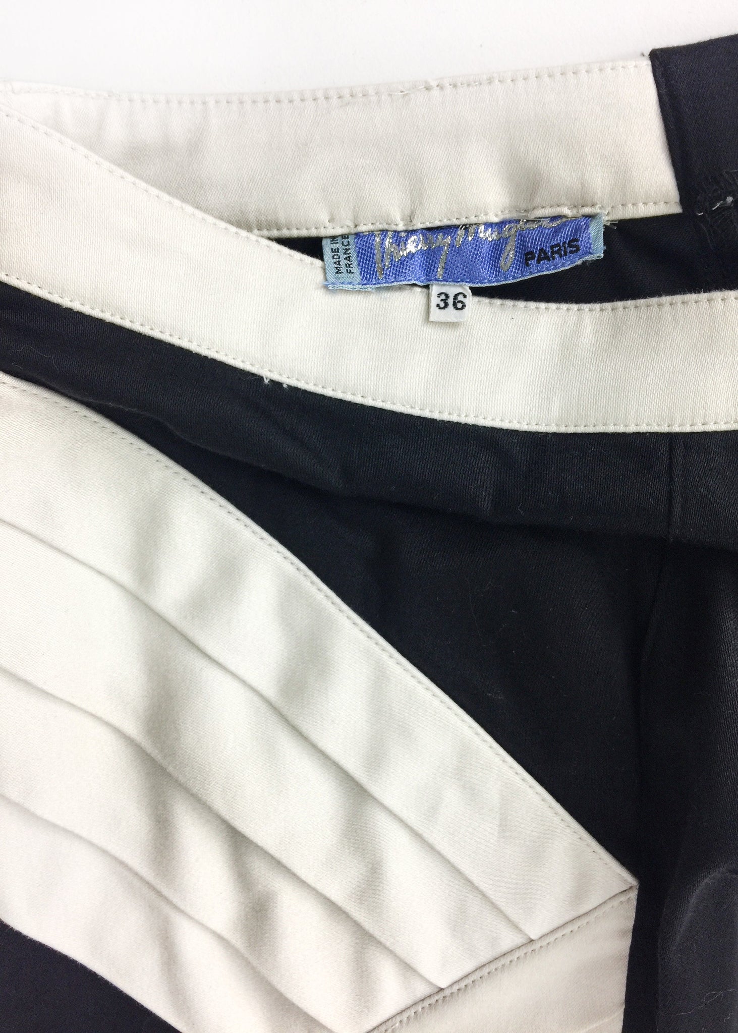 A Thierry Mugler black pencil skirt with geometric white pleat details at the hips. The skirt has is high waisted with a white band at the waist and an invisible zipper at back of skirt.