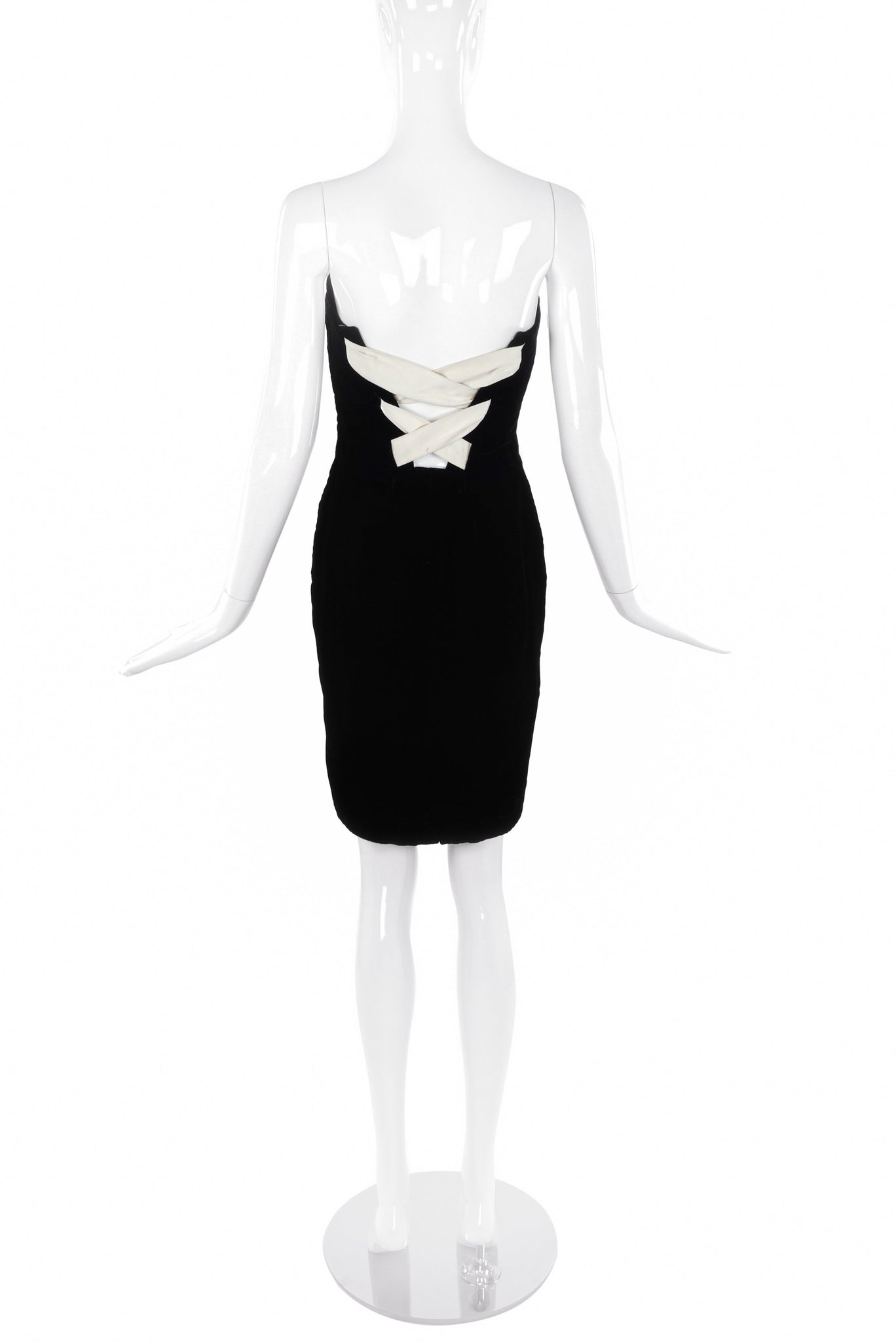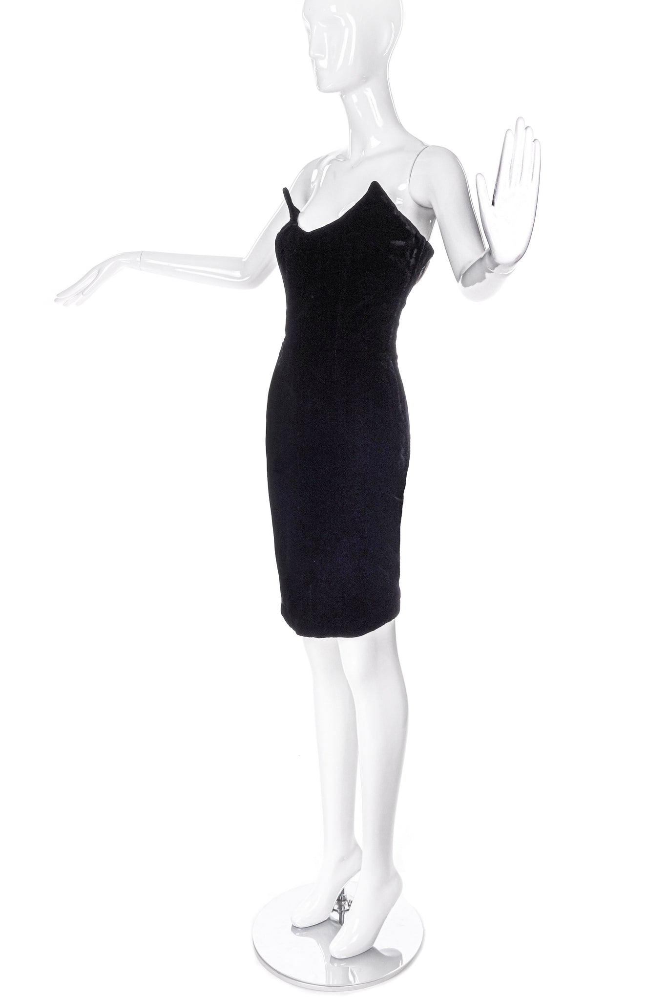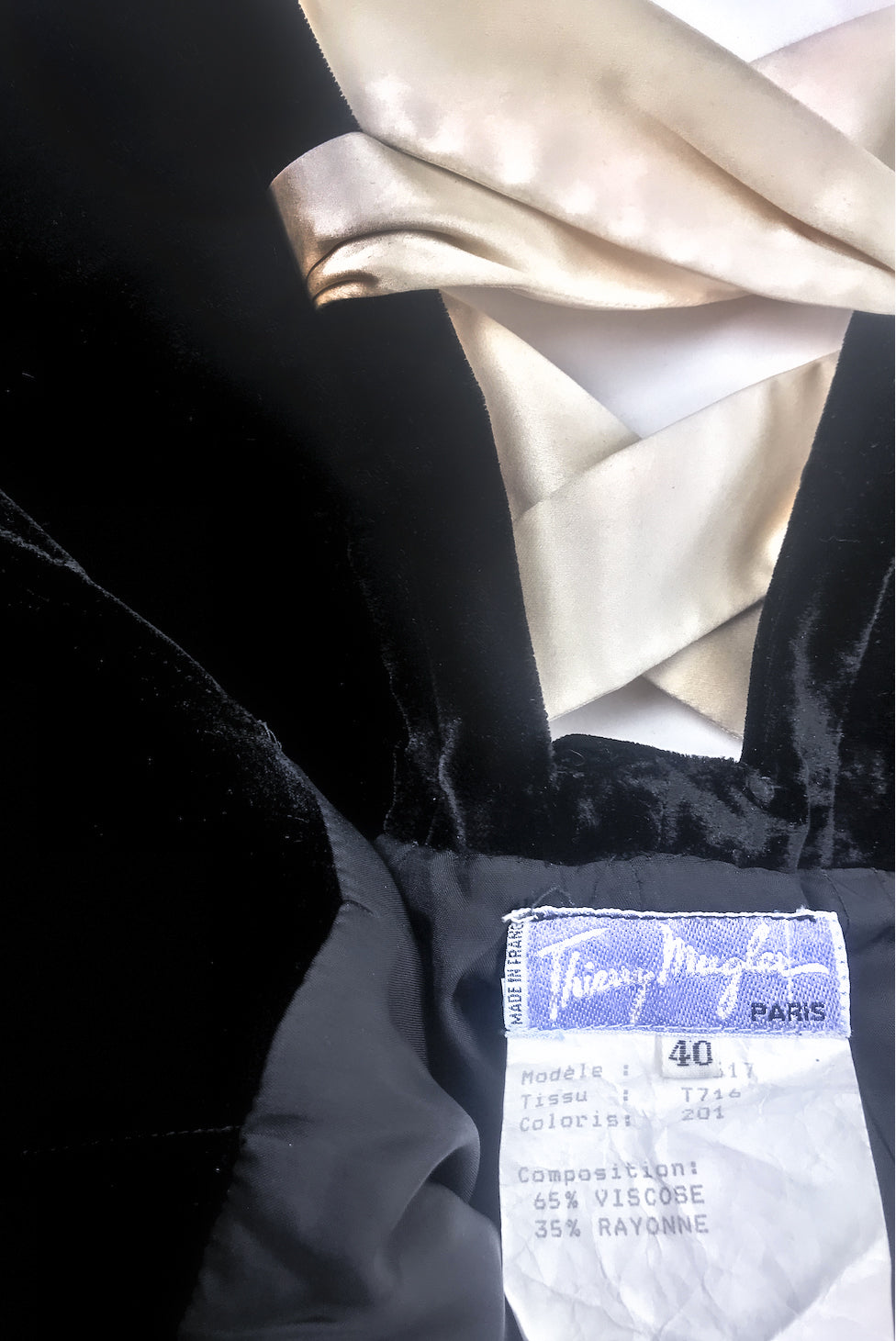 A black velvet Thierry Mugler cocktail dress with a "horned" bust line and cream satin ribbon lacing along the back.
