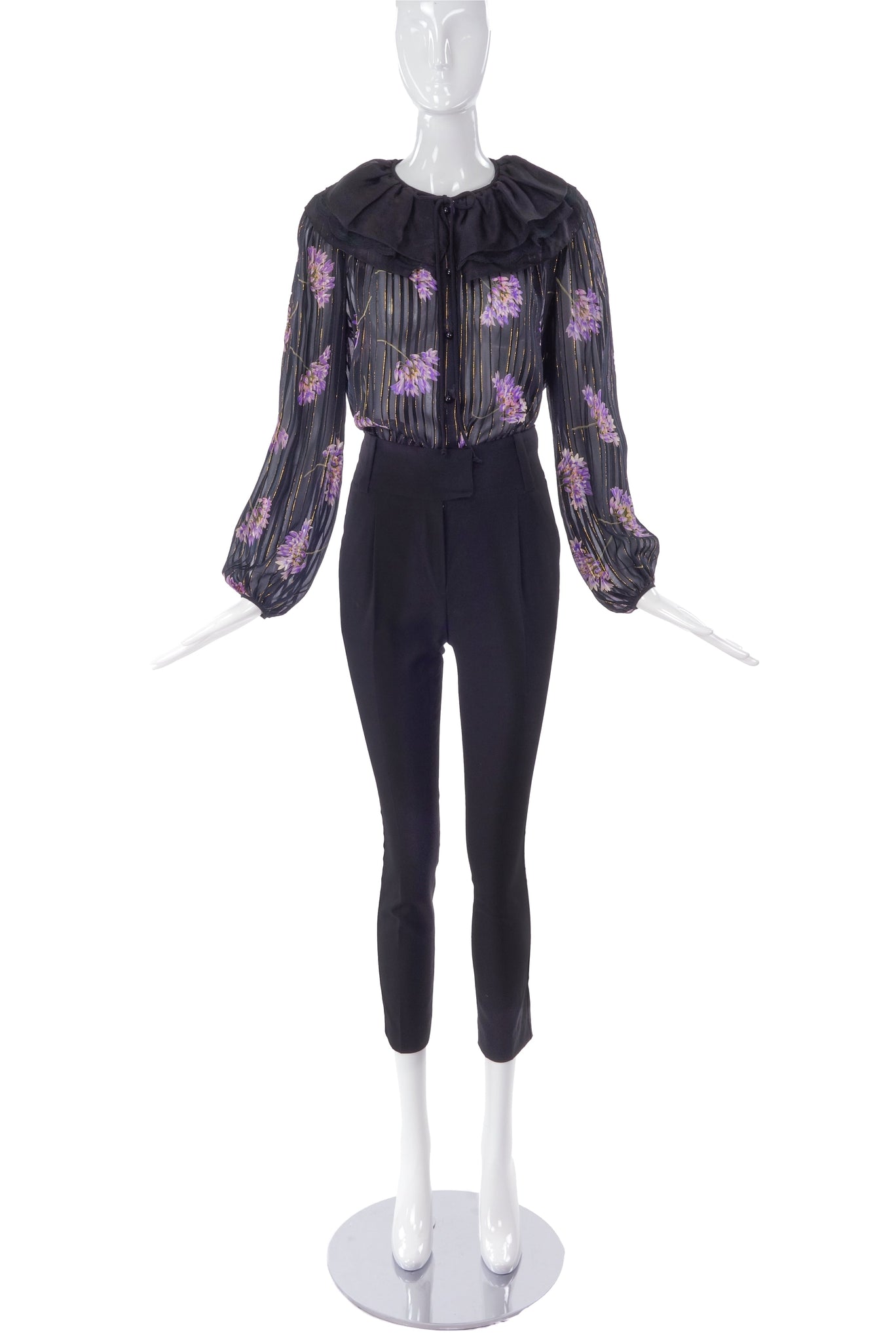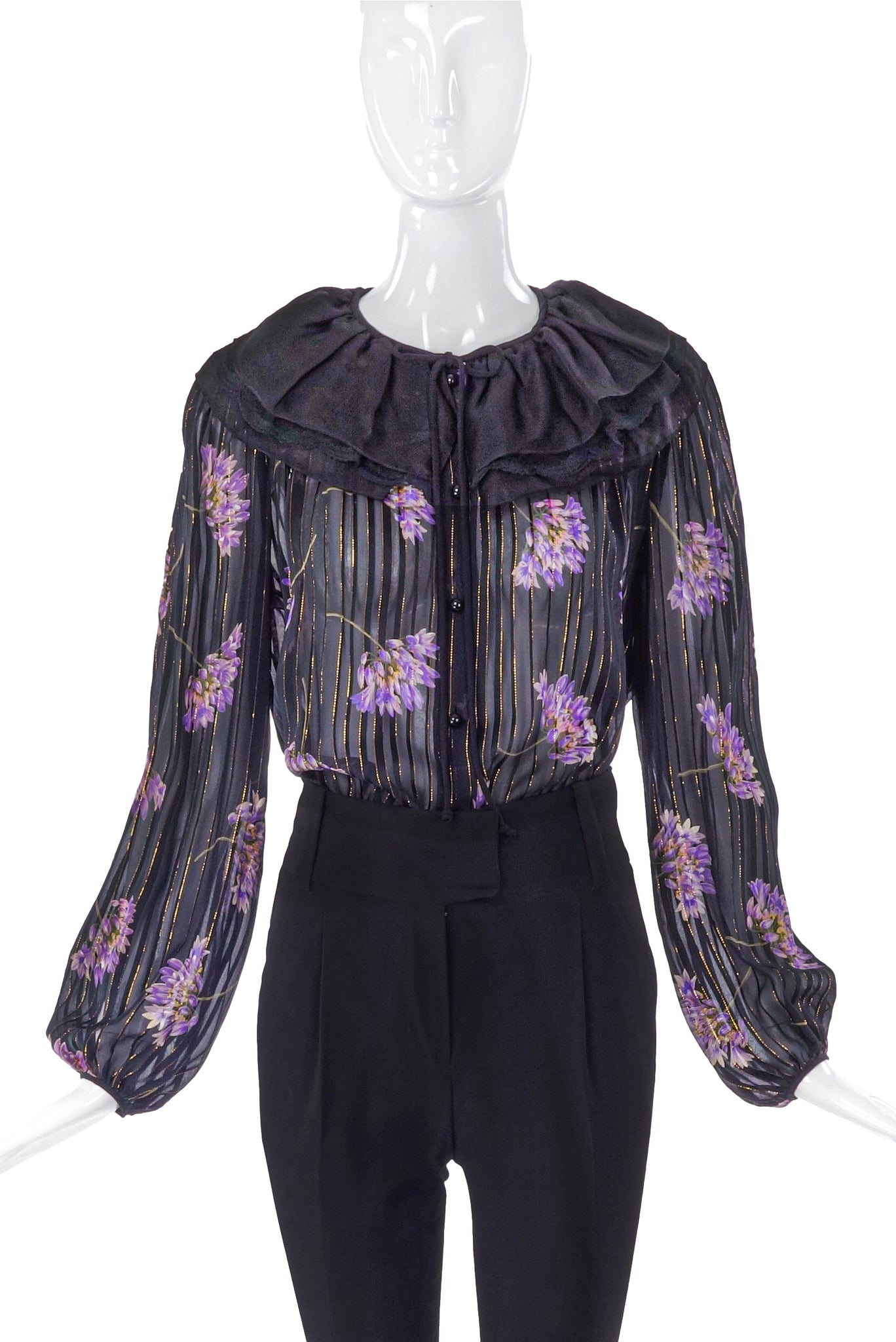 A vintage Valentino Boutique sheer black chiffon blouse highlighted with gold lurex stripes and a purple floral print throughout the fabric. The blouse has elegant blouson sleeves and an exaggerated double puritan collar. The blouse has round black resin buttons down the front of the blouse and button closures at the cuff of the sleeve. Circa 1980s.