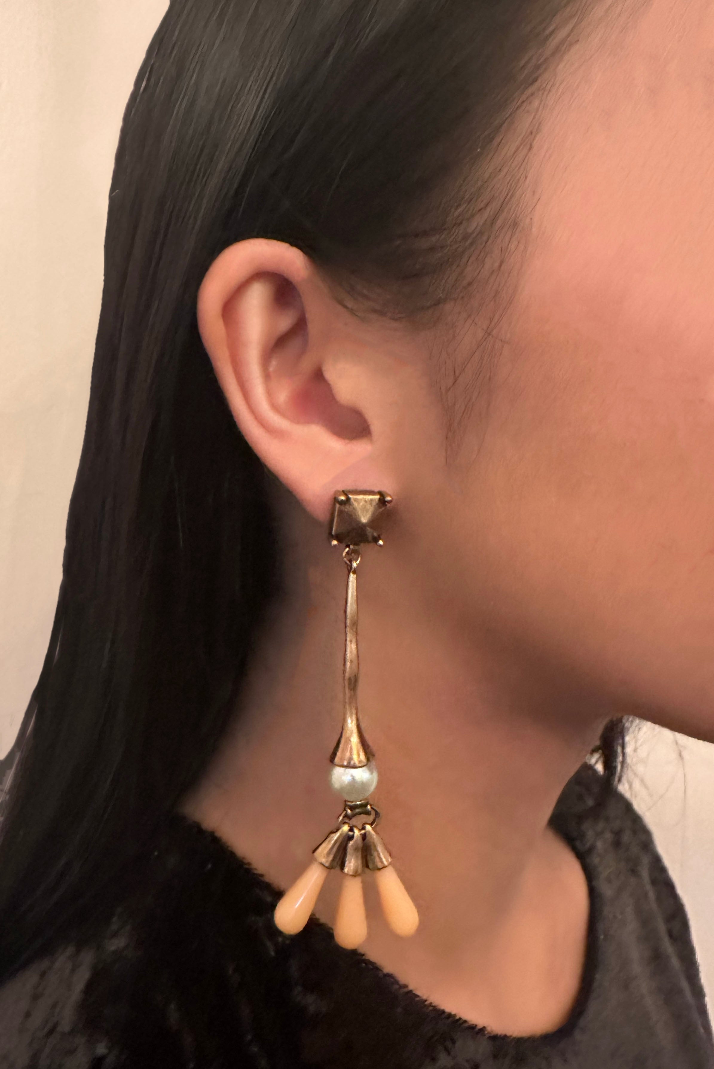 A pair of Valentino drop earrings cast in a bronze tone. The earrings are highlighted with a single pearl at the bottom of each and a trio of coral toned elongated bead details. Push back earring backing. For pierced ears.