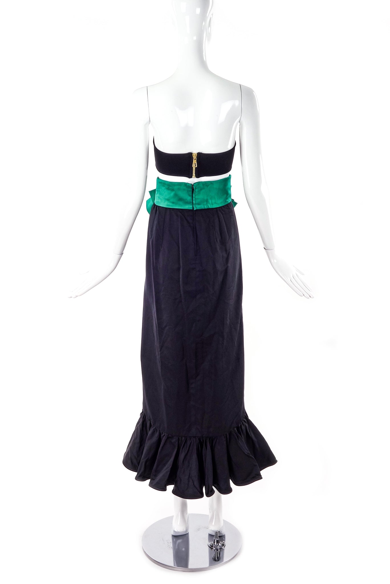 A Valentino Night label black satin skirt with a gorgeous emerald green belt-like detail around the waist accented with a black and emerald green bow at the waist cascading into a shining satin ruffle down the skirt.