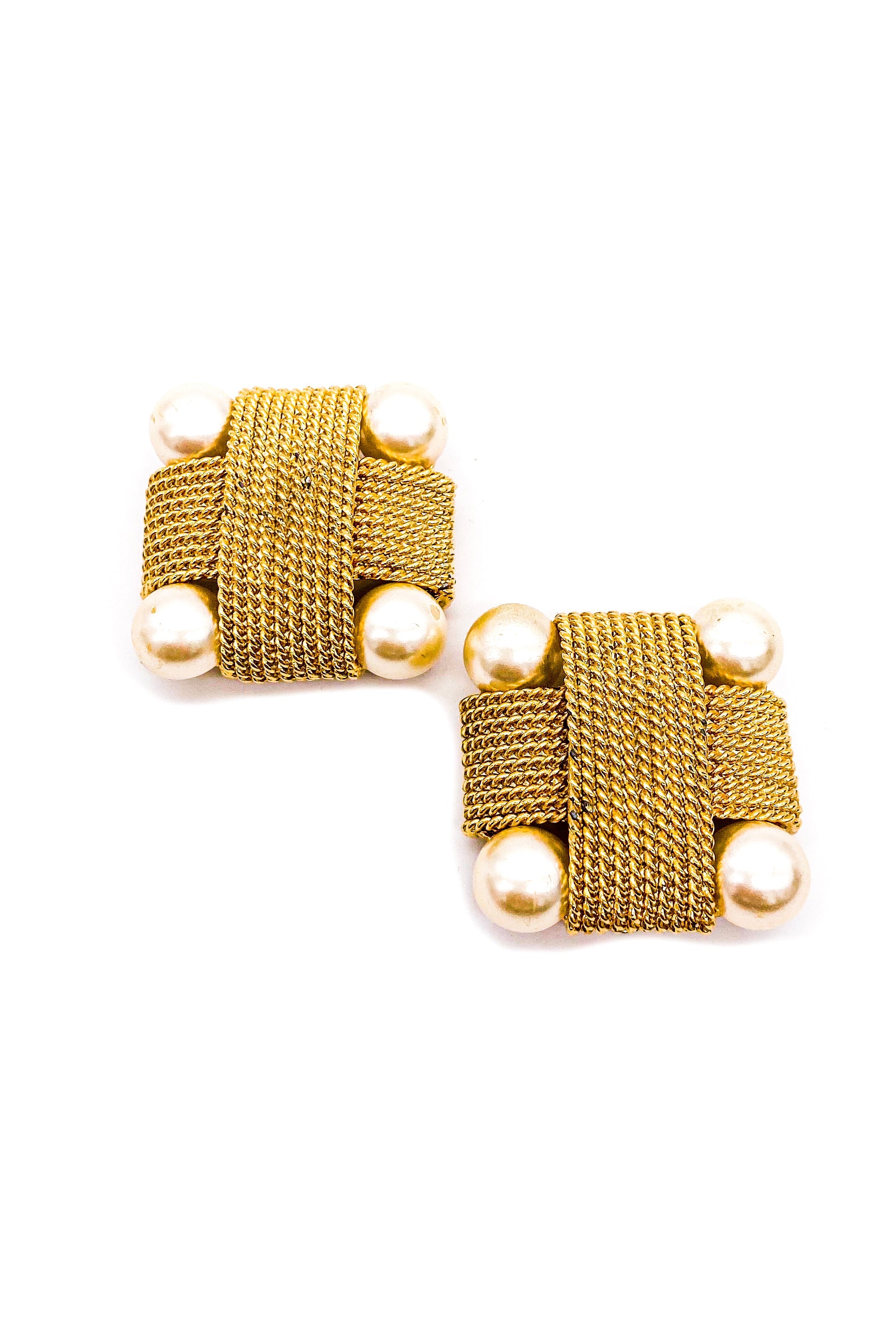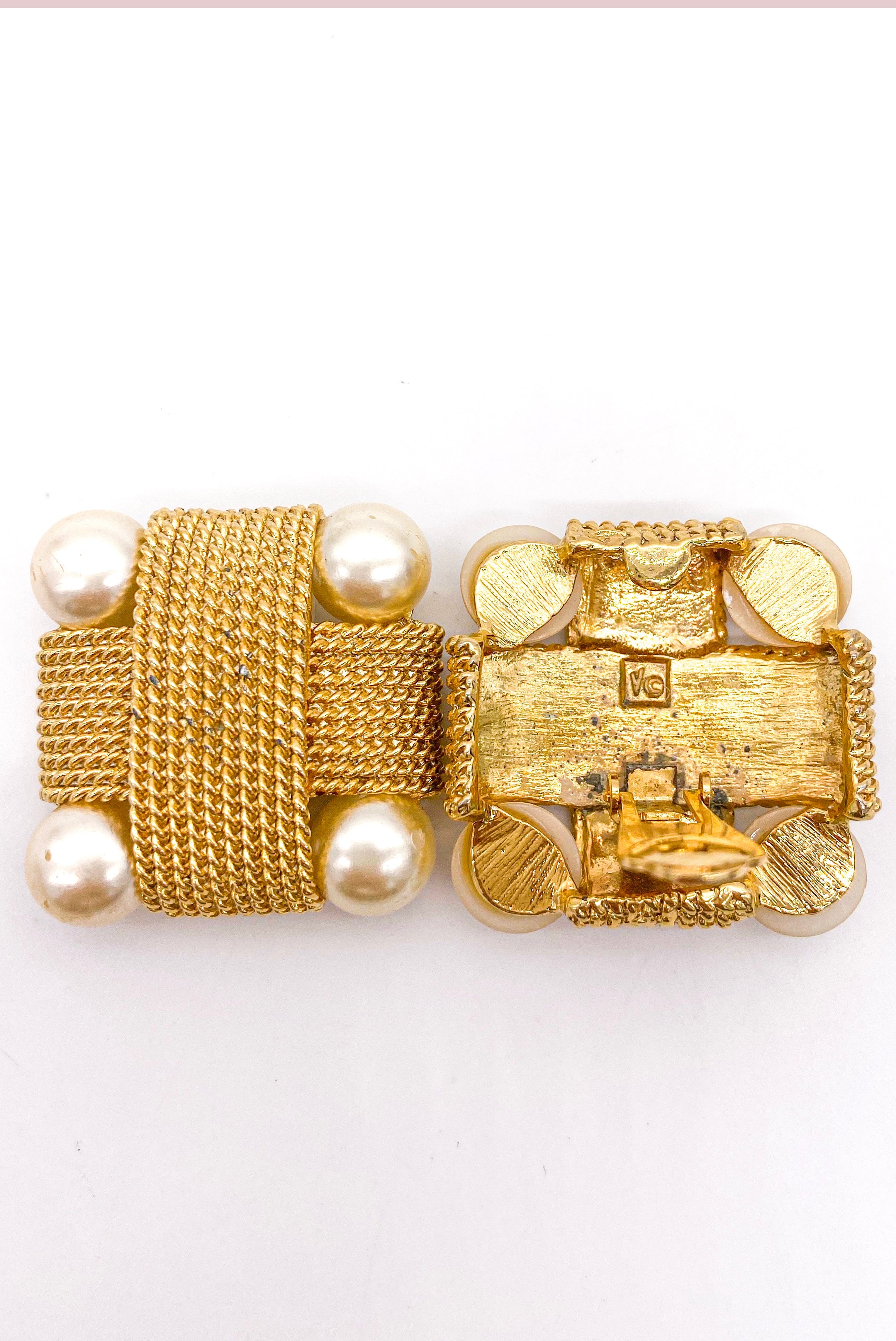 Valentino gold costume earrings with a chain-like texture and a costume pearl positioned on each of the four corners. The earrings have a clip on backing and are stamped for authenticity. Circa early 1990's.