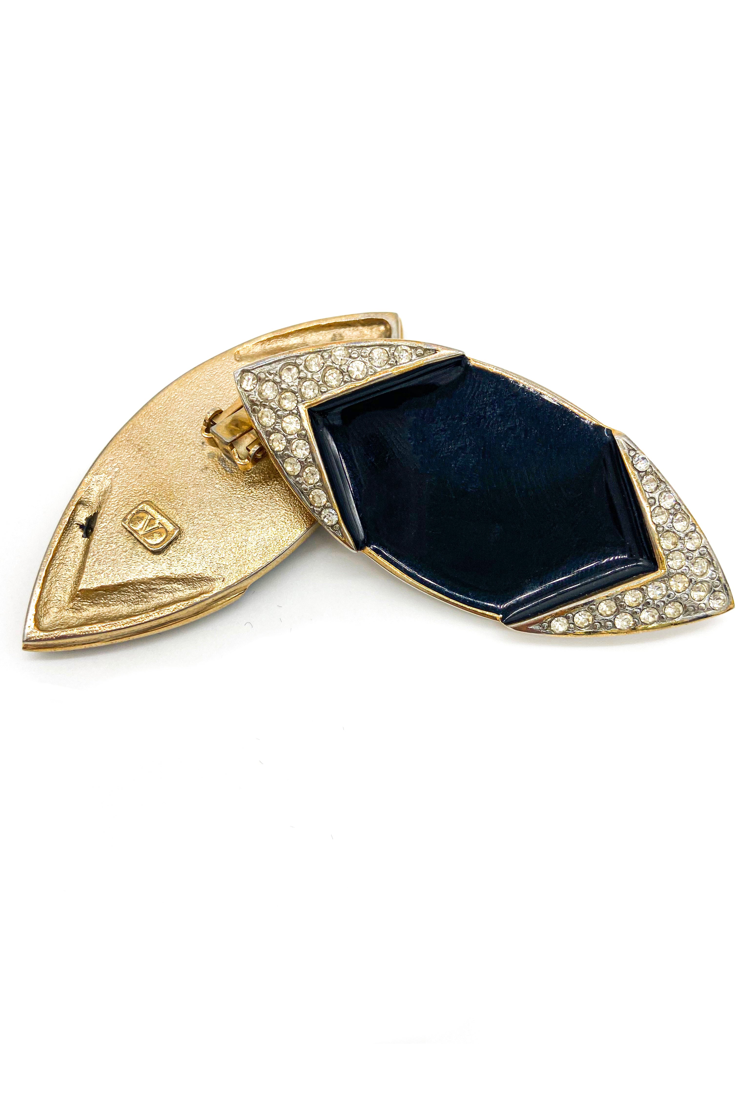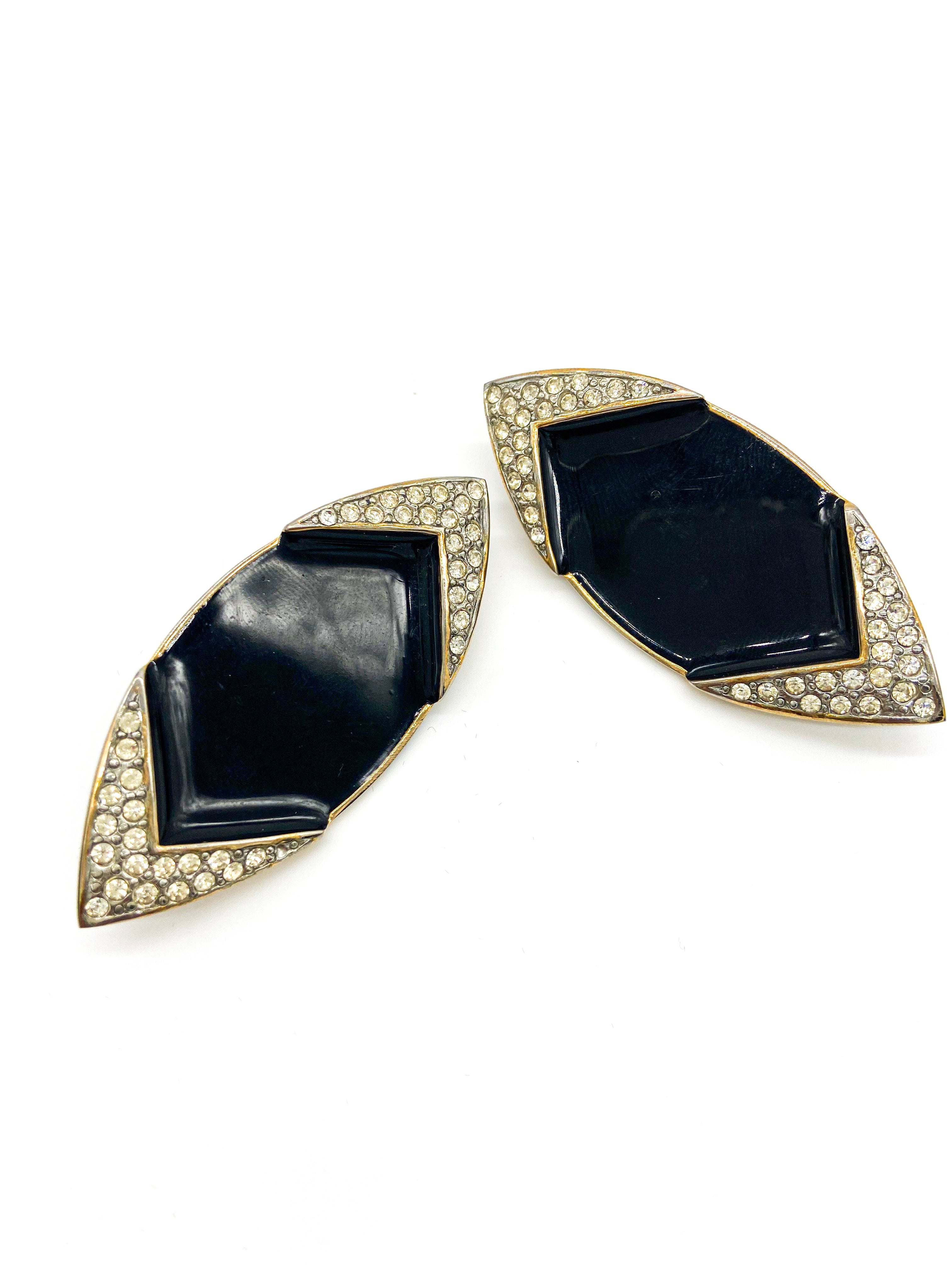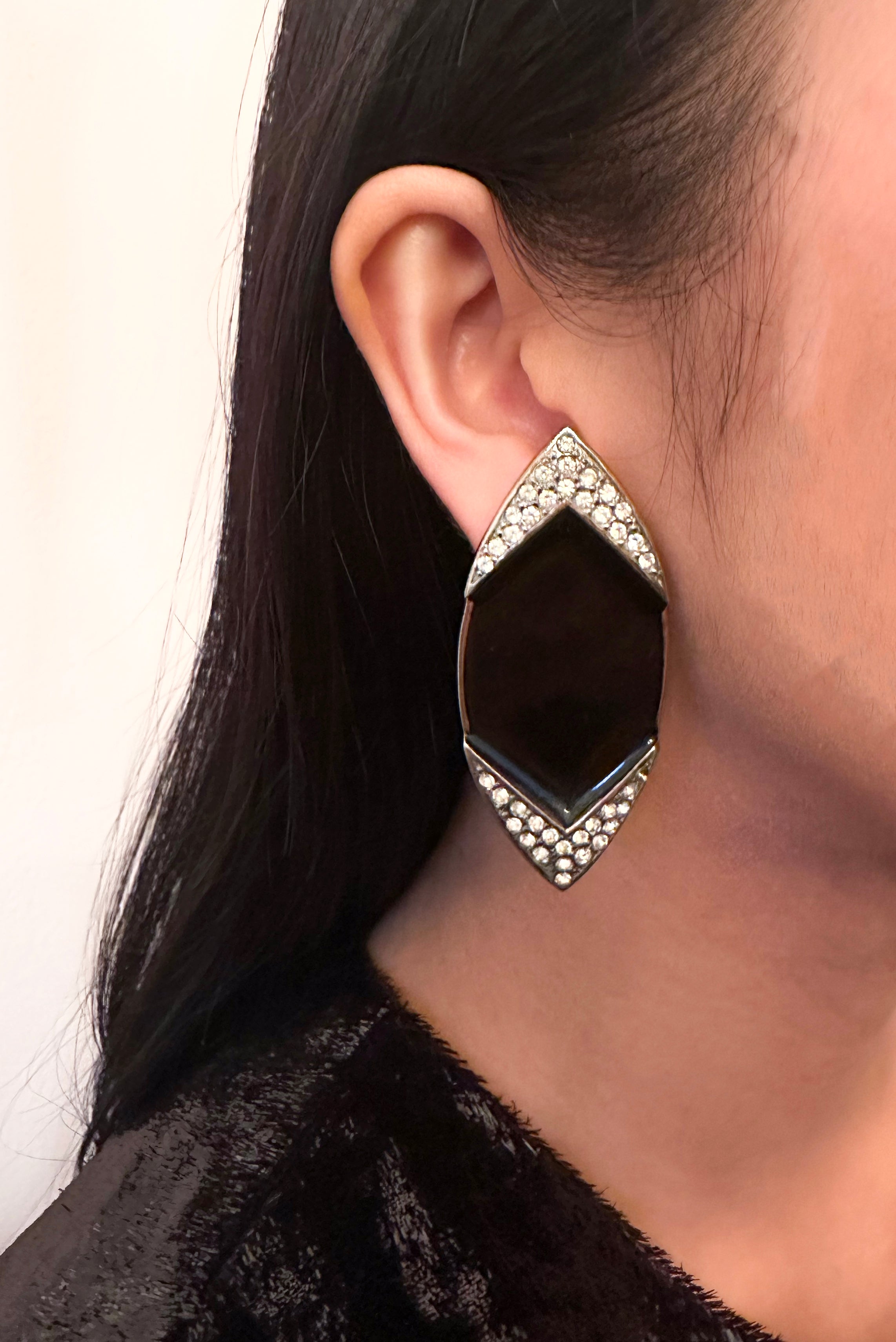 Valentino Silver Triangular Pentagon Vintage Black Enamel Rhinestone Earrings - BOUTIQUE PURCHASE PRICE
