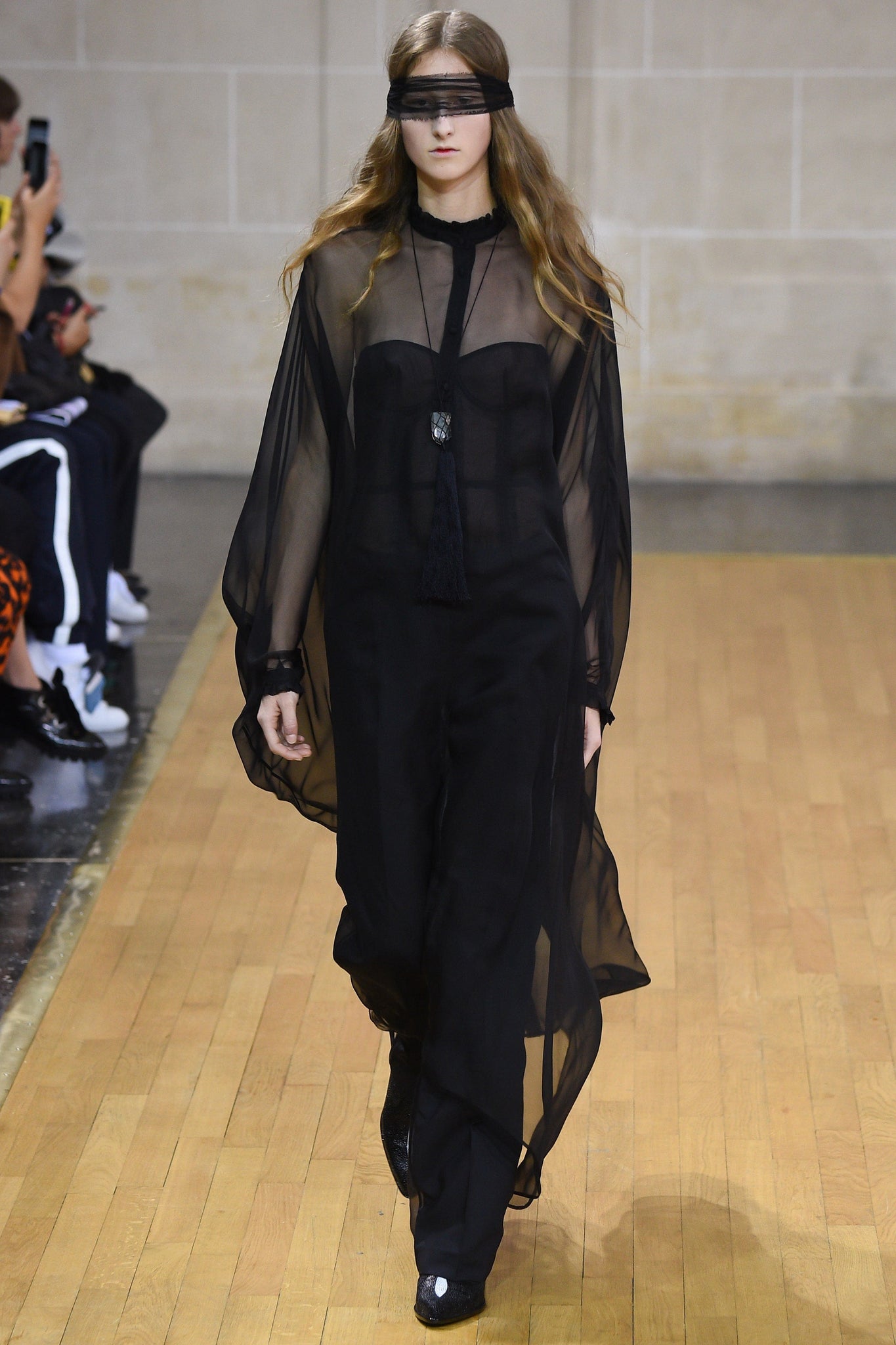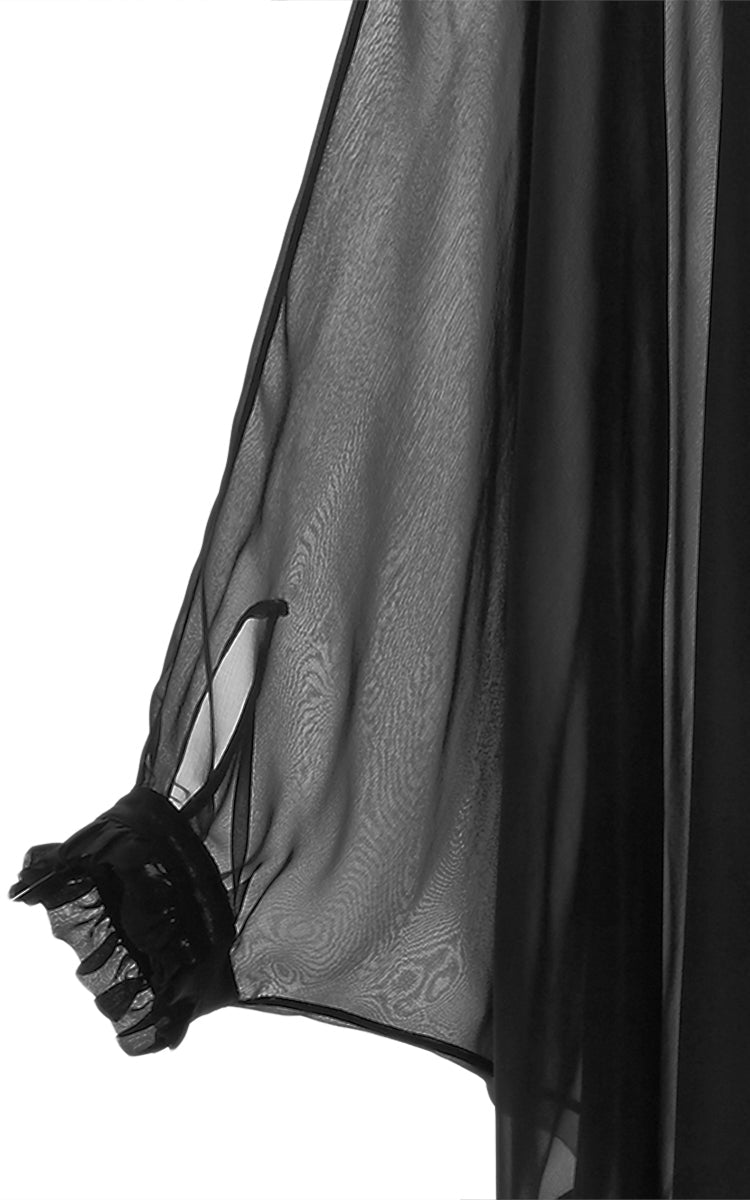 A Veronique Branquinho black sheer chiffon high necked dramatic caftan. The caftan has a high collared neck with pleated chiffon and a button-up detail on the front. Gathered cuffs to create a sleeve detail with a button closure.
