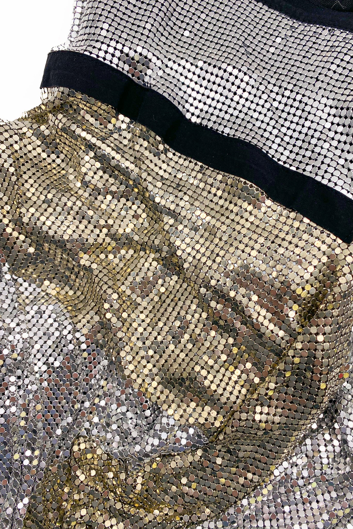 A Versus Versace black cotton asymmetrical skirt with proton chainmail tiered detail on right side of skirt. The tiered proton chain mail in silver and a brassy gold tone. This a-line skirt is a US press sample from the Versus Versace Spring / Summer 2017 collection.