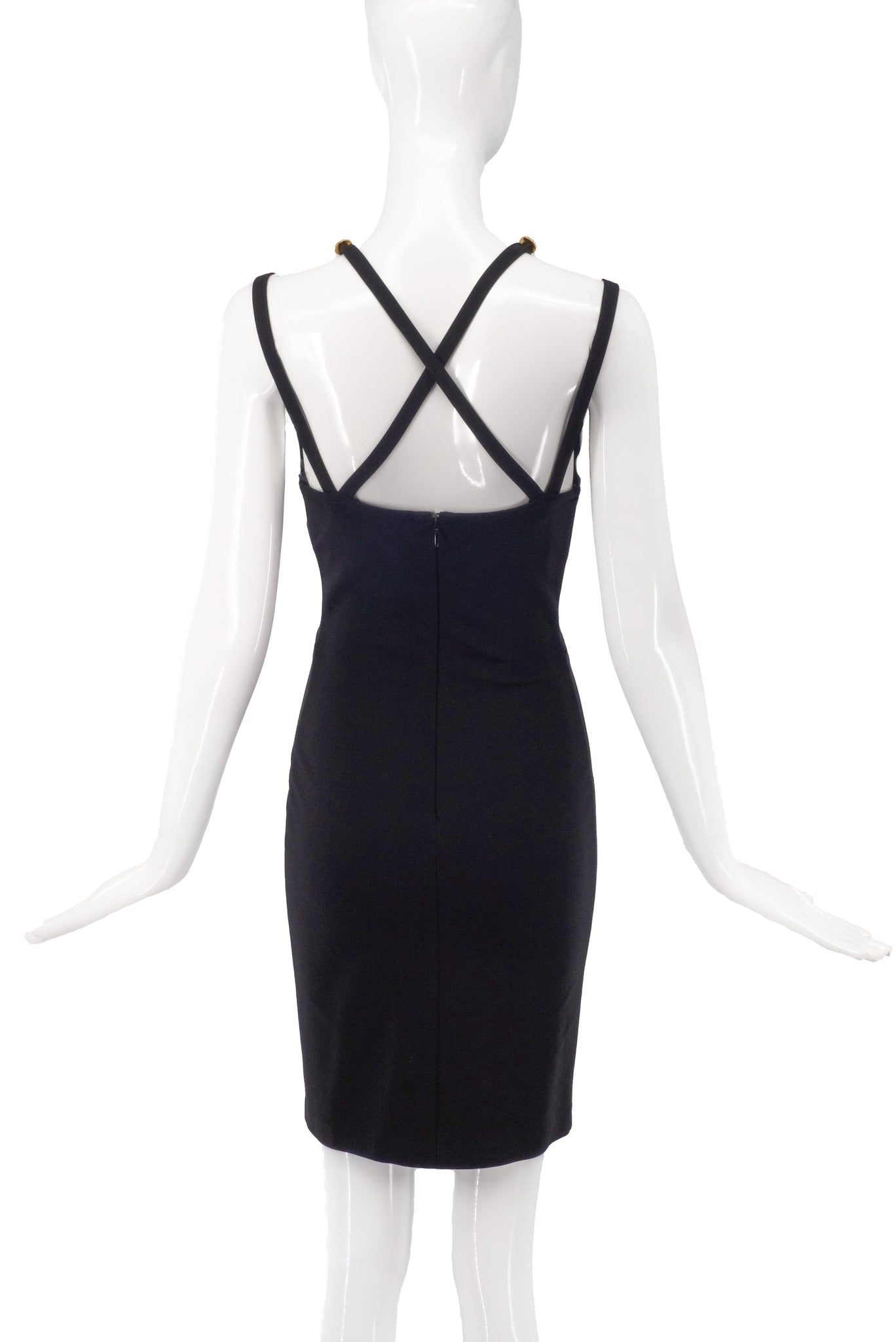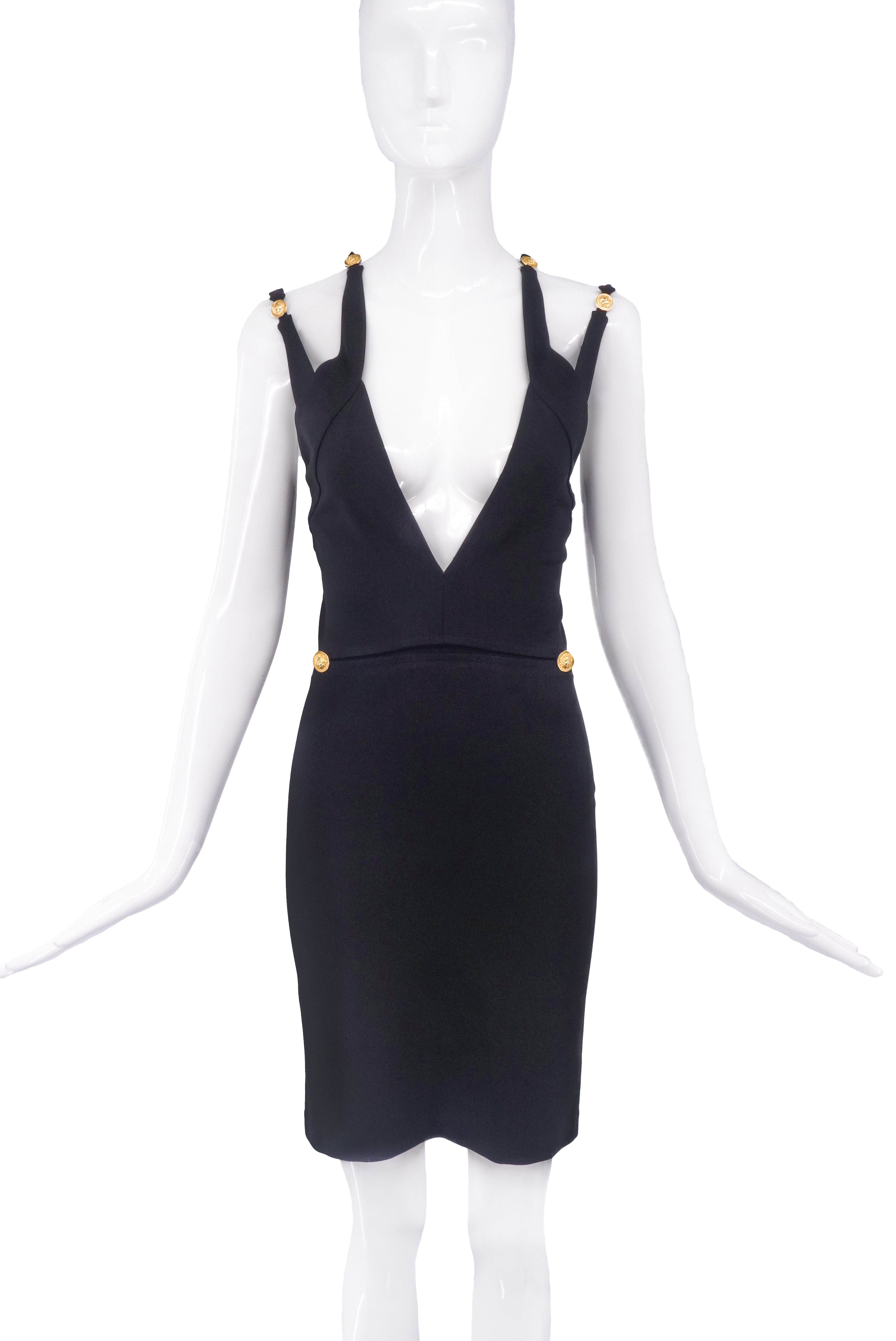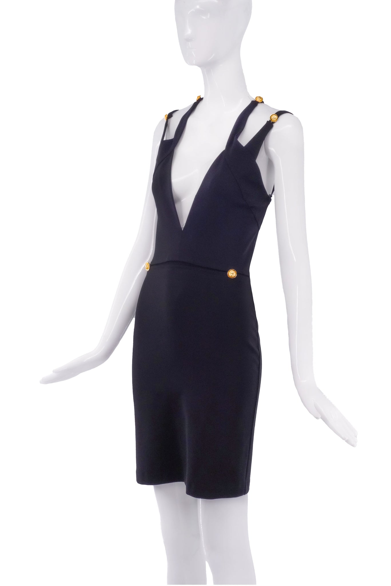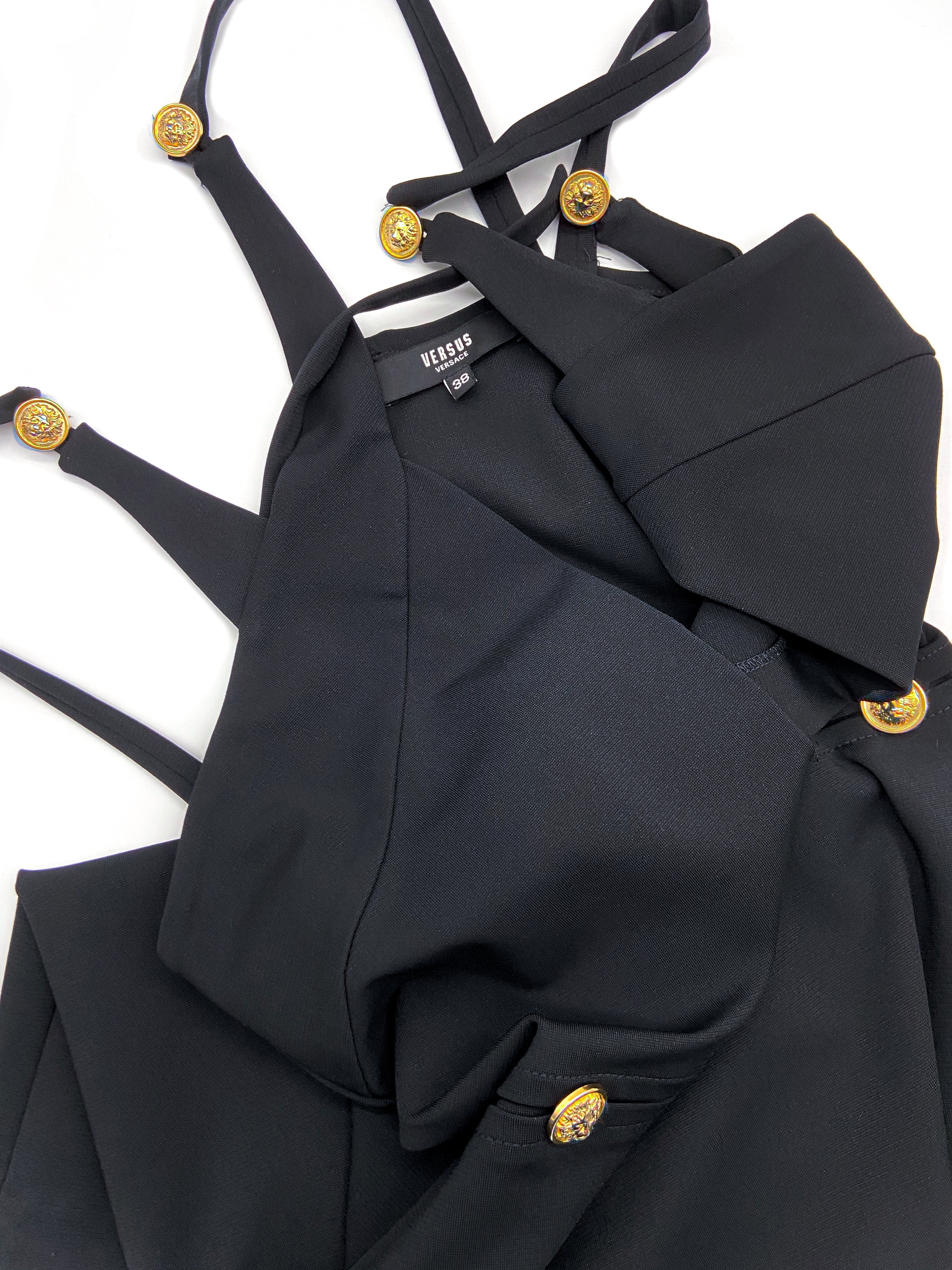 A Versus Versace Black dress with a low V neckline and multiple straps that criss cross in the back to give a sexy Versace bondage feel to the backless dress. The dress has multiple gold medallions at the straps and at the waist of the dress.