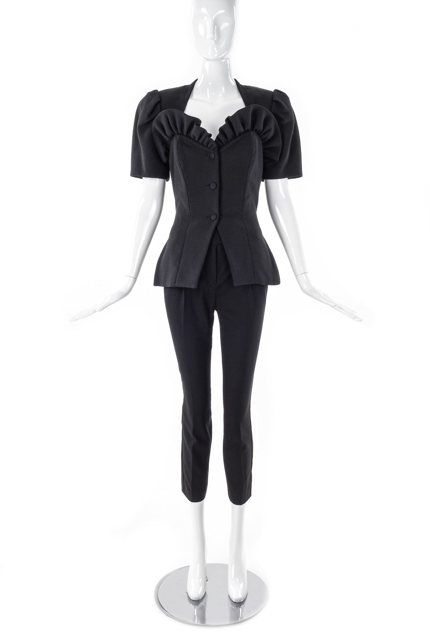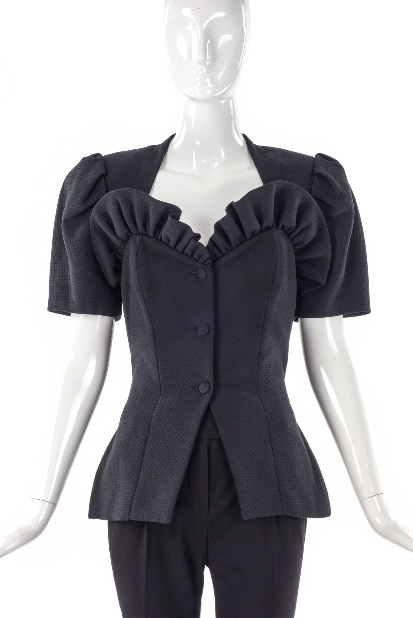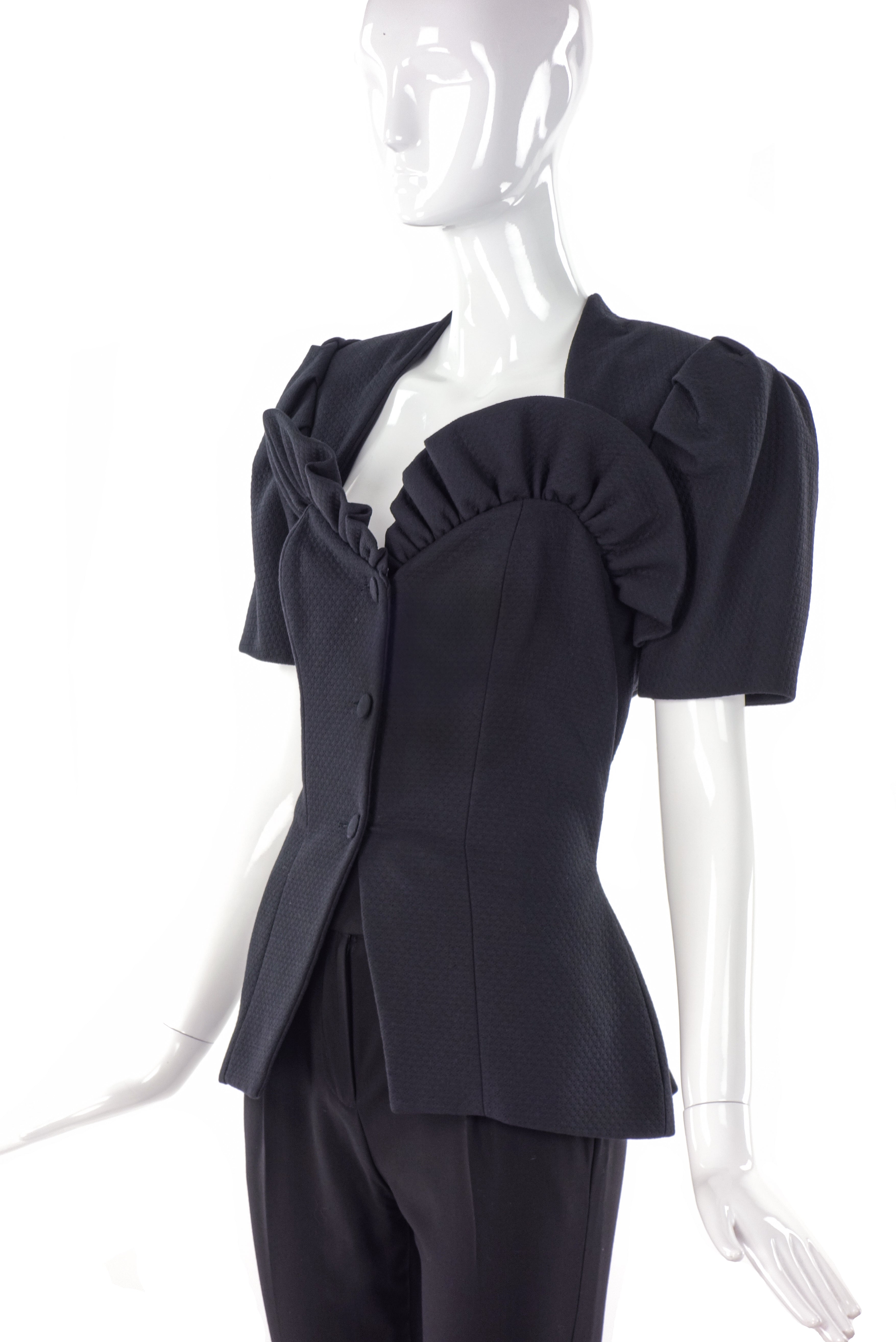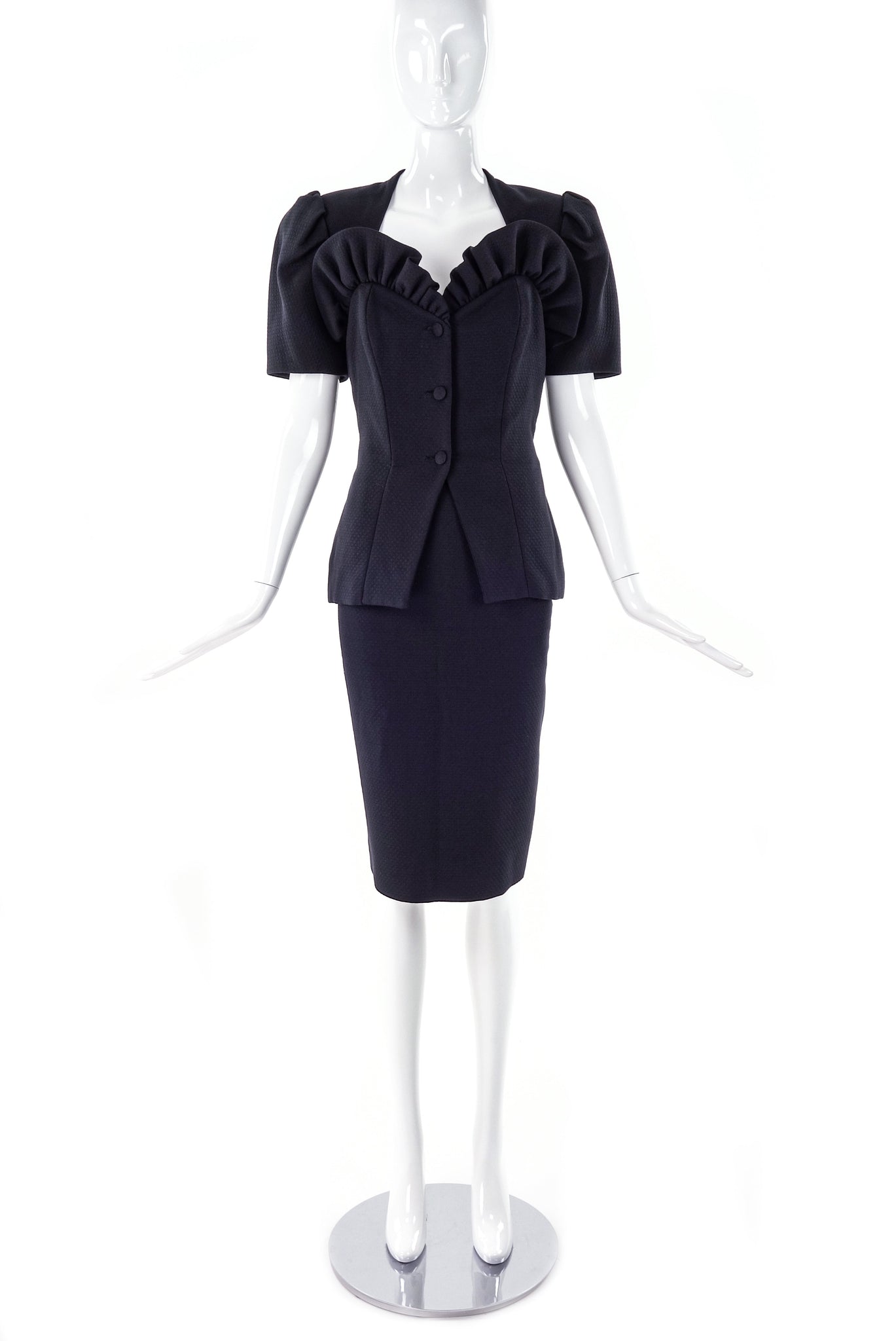 Beautiful vintage Vicky Tiel Couture suit with a ruffled sweet heart 3d sculptural neckline. Peplum waist with boning. The fabric is textured. Pleated puff shoulders - the jacket comes with matching skirt.