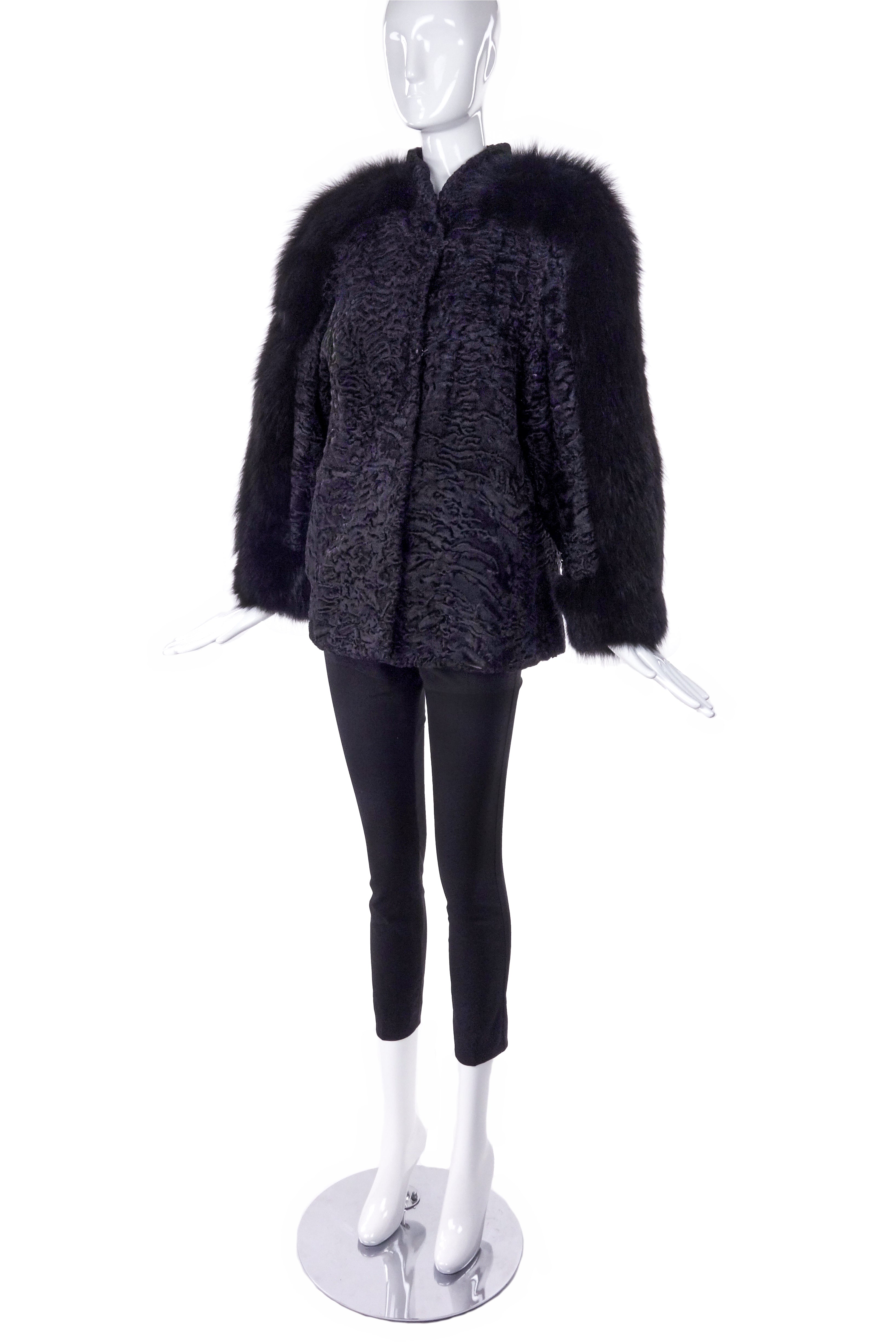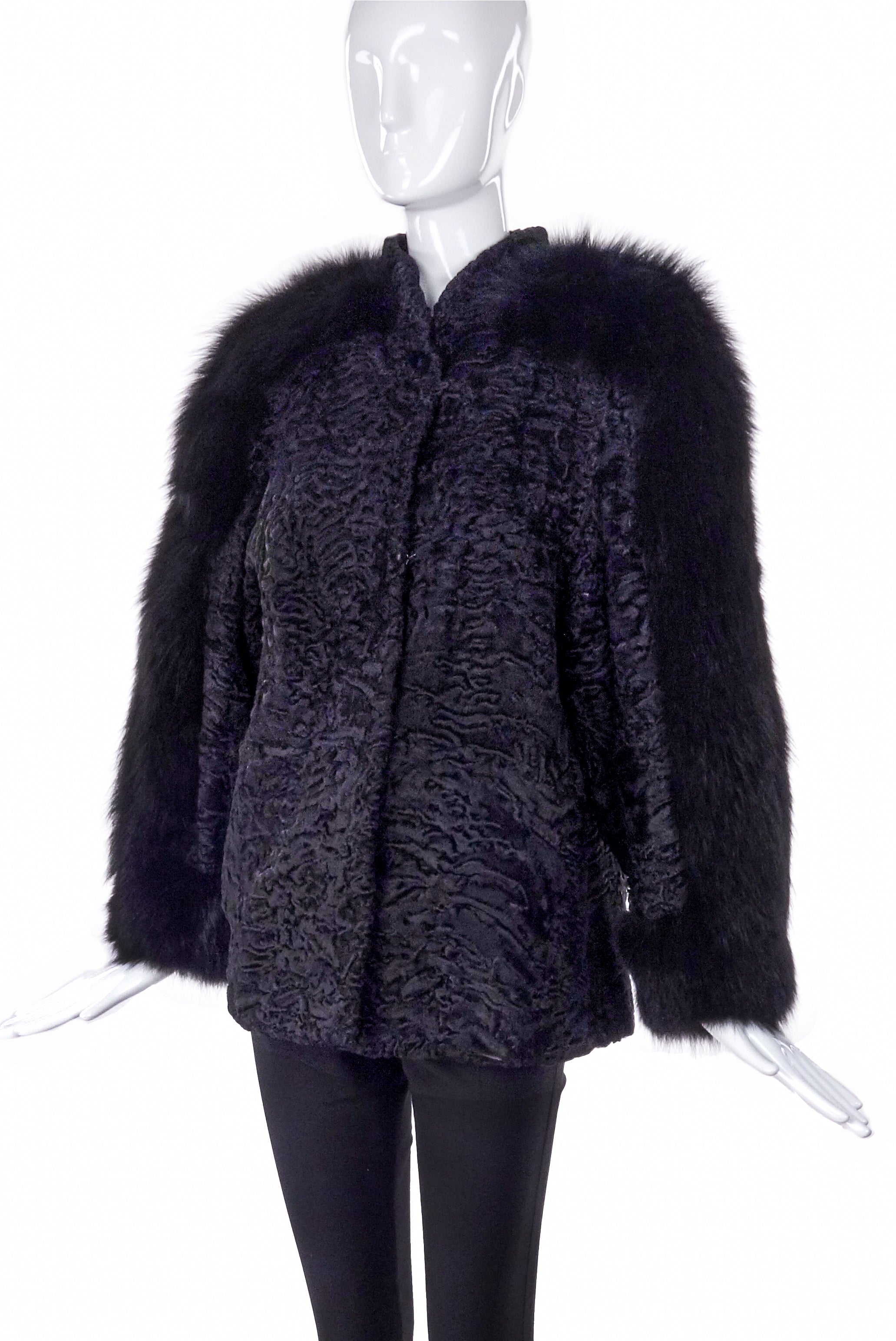 Vintage Black Astrakhan Lamb "Femme Fatale" Coat with Fox Fur Sleeve Stripe