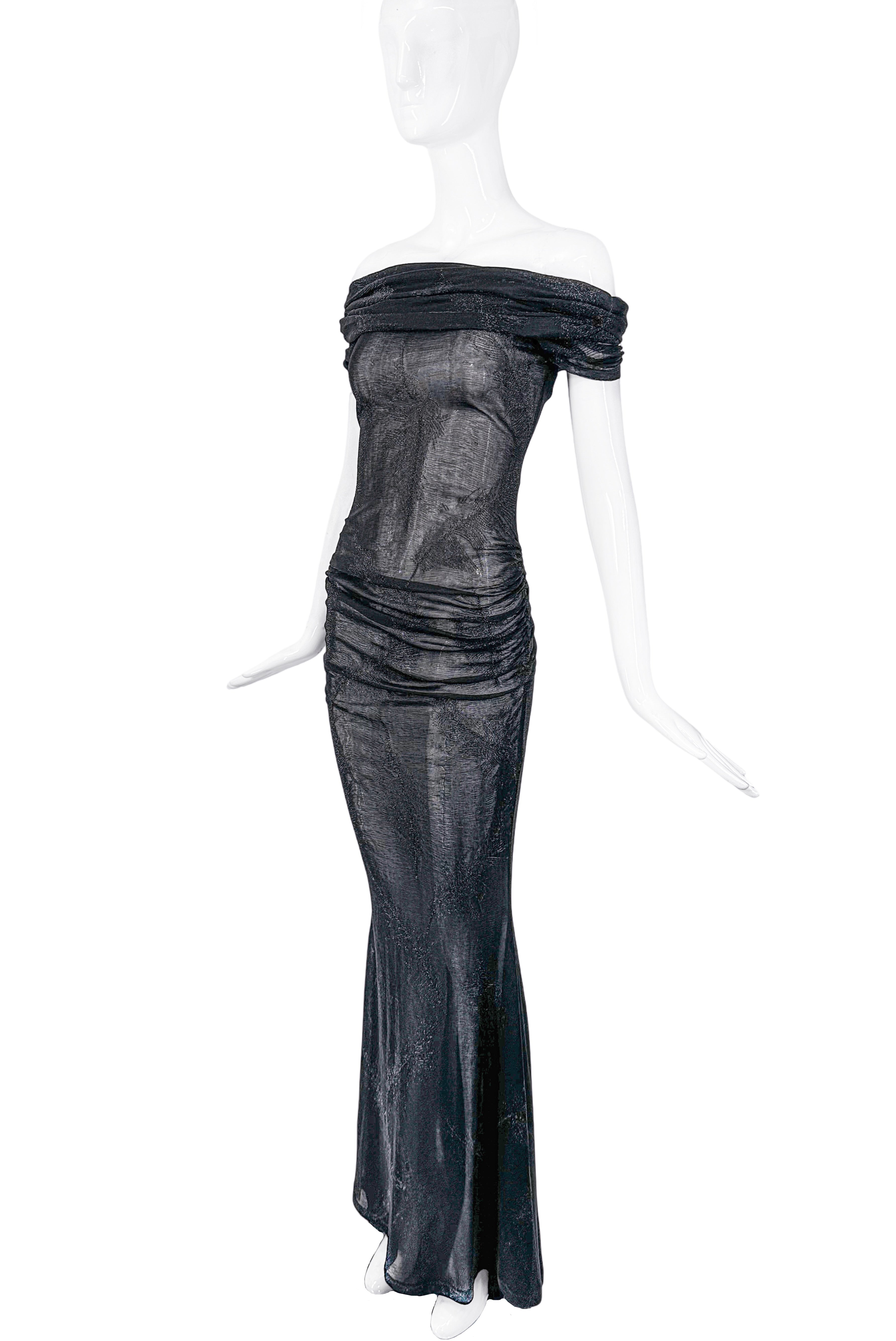 Vintage Black Lurex Glitter Sparkle Off Shoulder Palm Tree Print Body Con Gown Dress