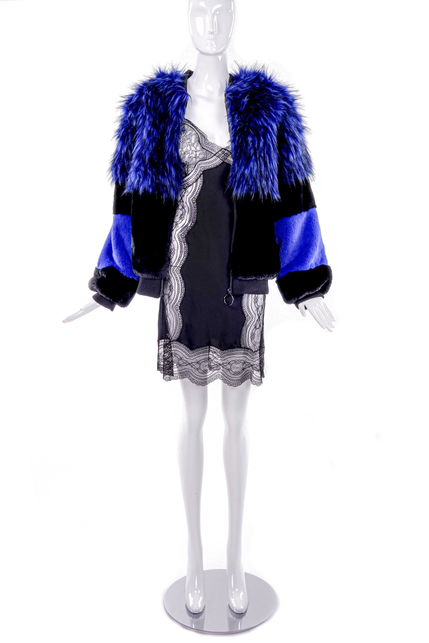 A vintage blue faux fur jacket with black stripe details.