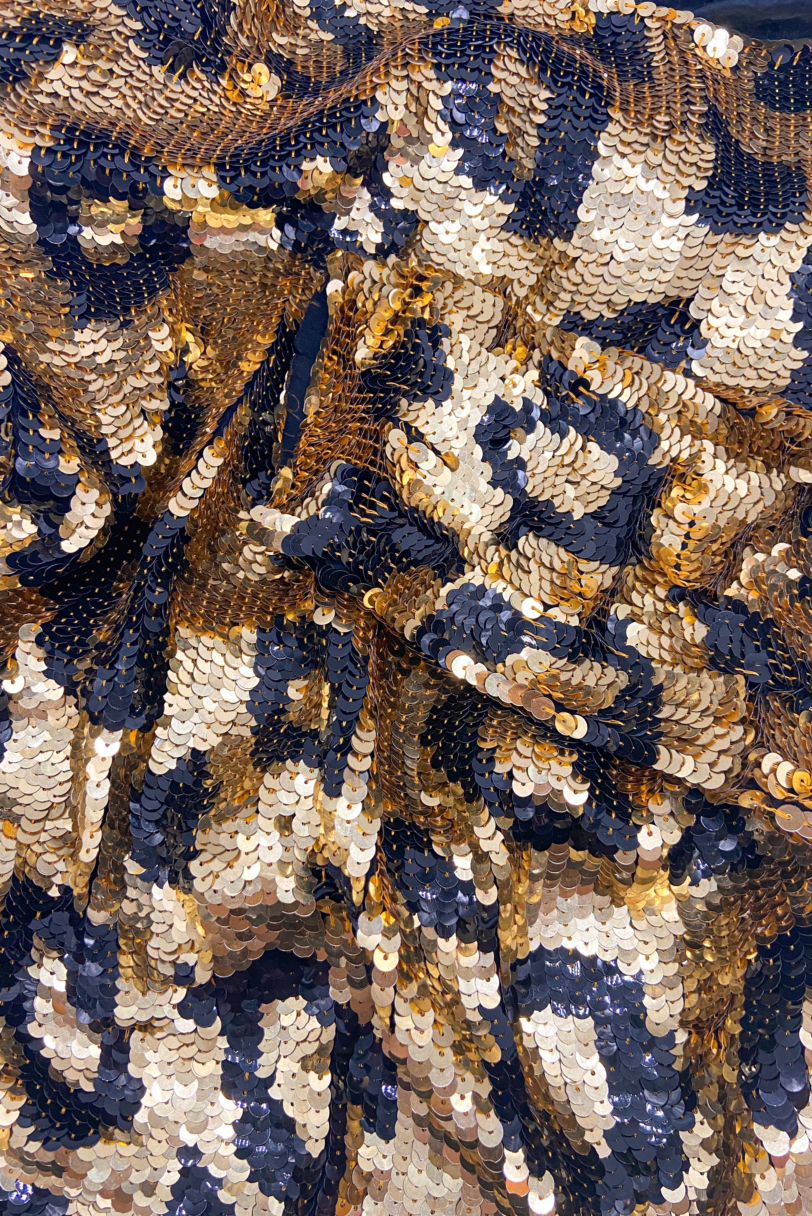 A vintage shining gold sequin off the shoulder long sleeve top with a leopard print pattern created from black sequin. The top is crafted from the highest quality vintage sequins and artisan quality craftsmanship with a Made in India tag. The top can also be worn centered with an oversize boat neckline.