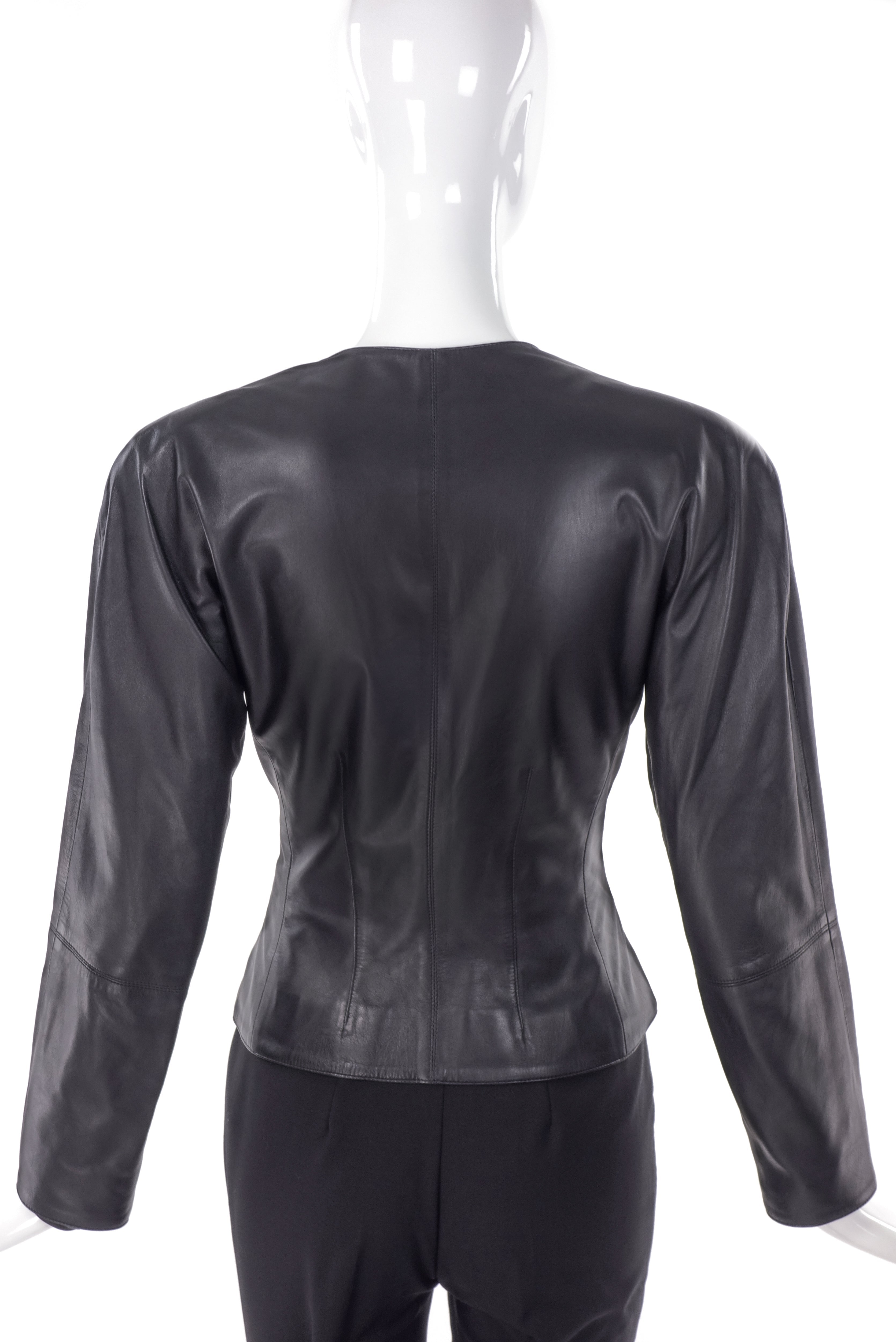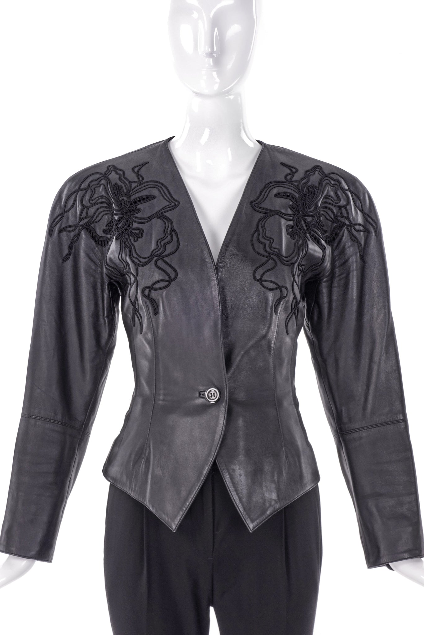 A Vintage Loewe black leather tailored jacket with a strong 80's shoulder cut. The waist of the jacket is a fitted with a single button closure to give a slight peplum detail. The jacket has embroidered lace floral details at the shoulders. Circa 1980s.