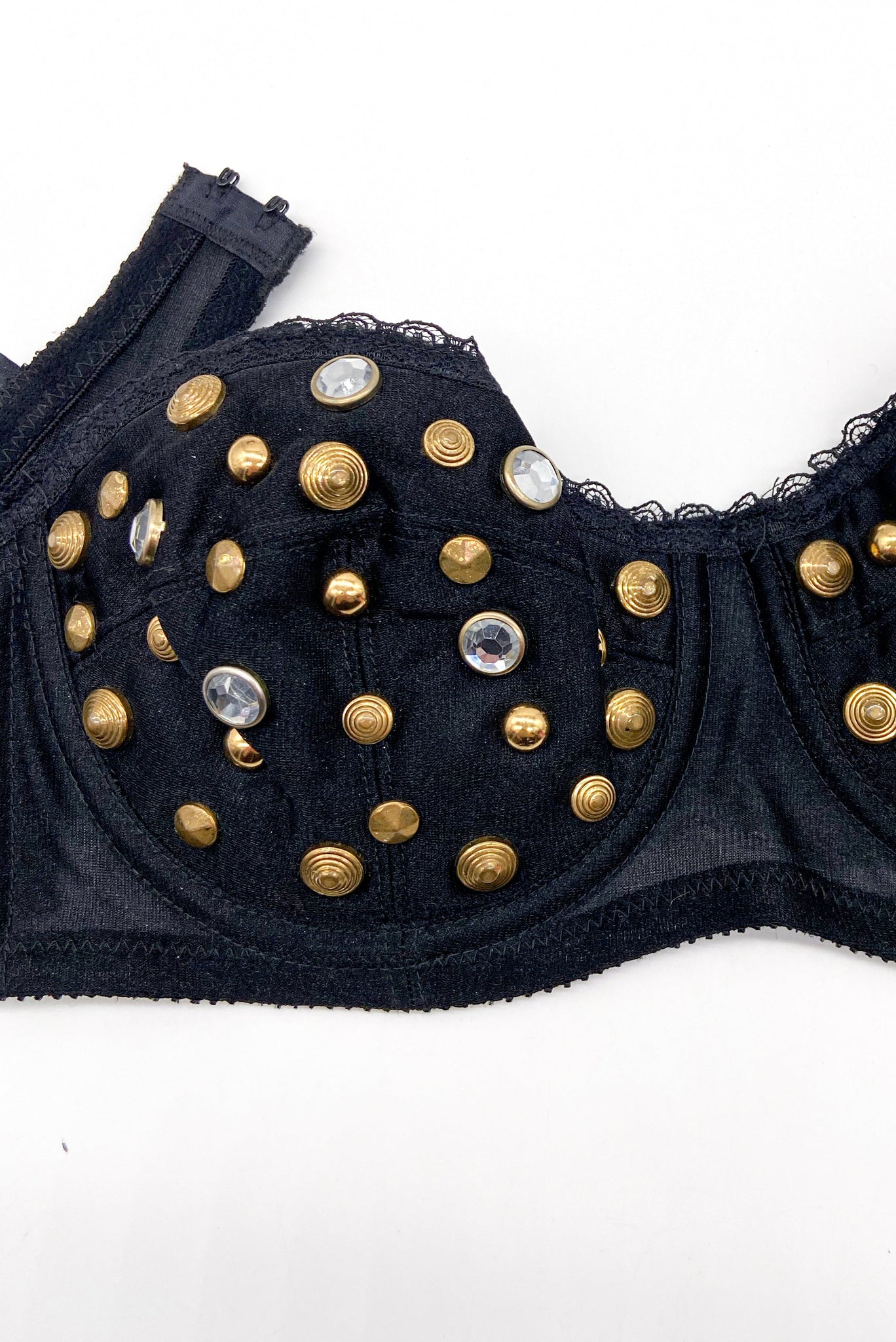 A vintage black mesh strapless bralet with brassy gold tone spherical studs intermixed with faceted clear crystals. The top of the bra has delicate lace detailing. The bralet is very reminscent of Madonna's iconic 1980's and early 1990's stage costumes that have today become iconified in pop history.