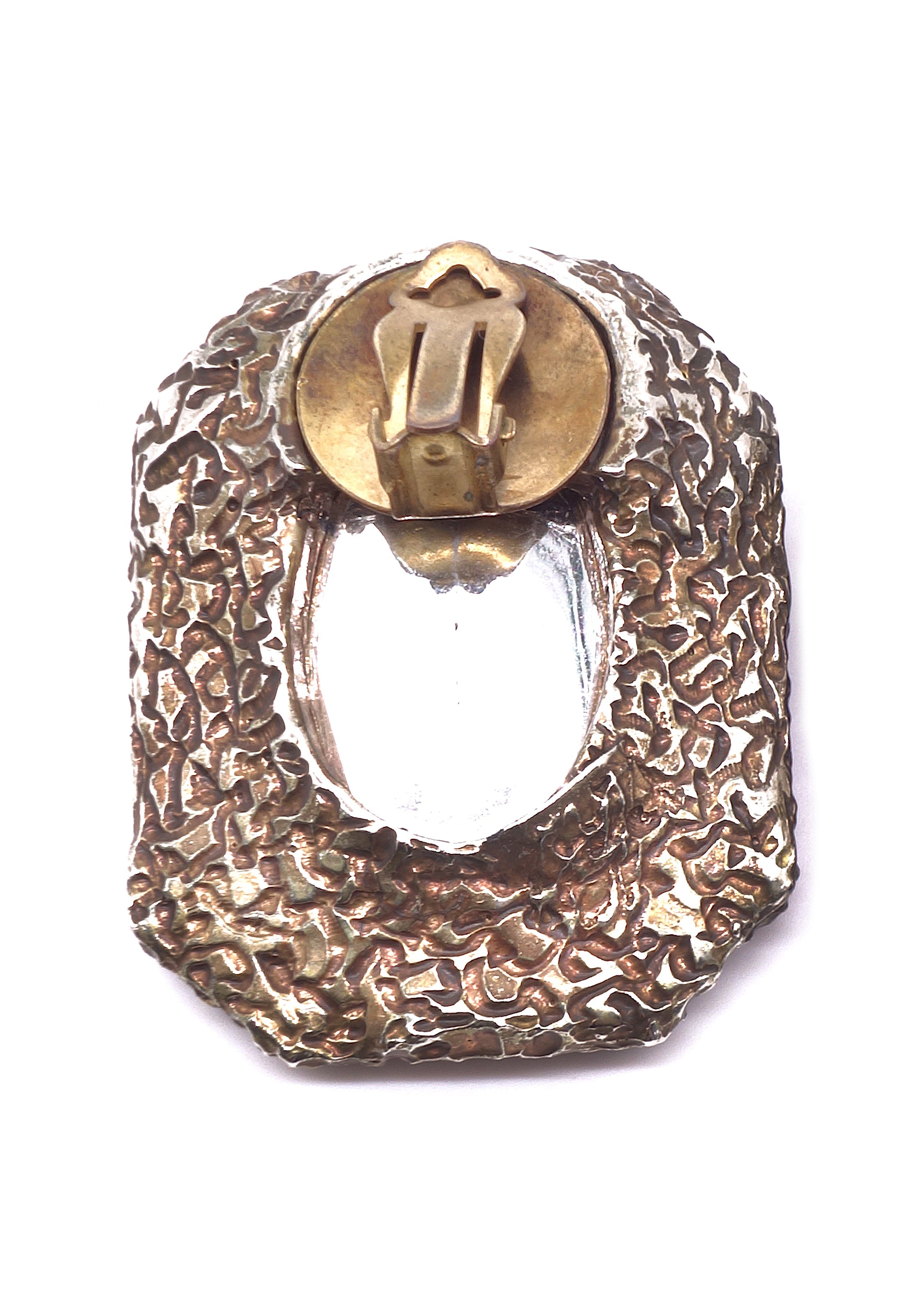 A pair of vintage earrings with huge costume rubies encased in an antique gold toned hammered setting. Earrings are clip-on.