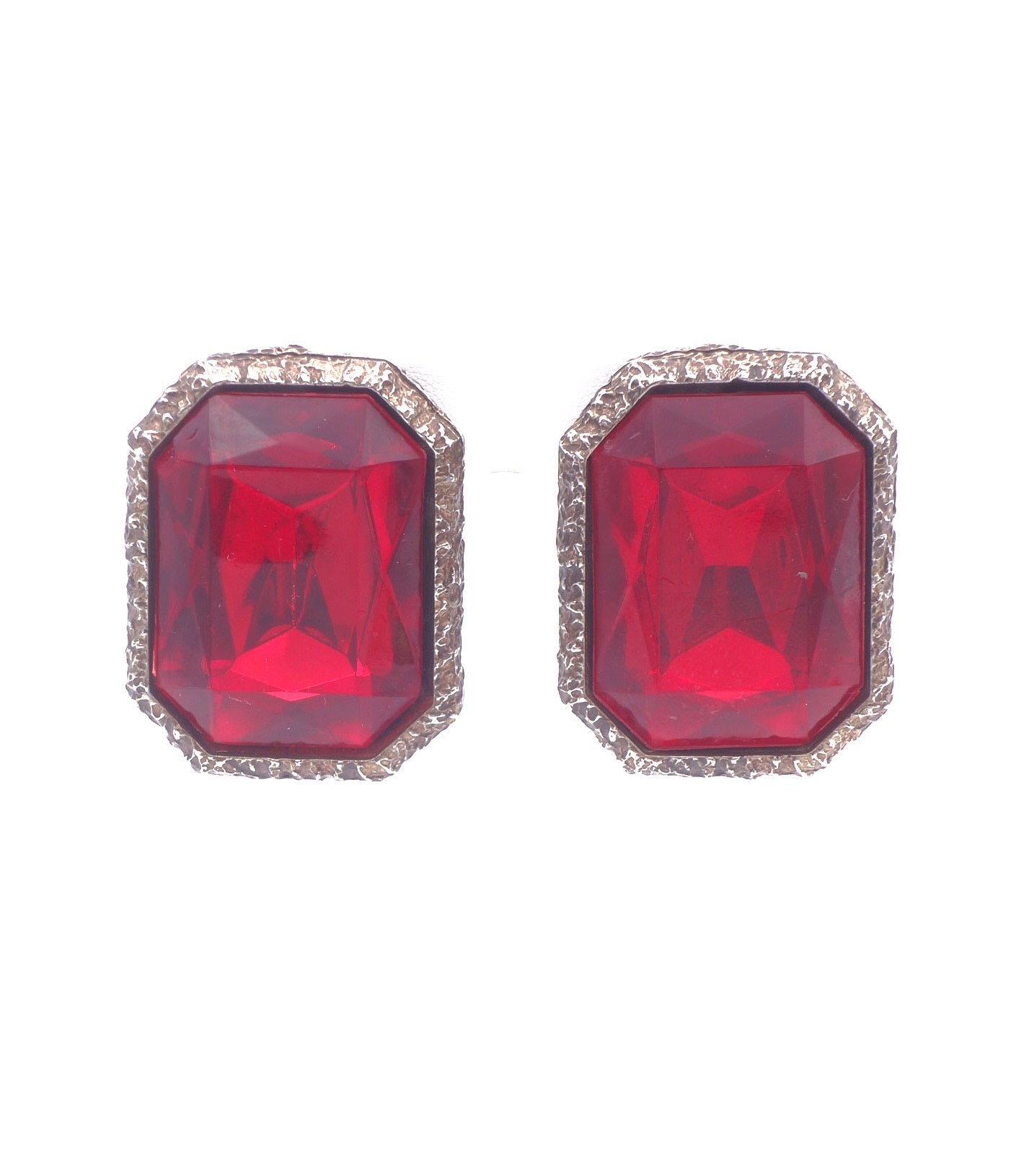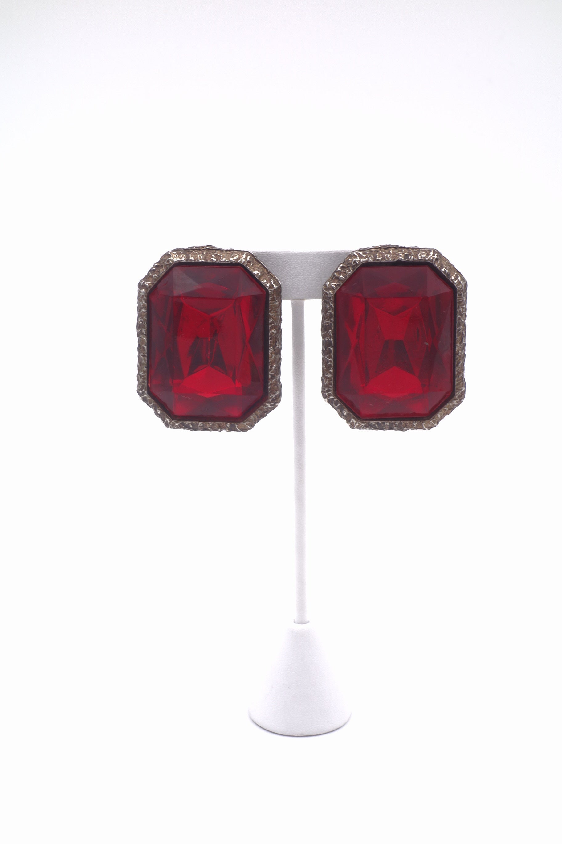 Vintage Gold Ruby Red Huge Square Costume Clip-On Earring
