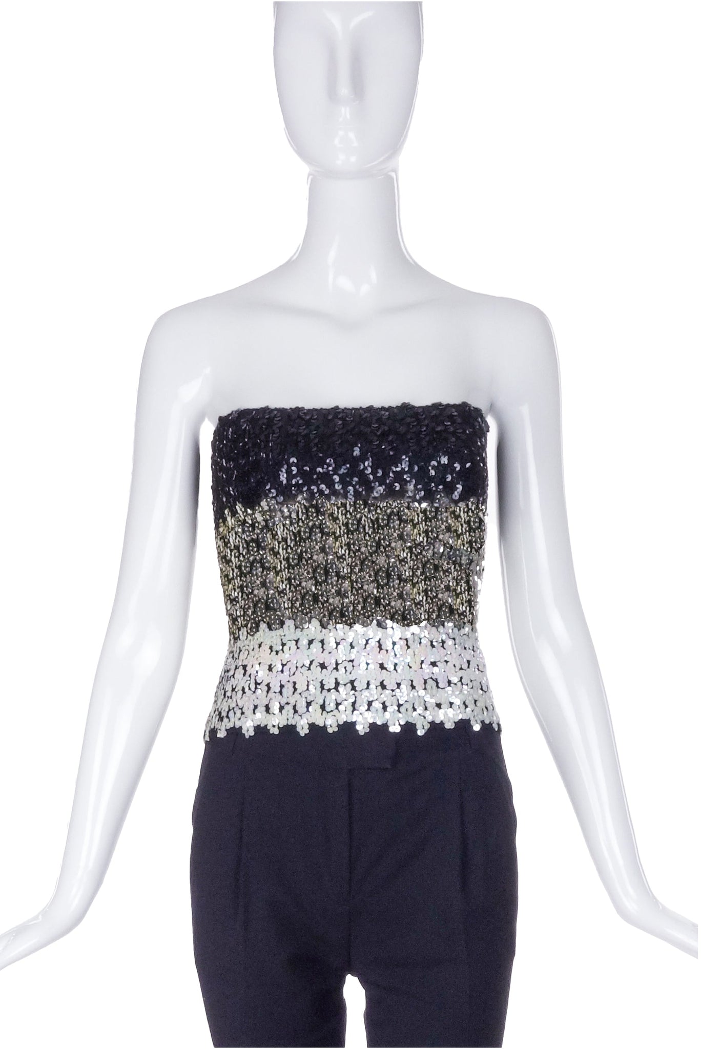 A vintage sequin tube top with three horizontal lines of black, silver and white sequin. The top has an elastic quality to the fabric composition creating a fit for a variety of sizes.