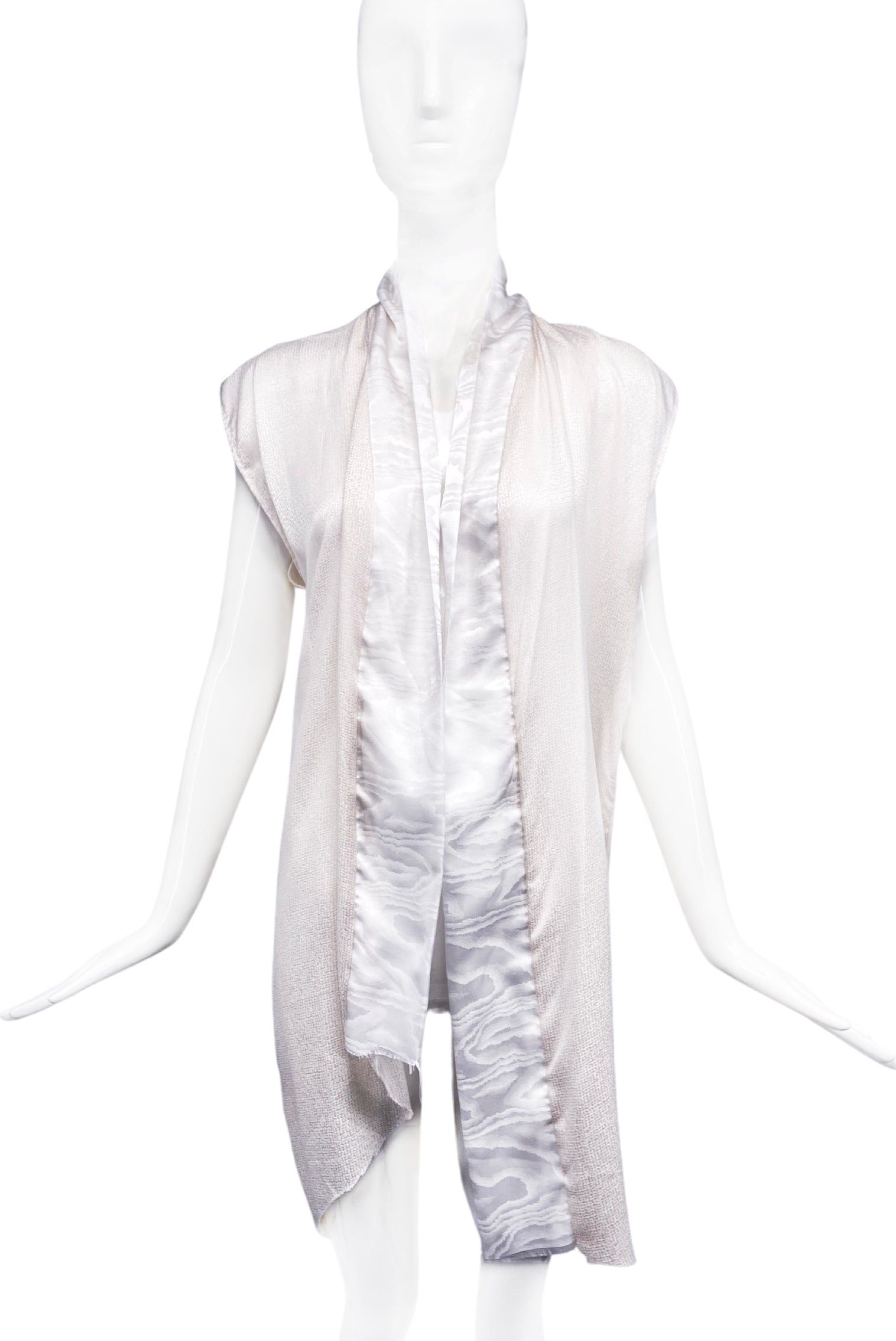 A vintage white silk deconstructed sleeveless kimono style jacket vest composed of hammered ivory silk and jacquard white silk.