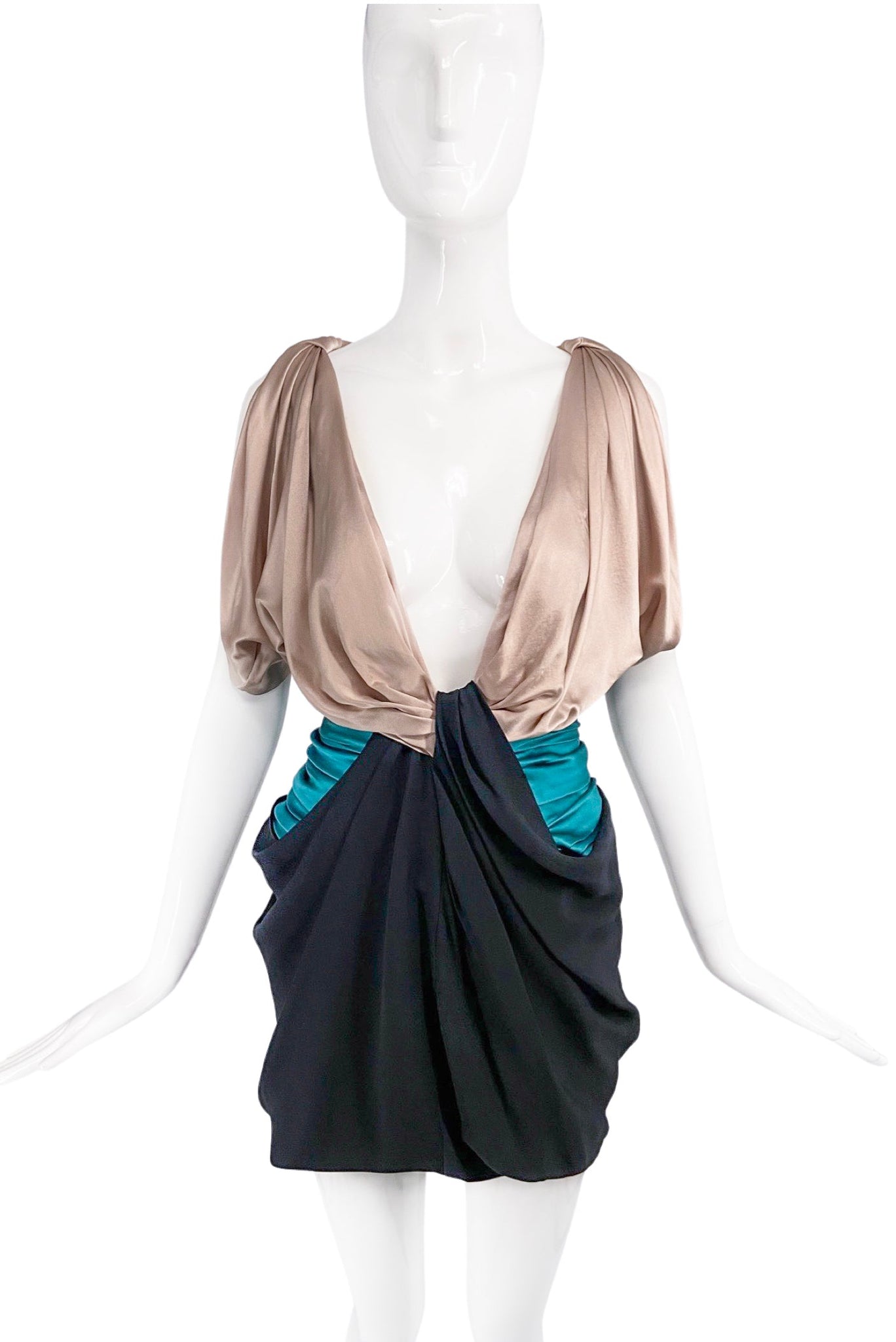 Vionnet Color Block Tan, Green and Black Satin Mini Dress FW2010