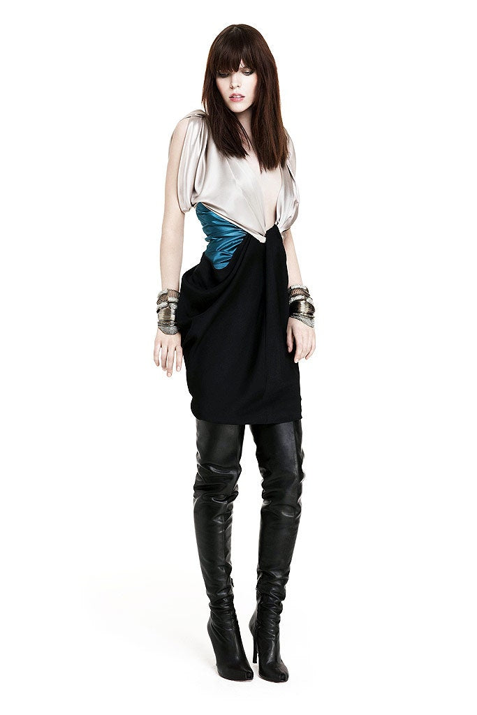 A Vionnet color block tan and black satin mini dress with expertly draped details throughout the dress and an emerald green insert at the waistline. The dress has a plunging neckline and draped sleeves. From the Vionnet by Rodolfo Paglialunga Fall / Winter 2010 ready-to-wear collection.