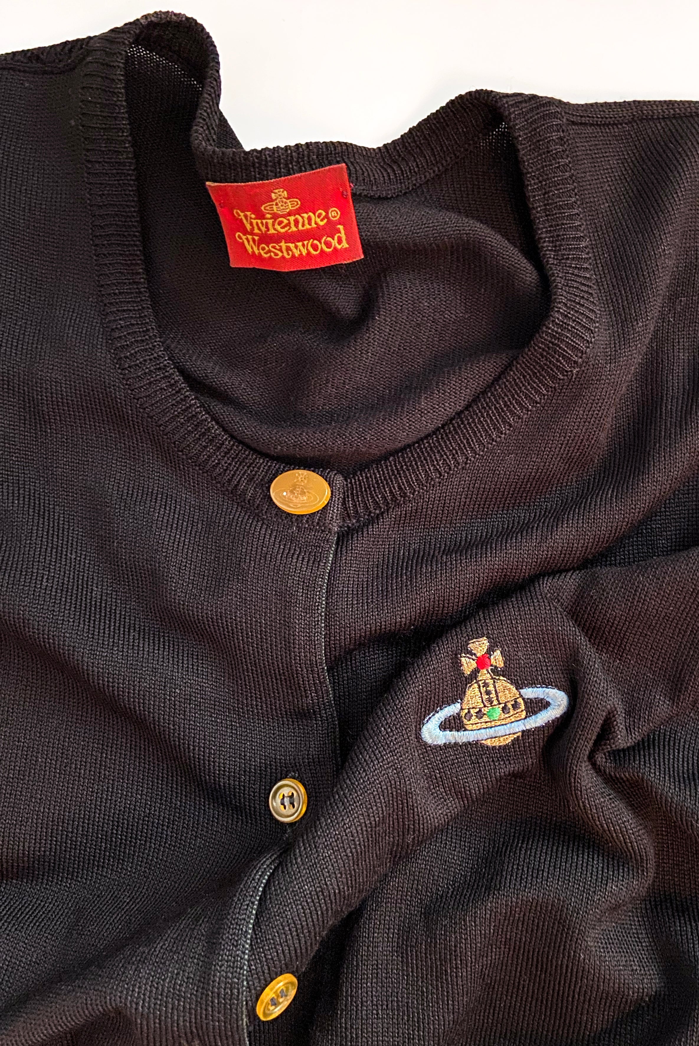 A black wool, classic Vivienne Westwood cardigan with an oversize Westwood logo patch at the right breast. The cardigan has an oval logo button at the neckline with matching tan buttons down the front of the cardigan. The cardigan is 100% wool.