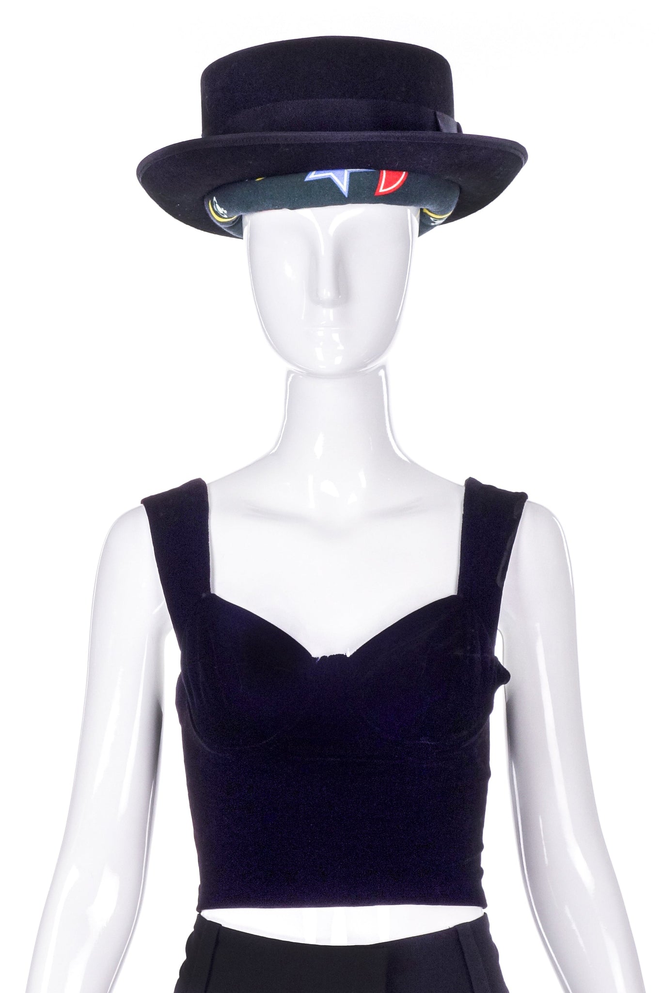 A Vivienne Westwood exaggerated flattened top hat with a printed exaggerated inner band that can either be placed outside with its geometric pattern or hidden inside of the hat. The inner brim detail of the hat has the Vivienne Westwood World's End Label. As seen on Look 22 of the Fall / Winter 2014 Vivienne Westwood Label runway presentation.