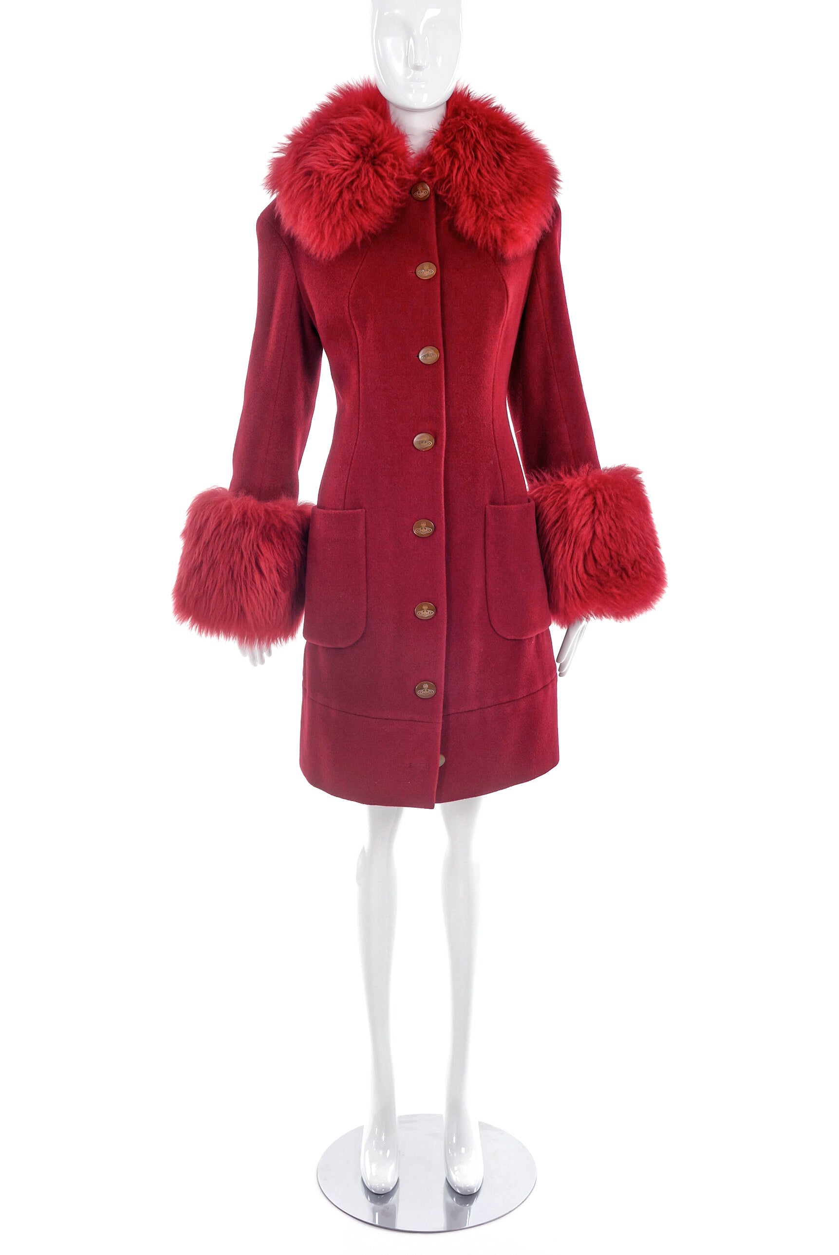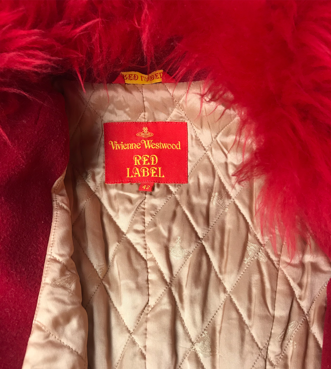 The iconic red Vivienne Westwood "Poodle" coat. The coat has an oversized shawl red faux fur collar with matching sleeve oversized fur cuffs. The coat has brown buttons down the down front of the coat with the Vivienne Westwood orb and cross logo.
