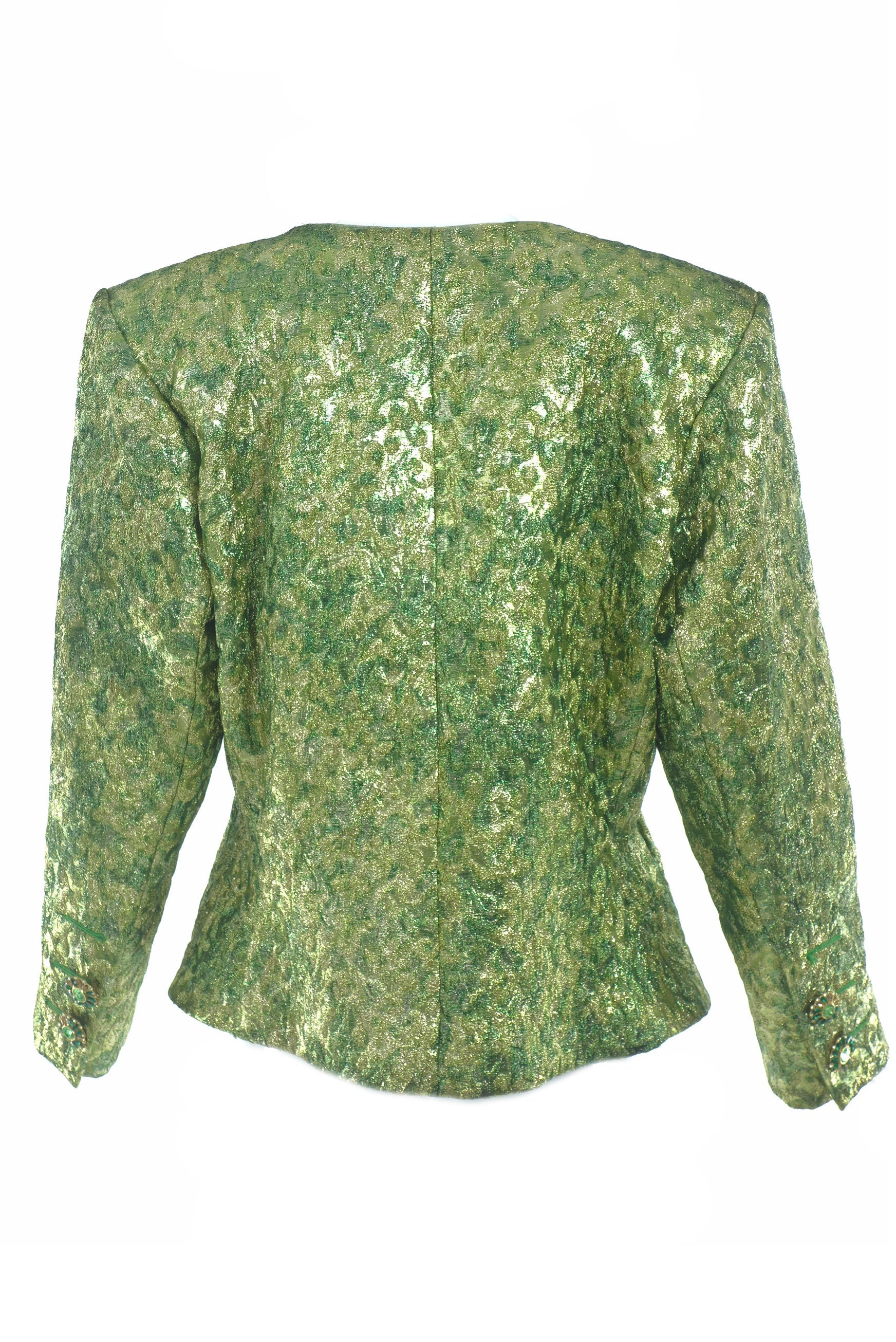 Yves Saint Laurent Rive Gauche metallic jacquard green and gold lurex evening jacket with strong 1980's couture shoulders. Beautiful emerald crystal buttons accentuate the luxury of the jacket.