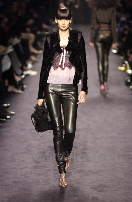 An Yves Saint Laurent by Tom Ford pale baby pink chiffon underlay with a black lace overlay and interwoven ribbon "baby doll" style camisole that ties into a sweet bow. From the Fall / Winter 2003 runway collection for Yves Saint Laurent by Tom Ford Look 18.