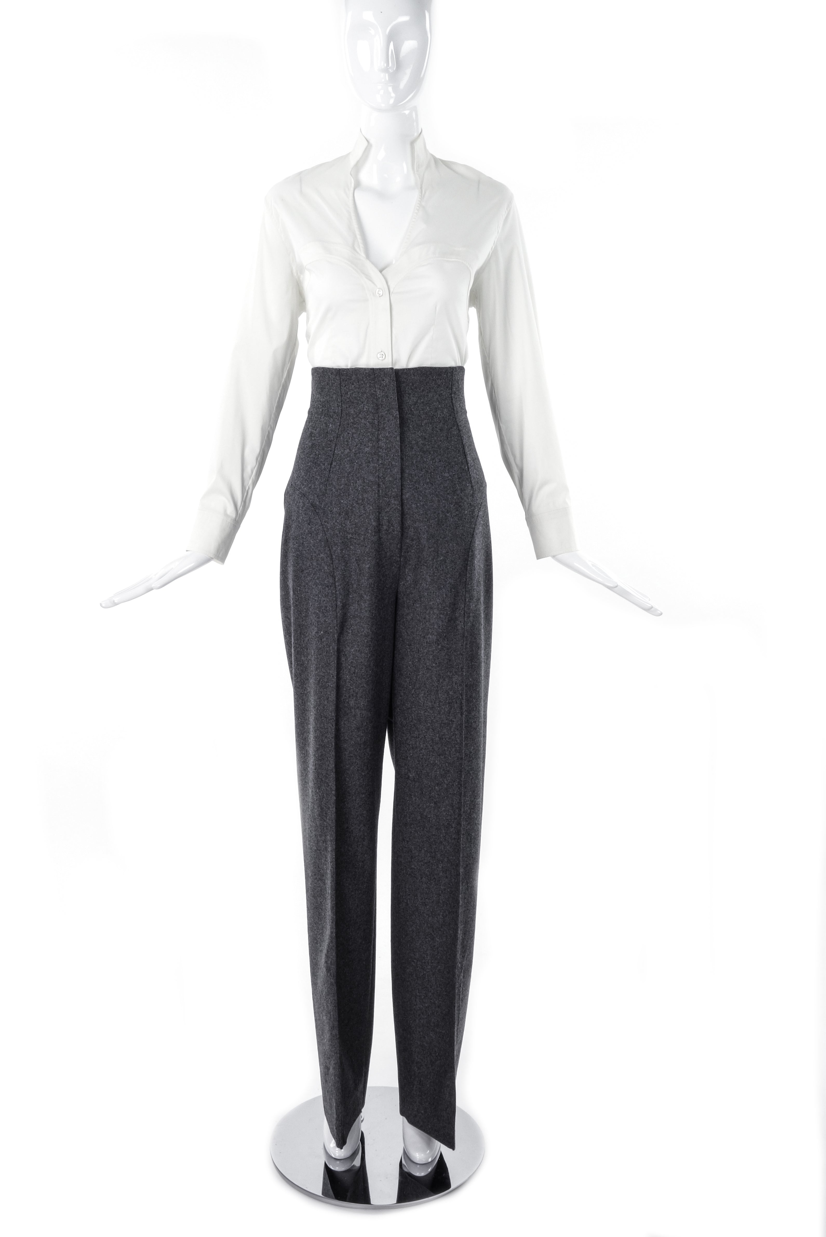 Vintage Yves Saint Laurent grey wool menswear inspired fitted trouser. These trouser's are menswear inspired with two pleats on the front of the trouser with a sharp crease down the front of the pant legs to give a sleek, streamlined look.