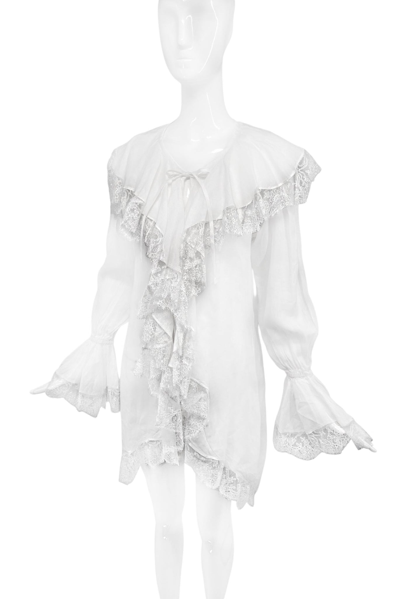 A vintage Yves Saint Laurent white cotton "Louis XVI" style ruffle and lace long sleeve blouse. The blouse has bell style ruffle sleeve cuffs.