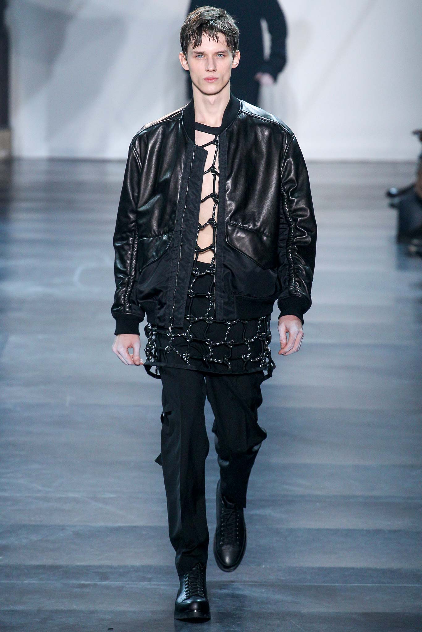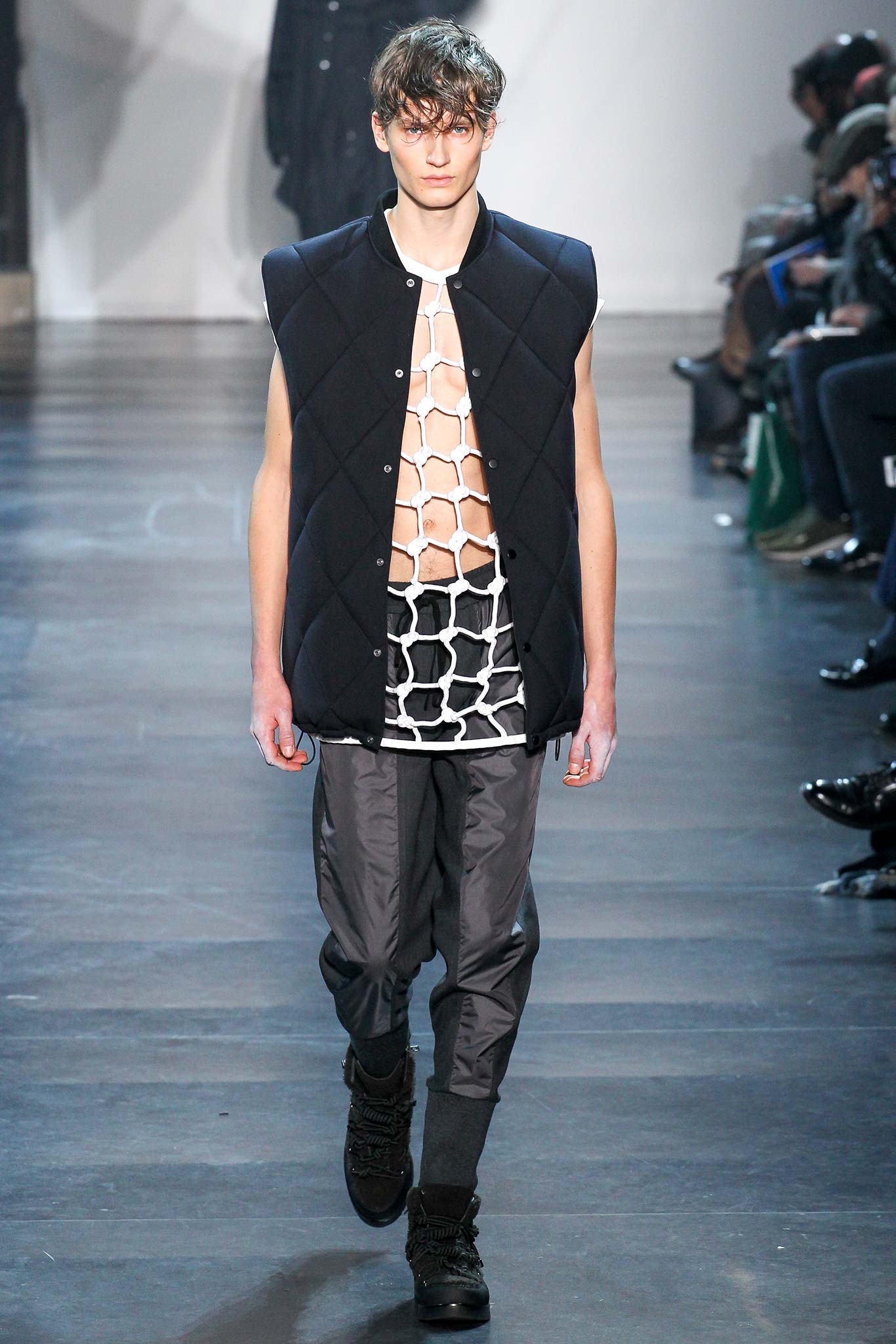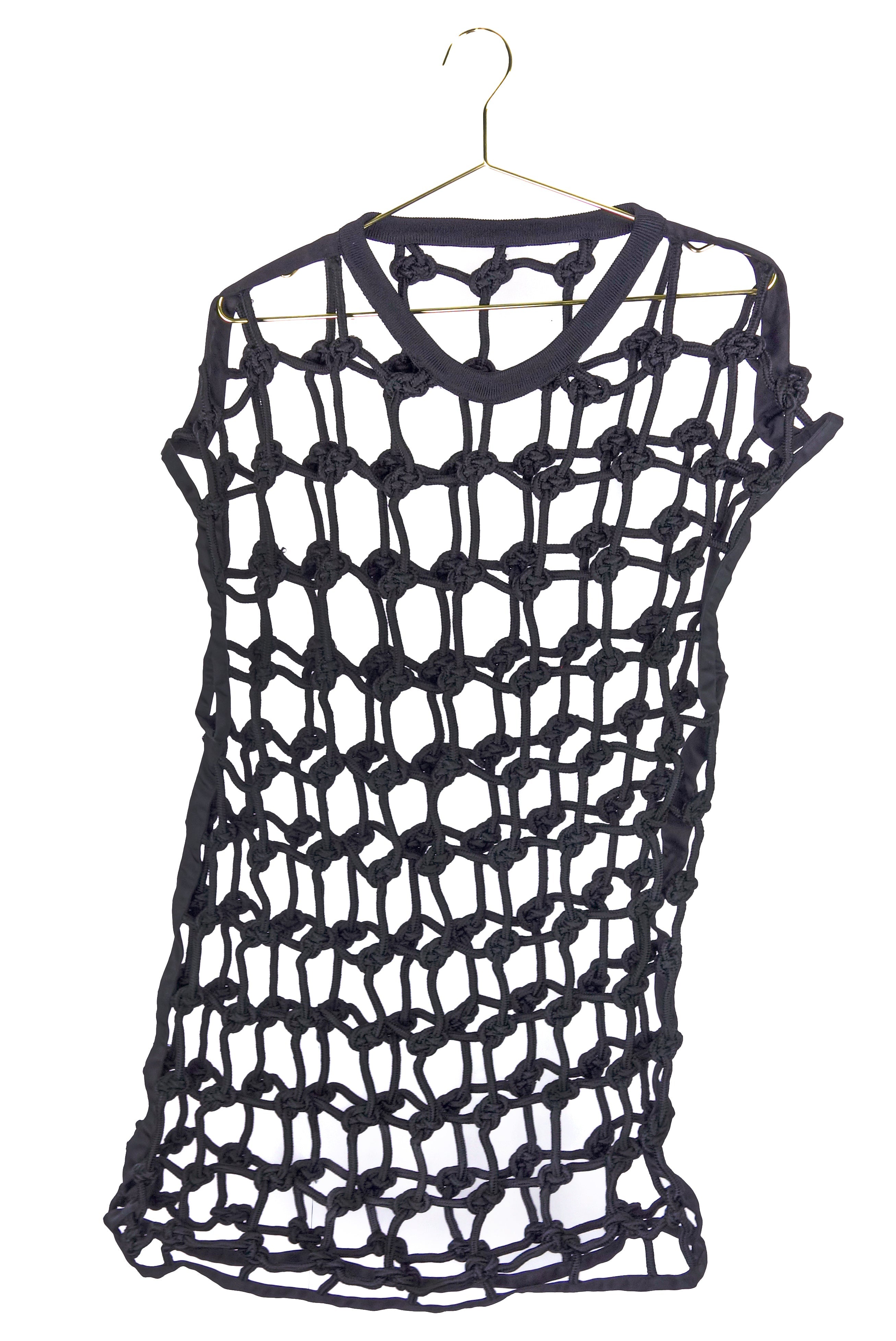 A 3.1 Phillip Lim black tunic style top created from a thick "climbing" top and knotted to create an exaggerated woven textile. The tunic has cotton detailing along the crew style neckline and black cotton at the shoulders and at the hem of the garment to create a finished look. From the 3.1 Phillip Lim Menswear Fall / Winter 2015 runway collection.