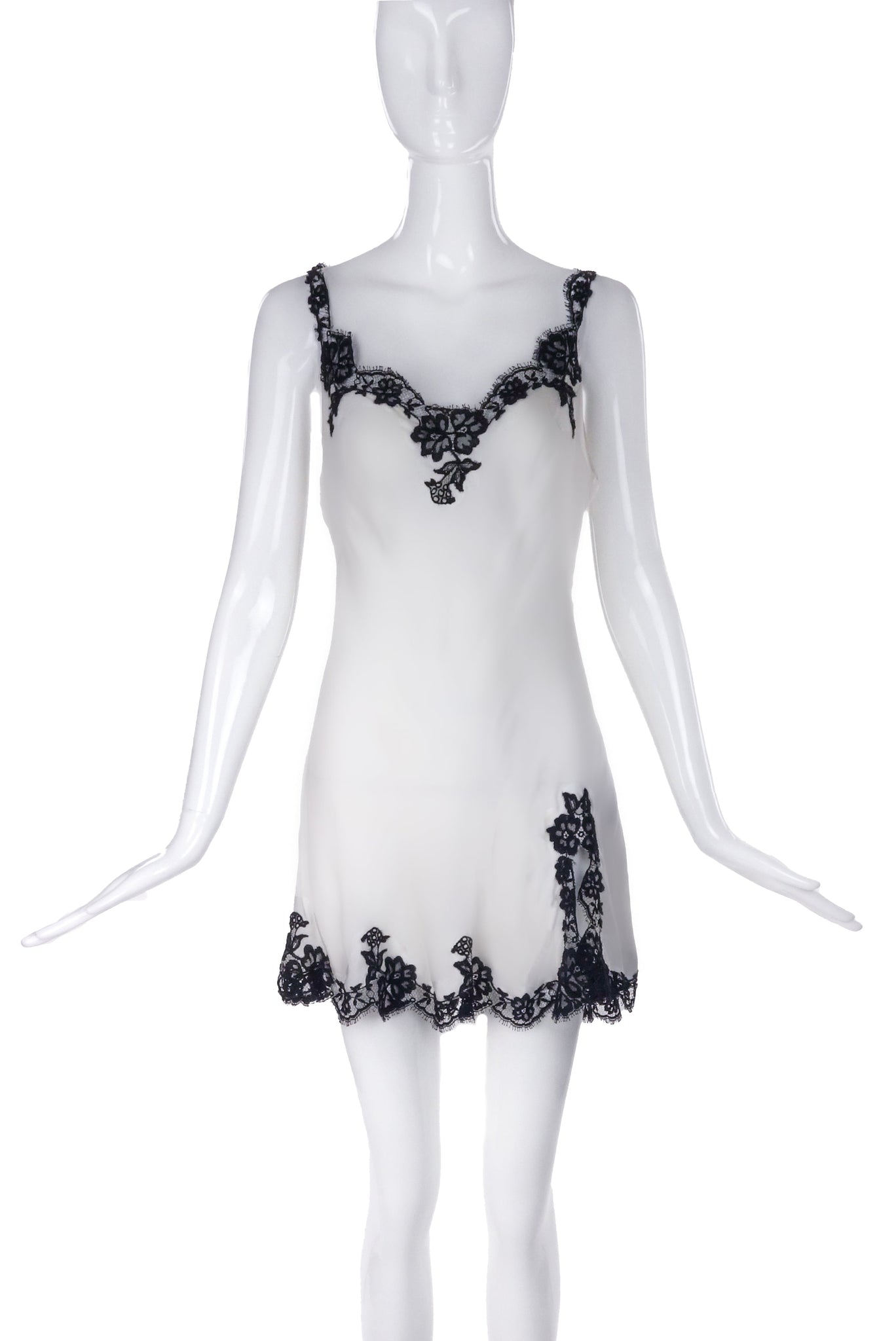 An Agent Provocateur white satin mini negligee with a rounded heart shaped neckline. The neckline of the slip dress is framed in a contrasting black floral lace that transitions into the straps of the dress. The hem of the dress has a slit on the left side and has black floral lace in a wave like pattern to finish the hem.