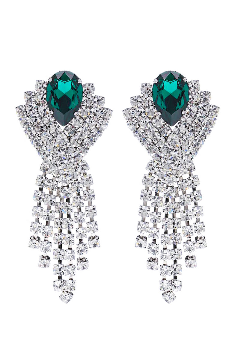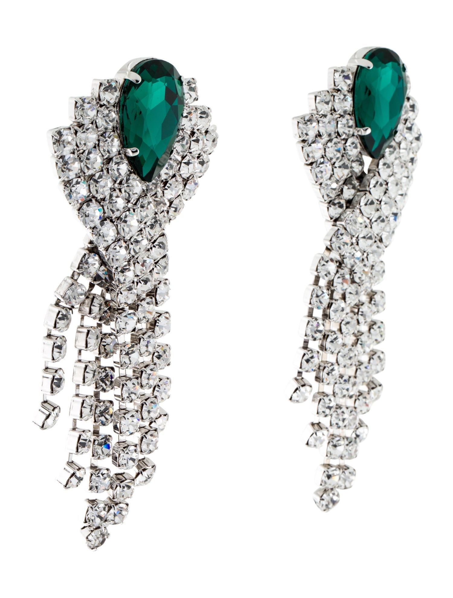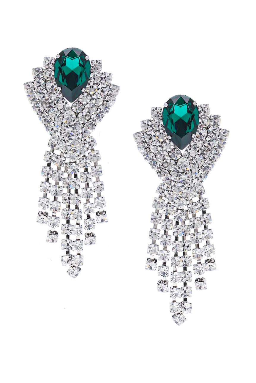 A pair of Alessandra Rich geometric crystal rhinestone and large emerald center stone with sparking crystal fringe cascading down from the emerald center stone.