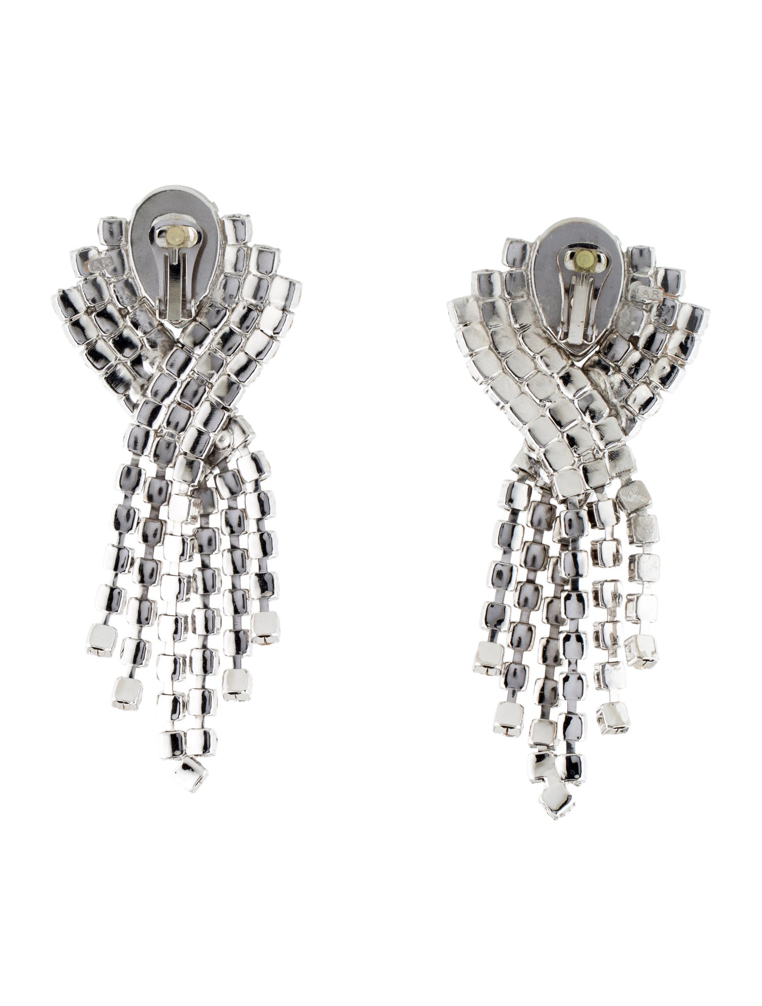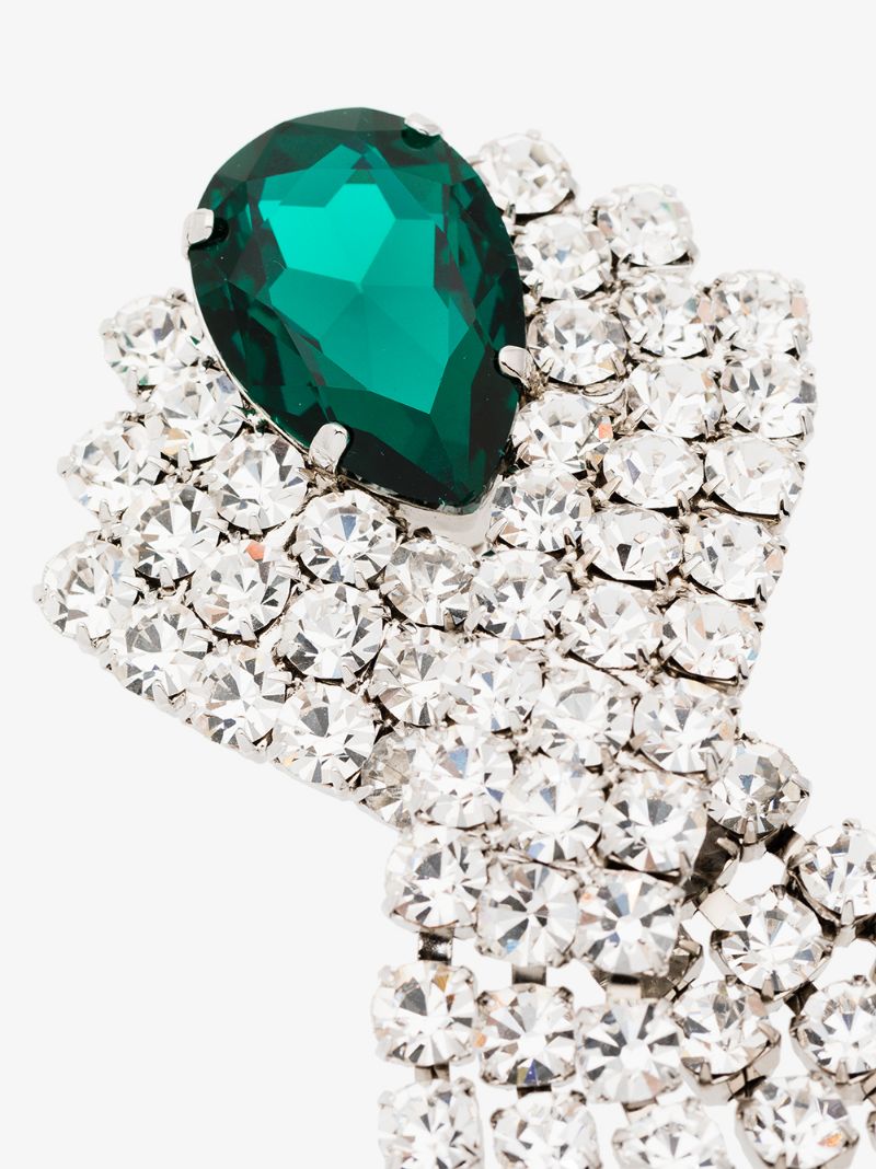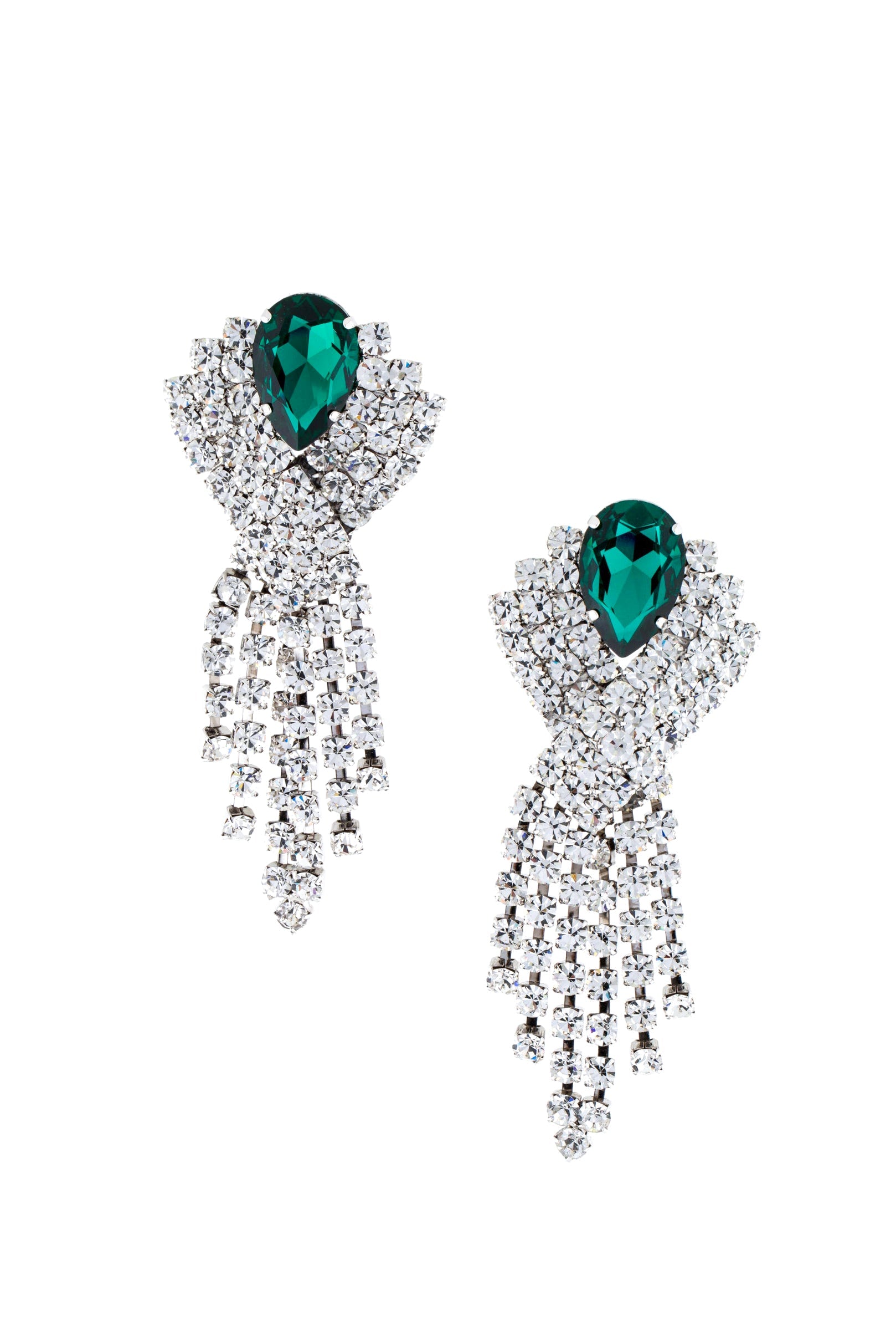 A pair of Alessandra Rich geometric crystal rhinestone and large emerald center stone with sparking crystal fringe cascading down from the emerald center stone.