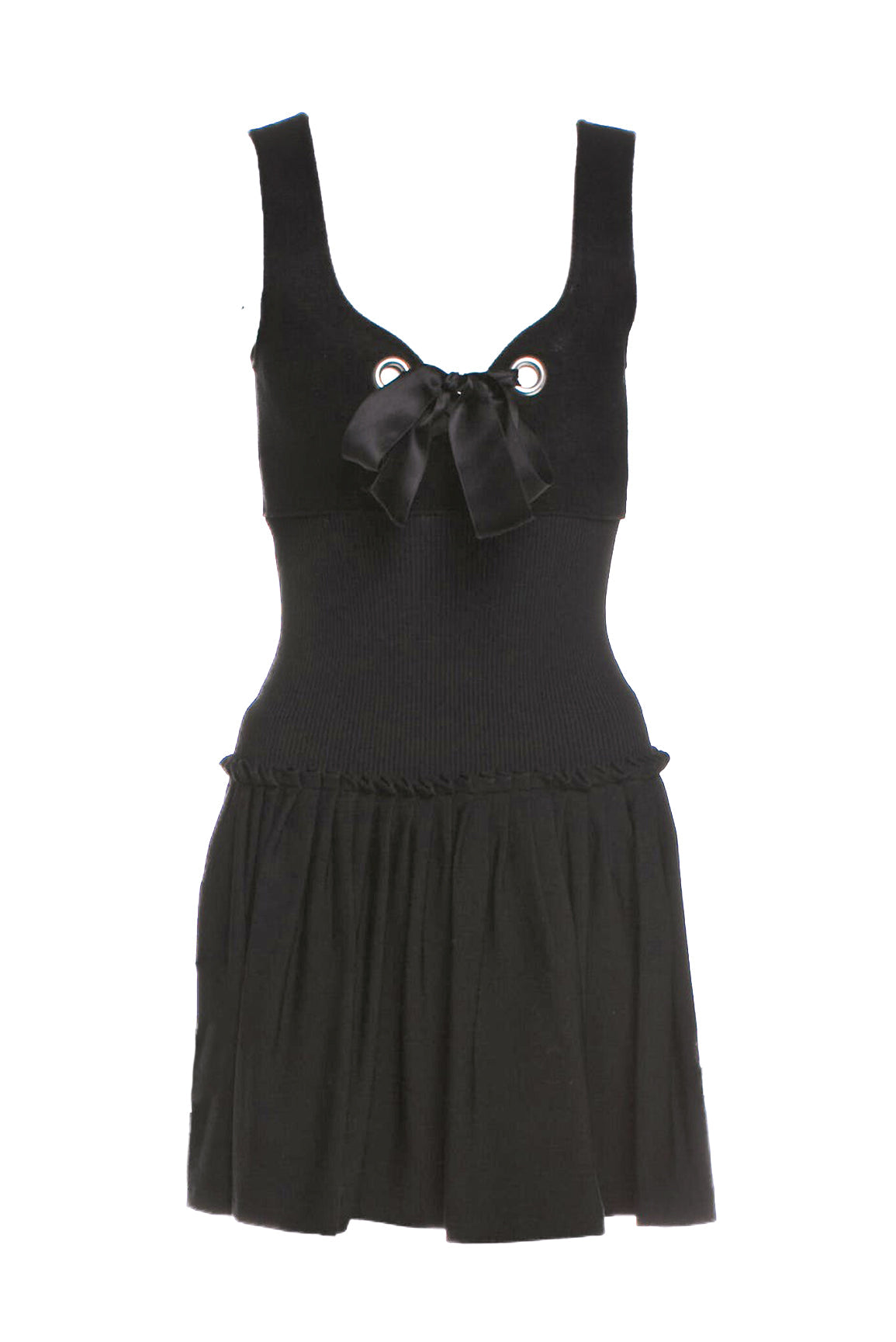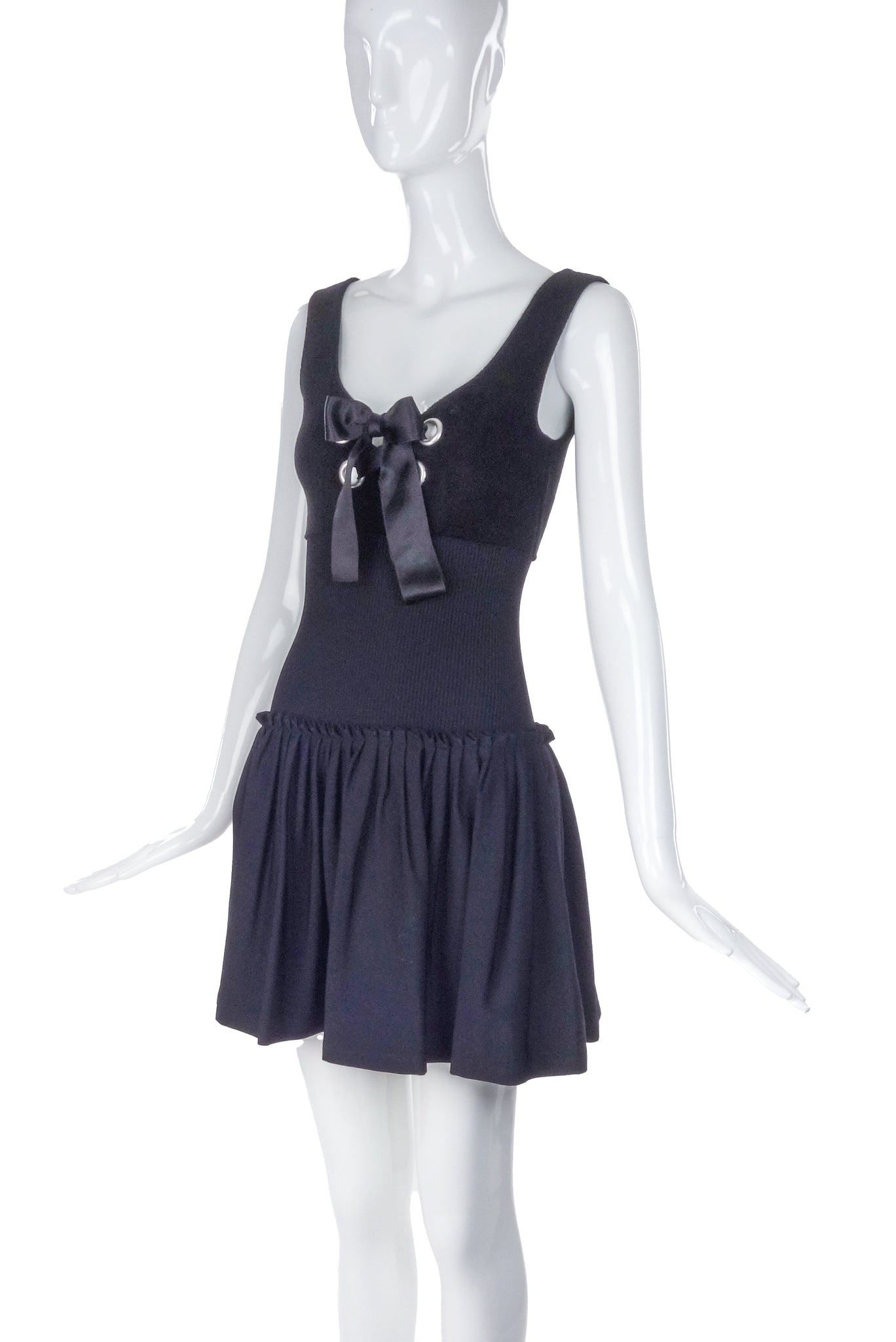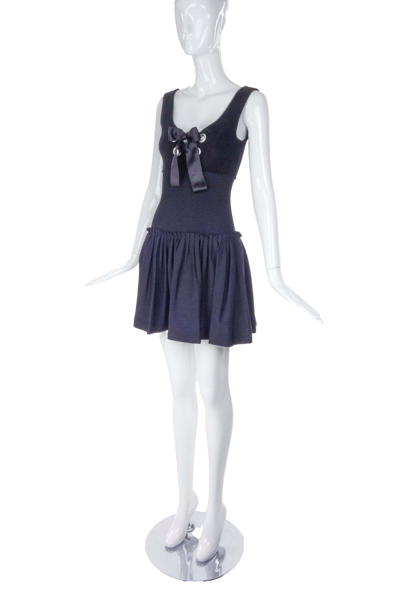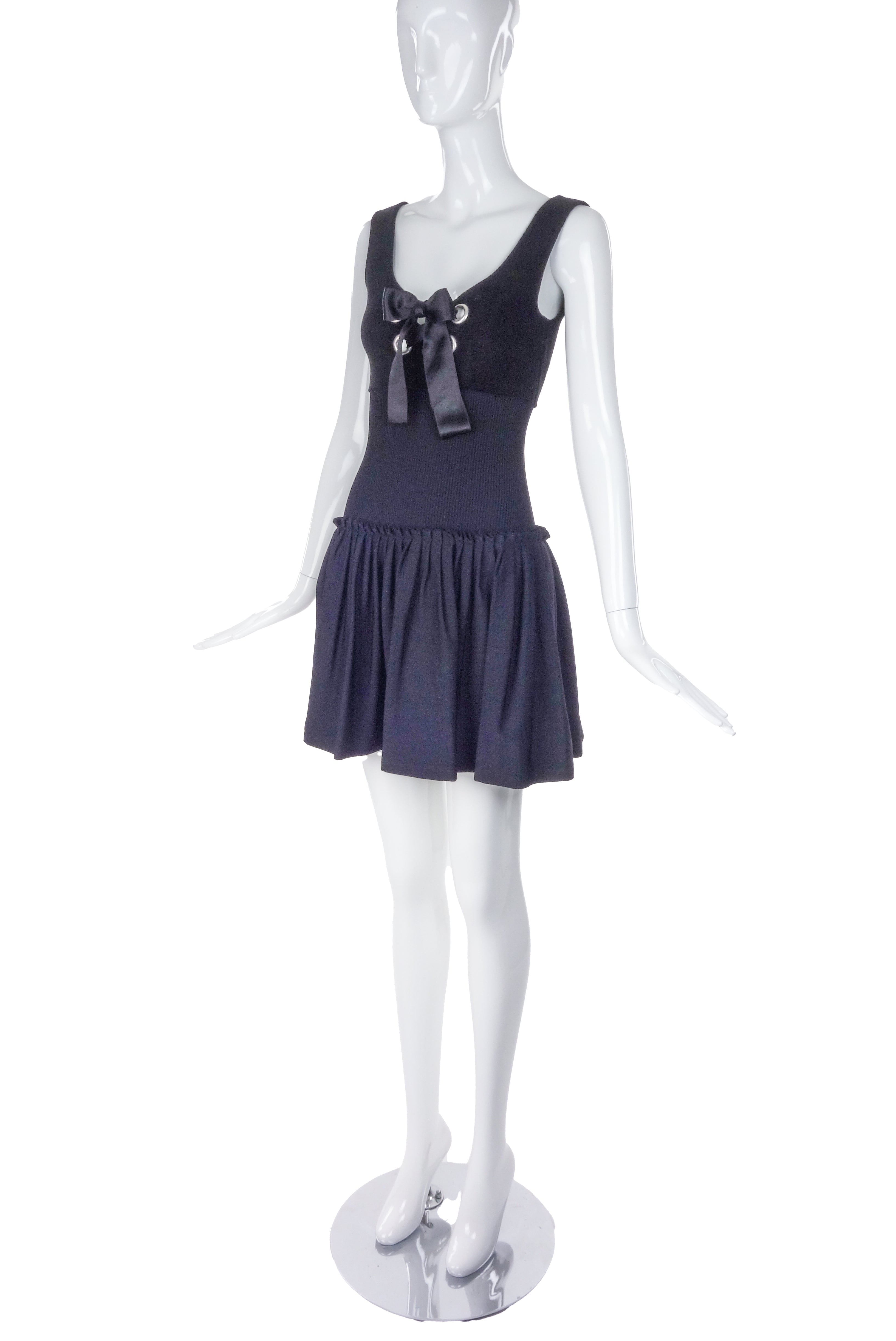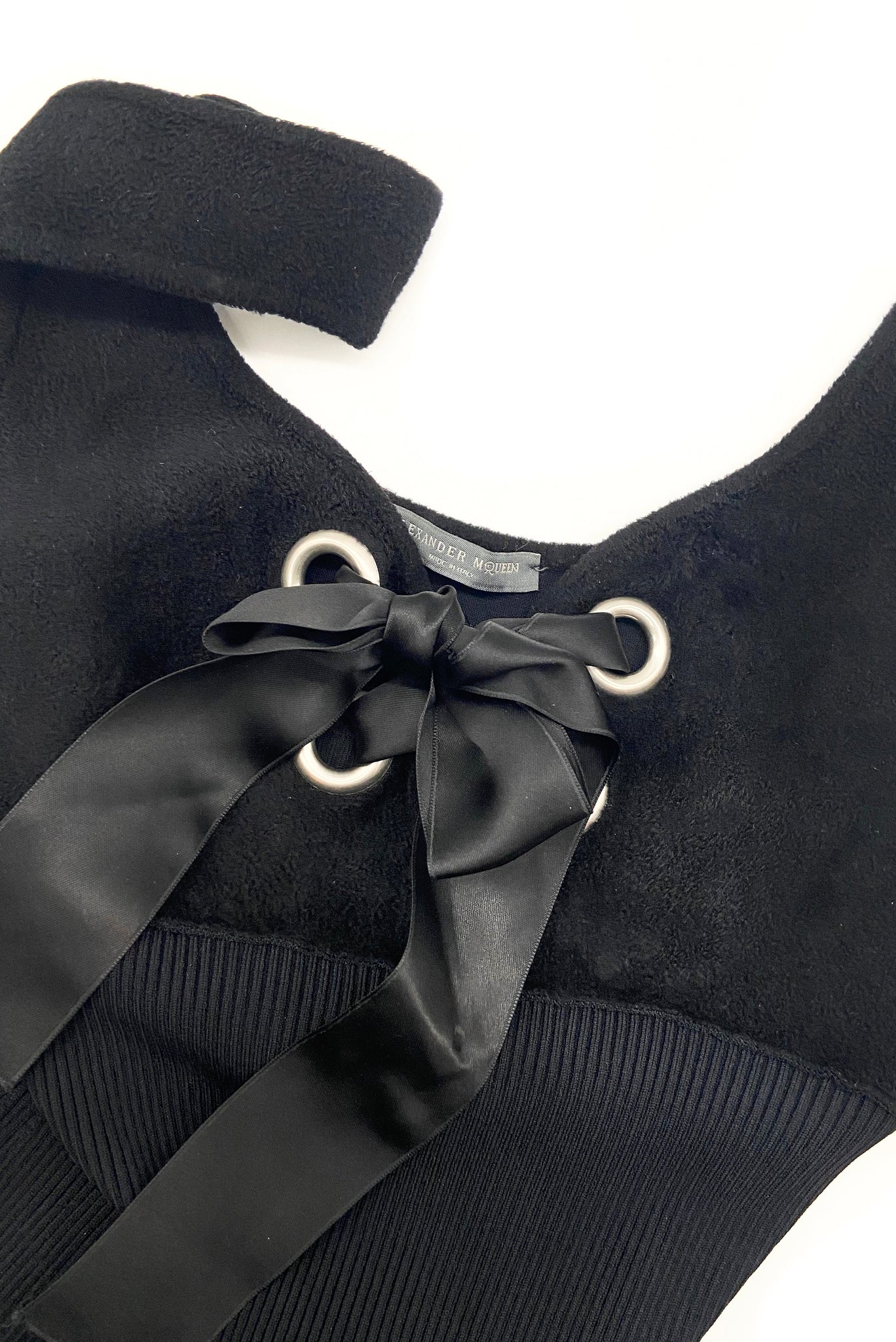 Alexander McQueen Black Velveteen Bustier Fit and Flare "Milk Maid" dress with Silver Grommet and Satin Bow detail