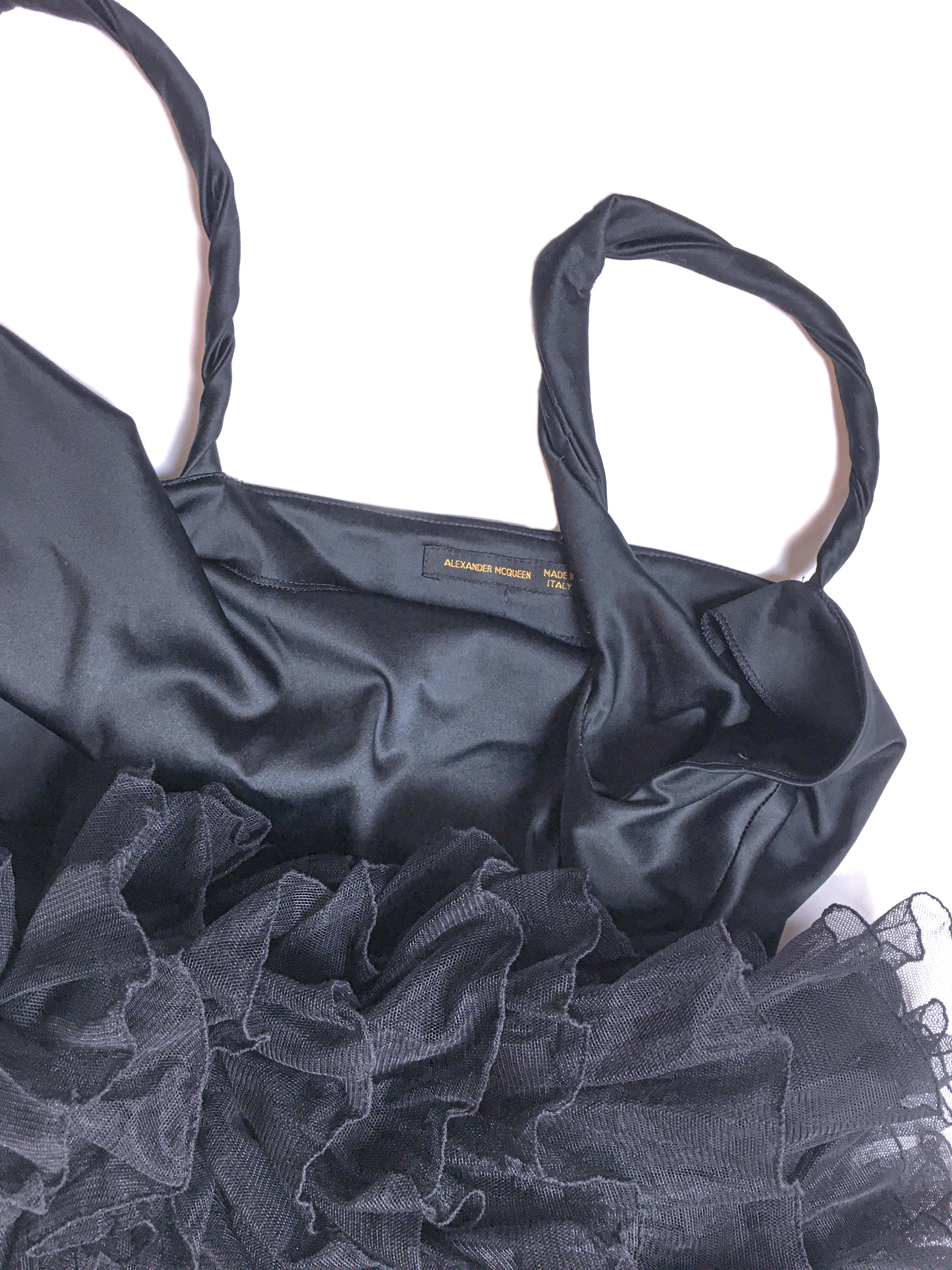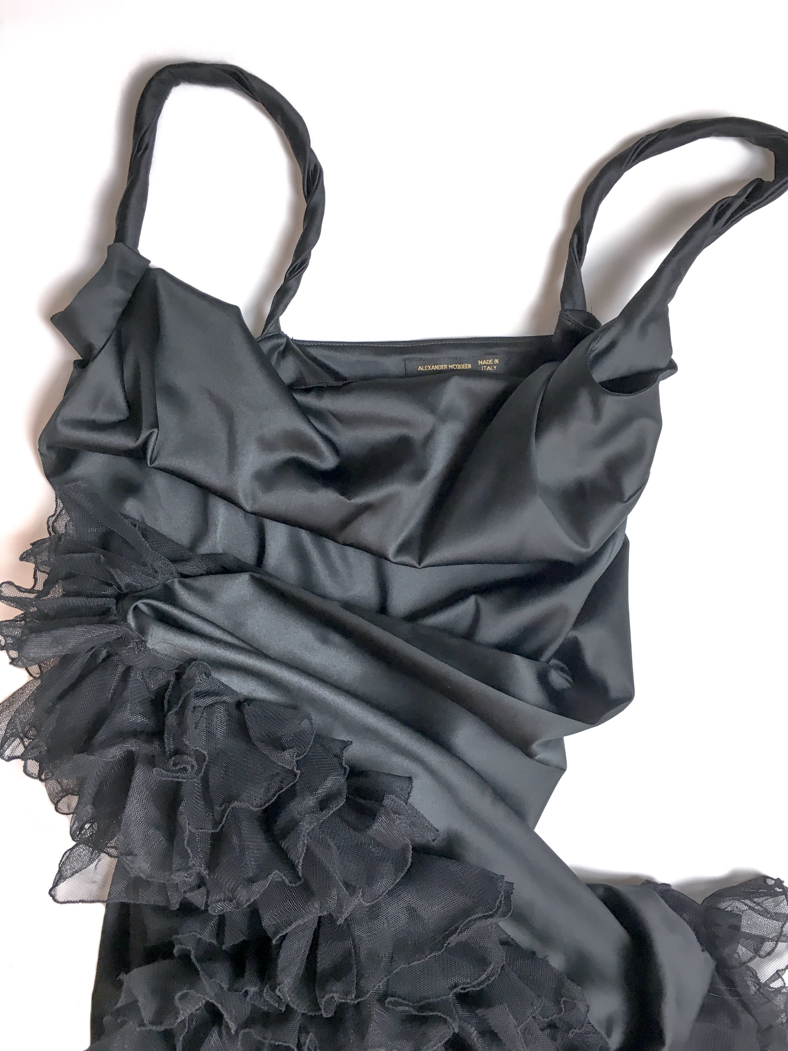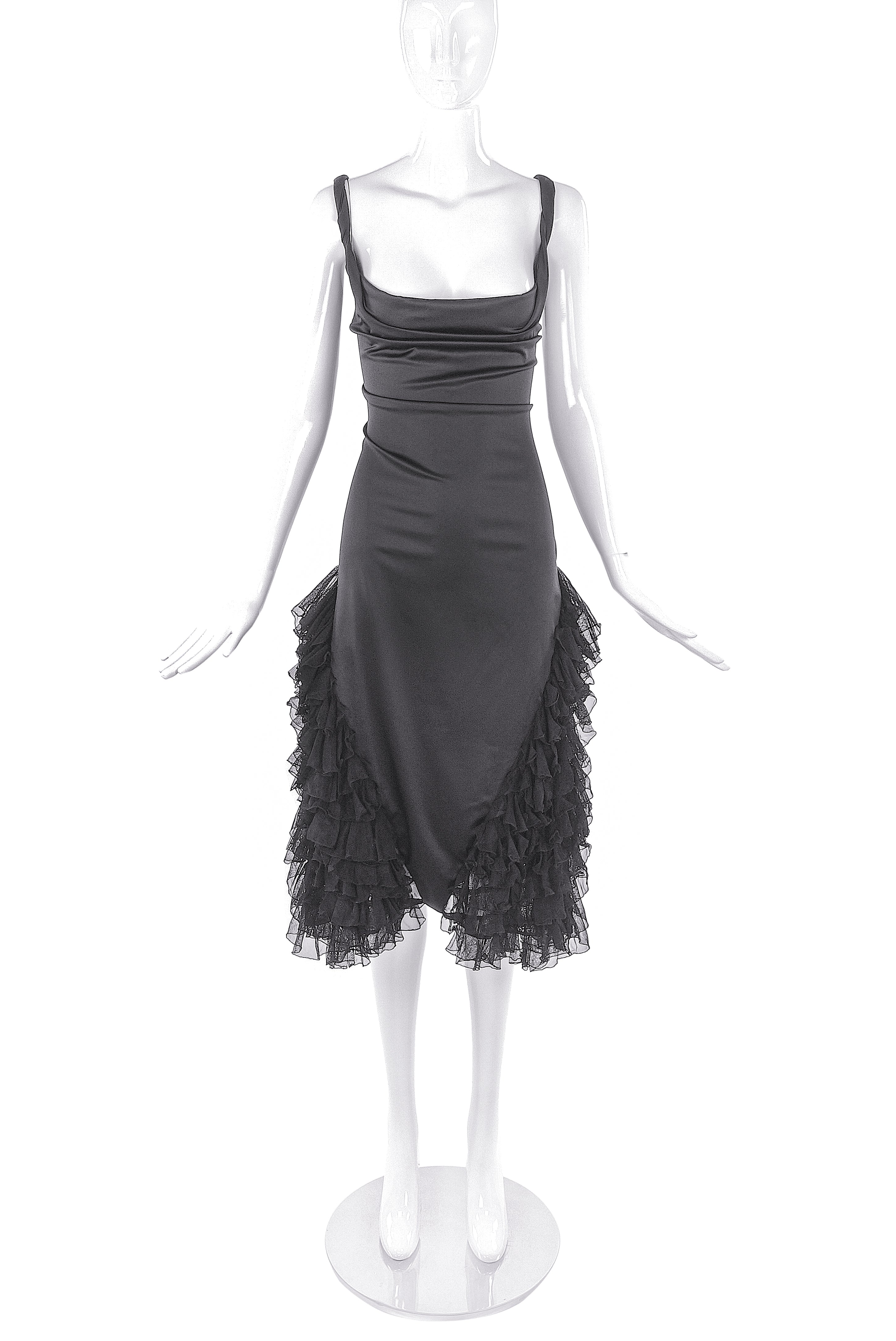 A lifetime McQueen satin stretch dress with lace and tulle ruffles by Alexander McQueen - Either Spring 1999 - No.13 / Robot Collection, or Spring 2001 / Voss Collection or Fall 2001 / Merry Go Around Collection.