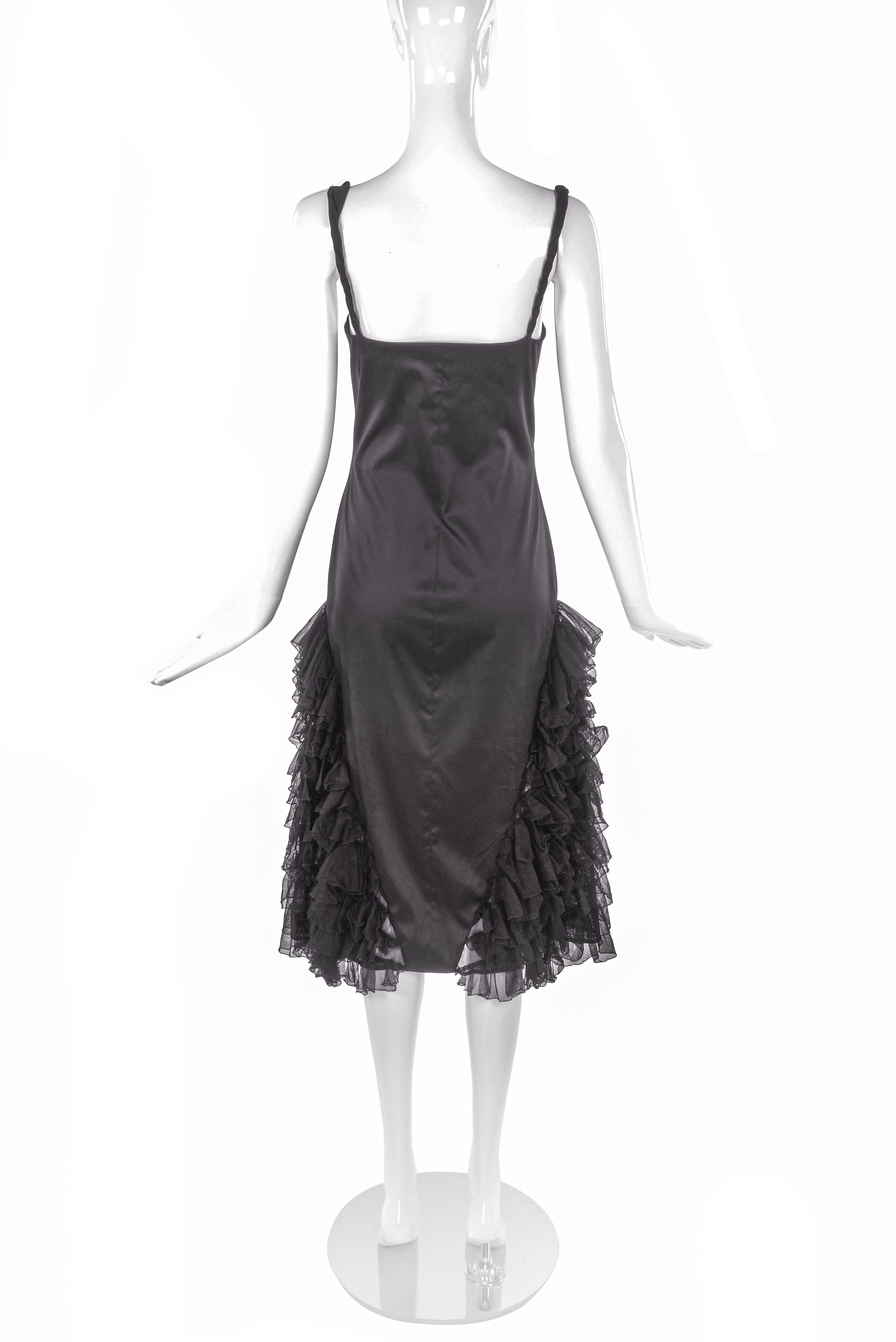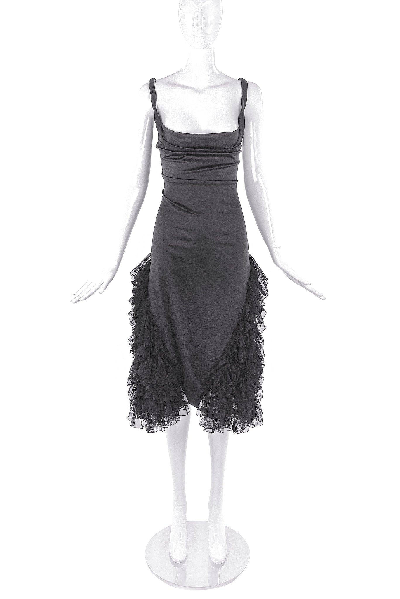 Alexander McQueen Black Satin Cowl Neck Dress with Lace Ruffle Details Late Nineties