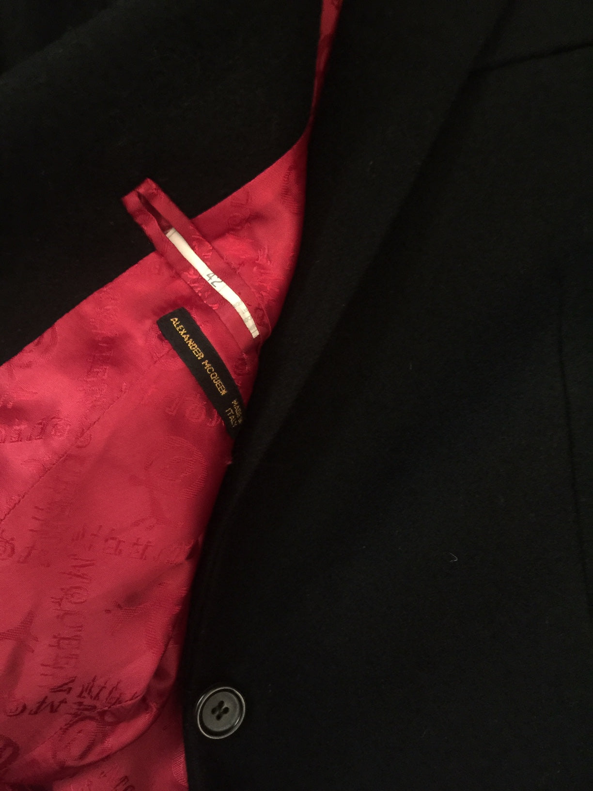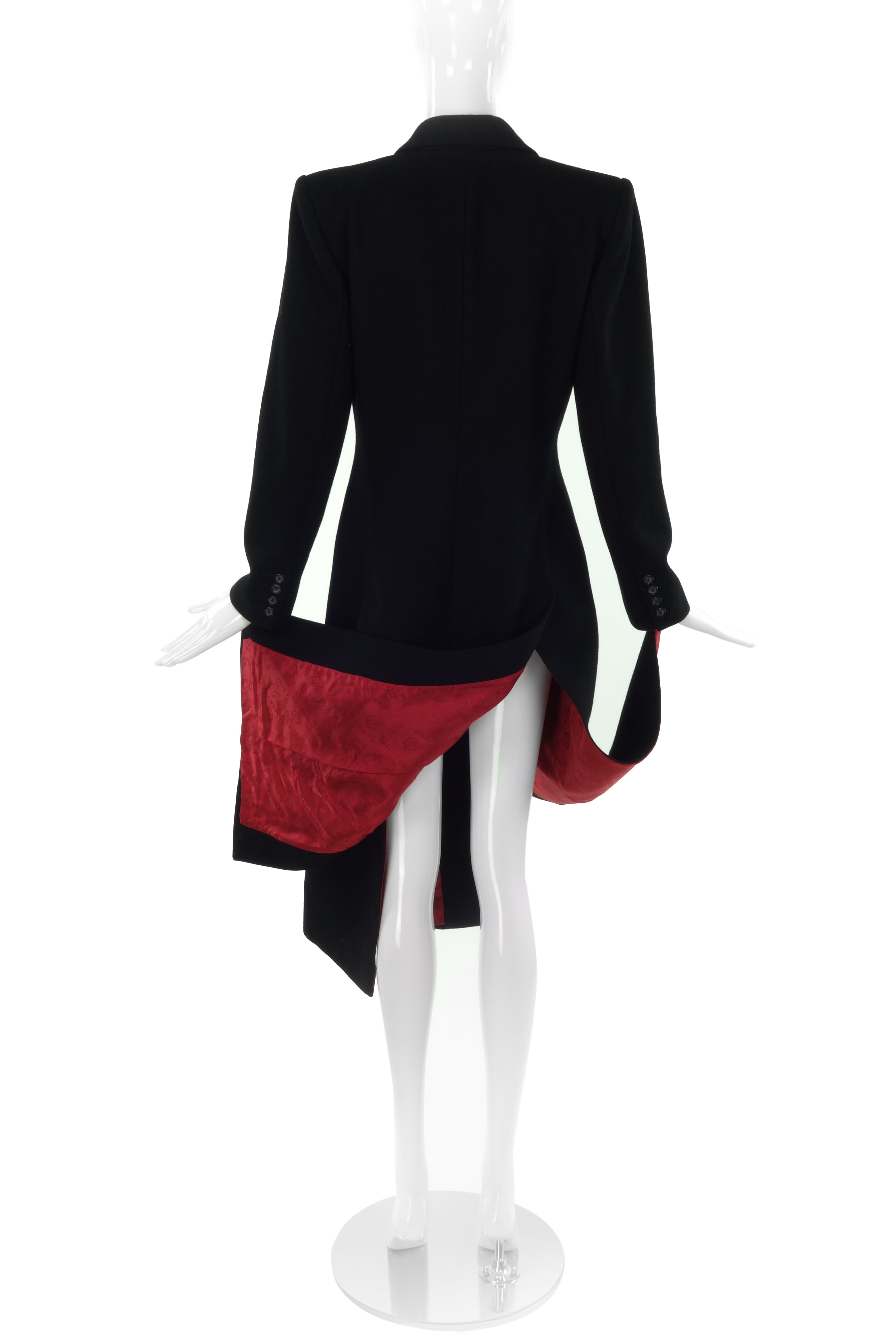 An Alexander McQueen black wool coat with razor sharp tailoring details which give the shoulders a strong silhouette and has a one button closure at the waist. The coat has a high cut vent in the back of the jacket to create a gentleman's coat-like detail. The interior of the jacket is lined in vibrant scarlet silk with the Alexander McQueen logo jacquard into the silk. From the iconic Alexander McQueen Fall / Winter 1998 "Joan of Arc" collection.