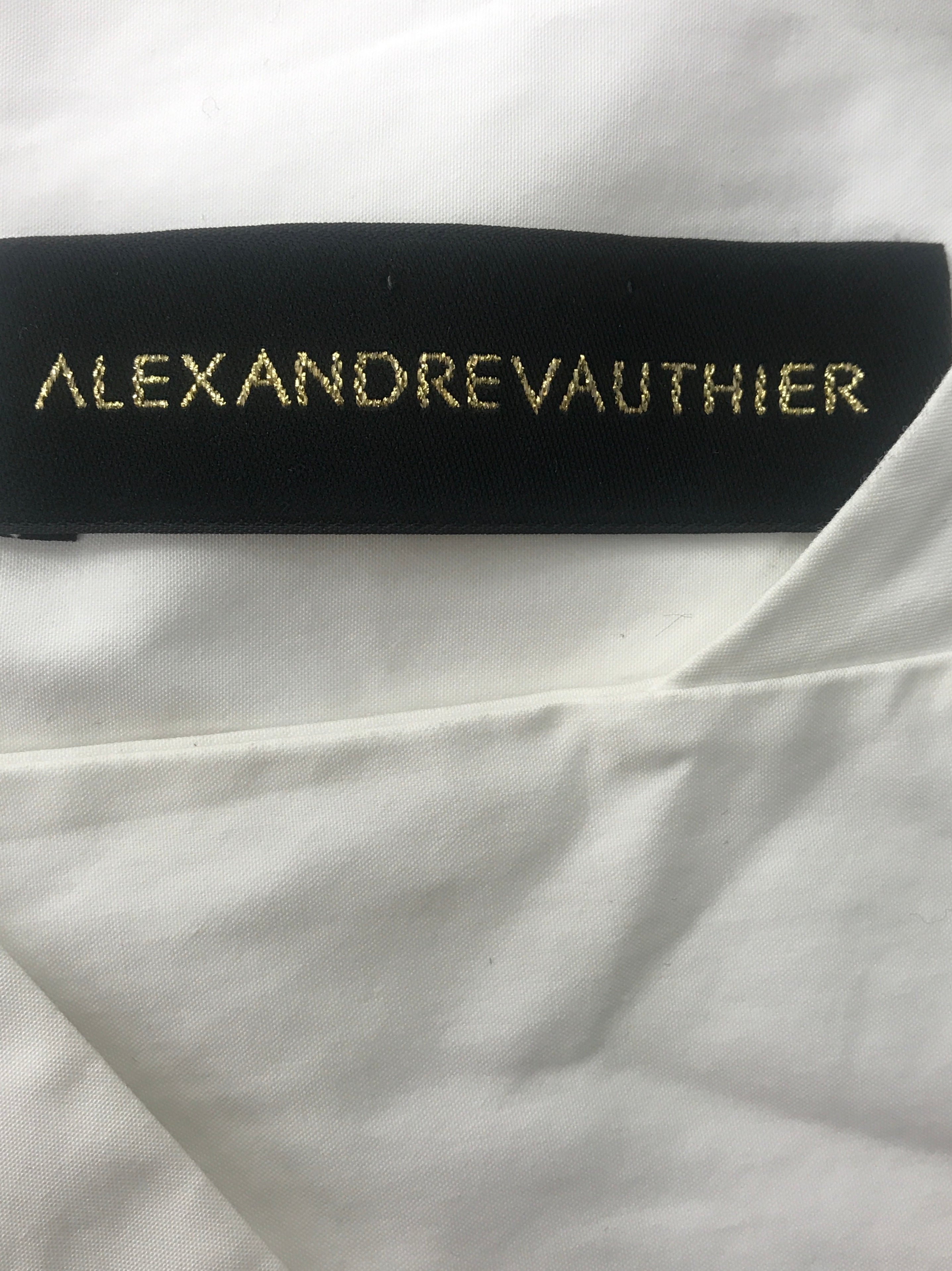 A Alexandre Vauthier white cotton one shoulder with a couture like construction oversized puff sleeve. The top has a huge waist wrap bow which can be tied according to size and makes the top adjustable from a small to a medium. From the Alexandre Vauthier Couture Spring / Summer 2017 collection Look 5.