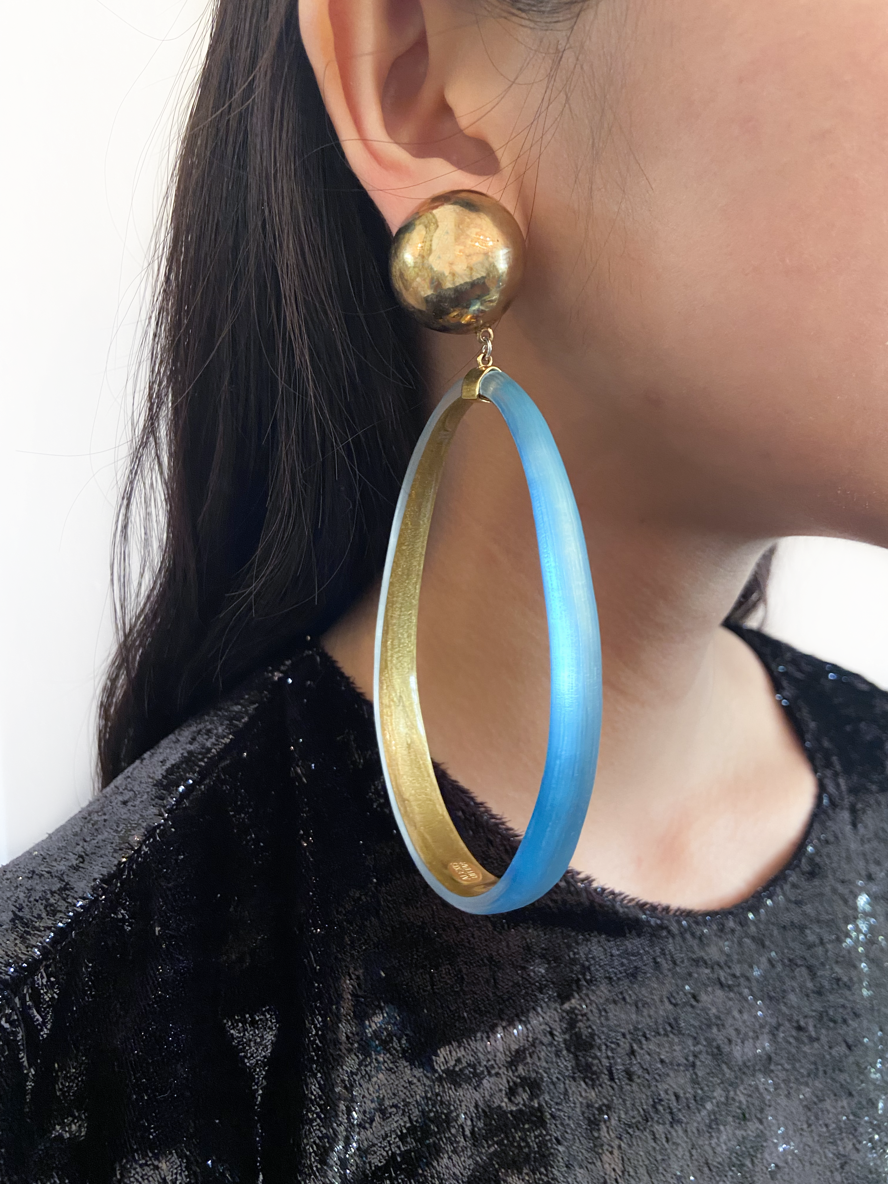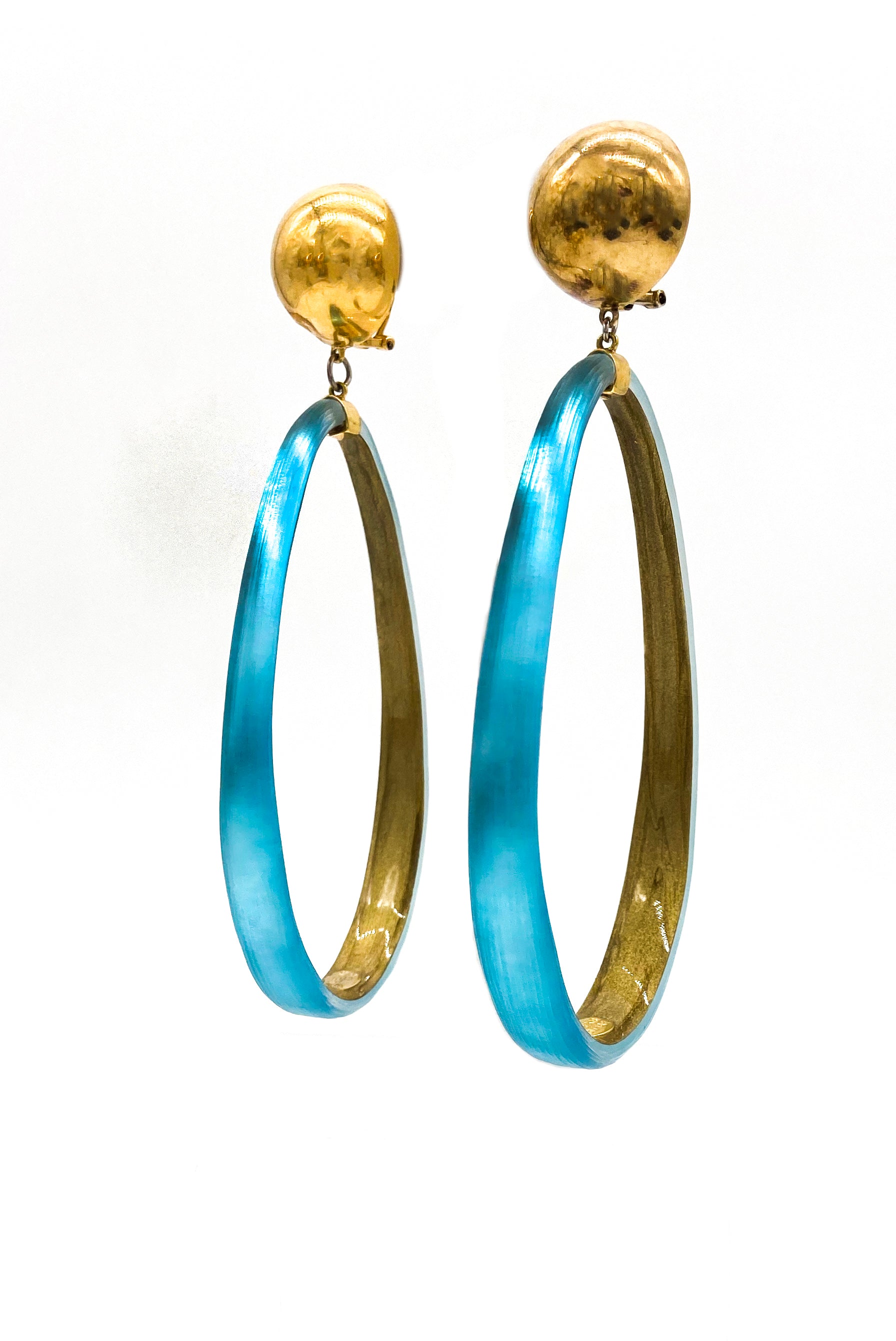 A pair of Alexis Bitter teardrop shaped blue resin earrings. The clip on earrings clasp are gold toned with the interior of the hoops painted with a gold tone. The 1960's "Mod" esque statement hoops are very large.