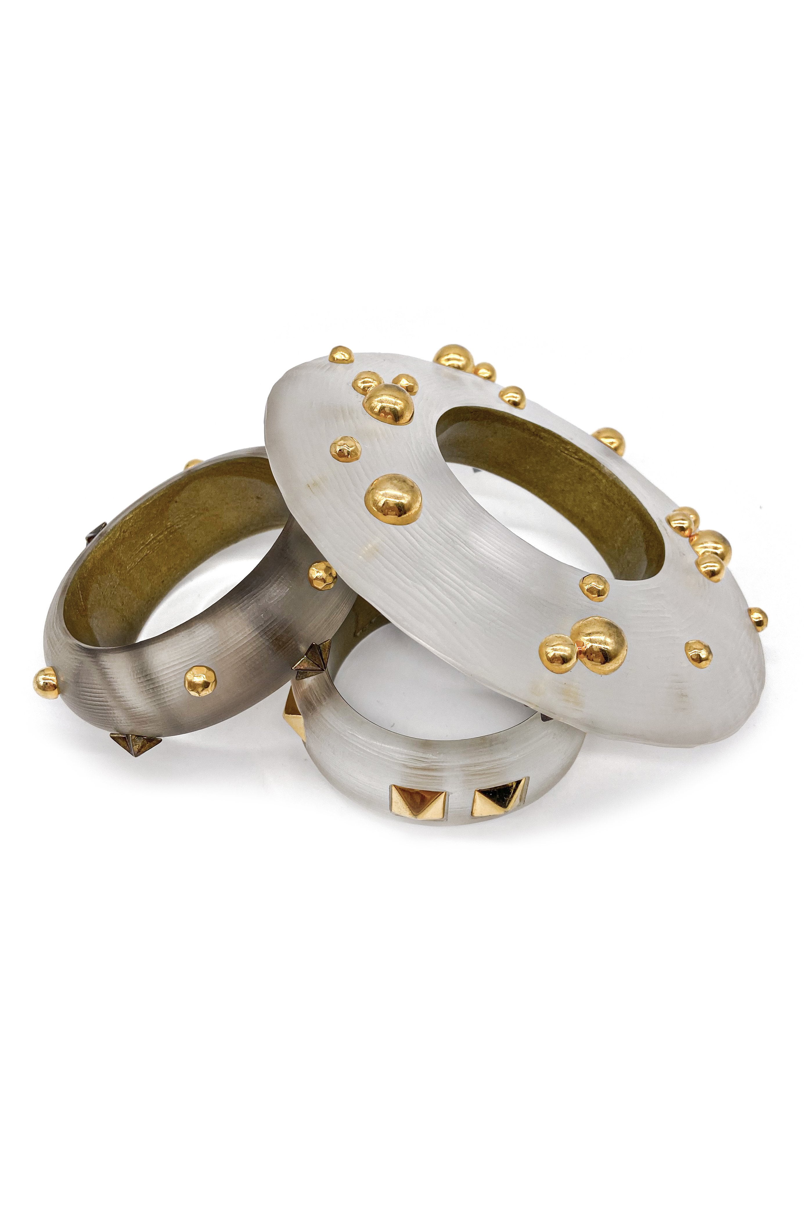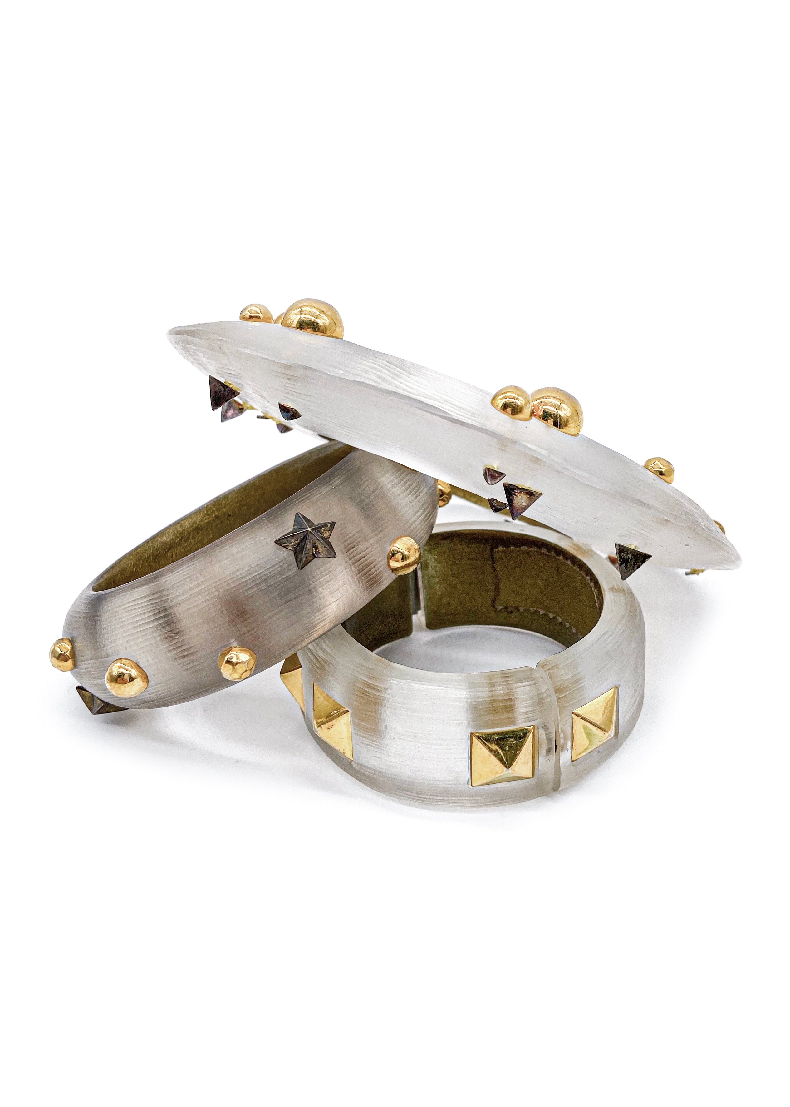 A trio of Alexis Bitter studded cuffs. One of the cuffs is a matte clear lucite with gold toned studs. Another cuff is a gunmetal grey matte cuff with rounded gold studs. The last cuff is a oversized "flying saucer" shaped matte clear lucite cuff with rounded gold toned studs.