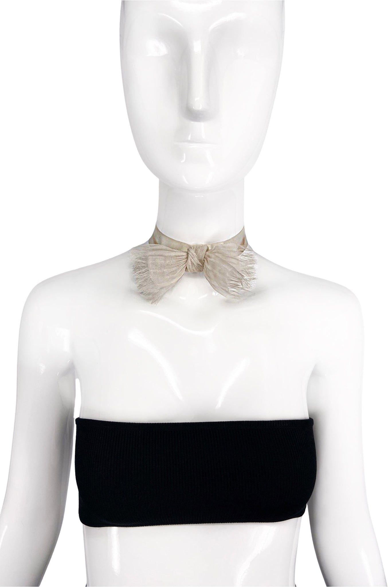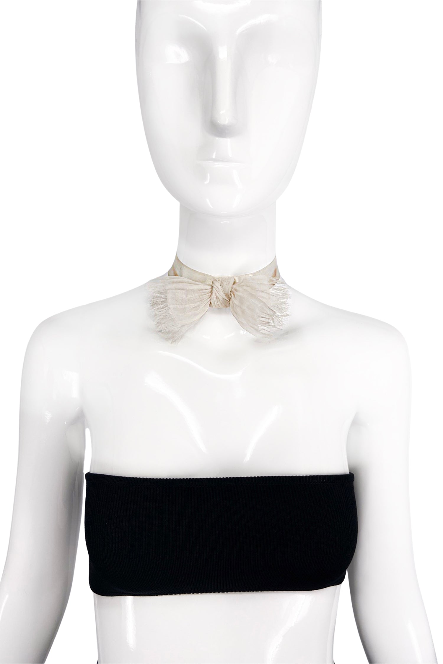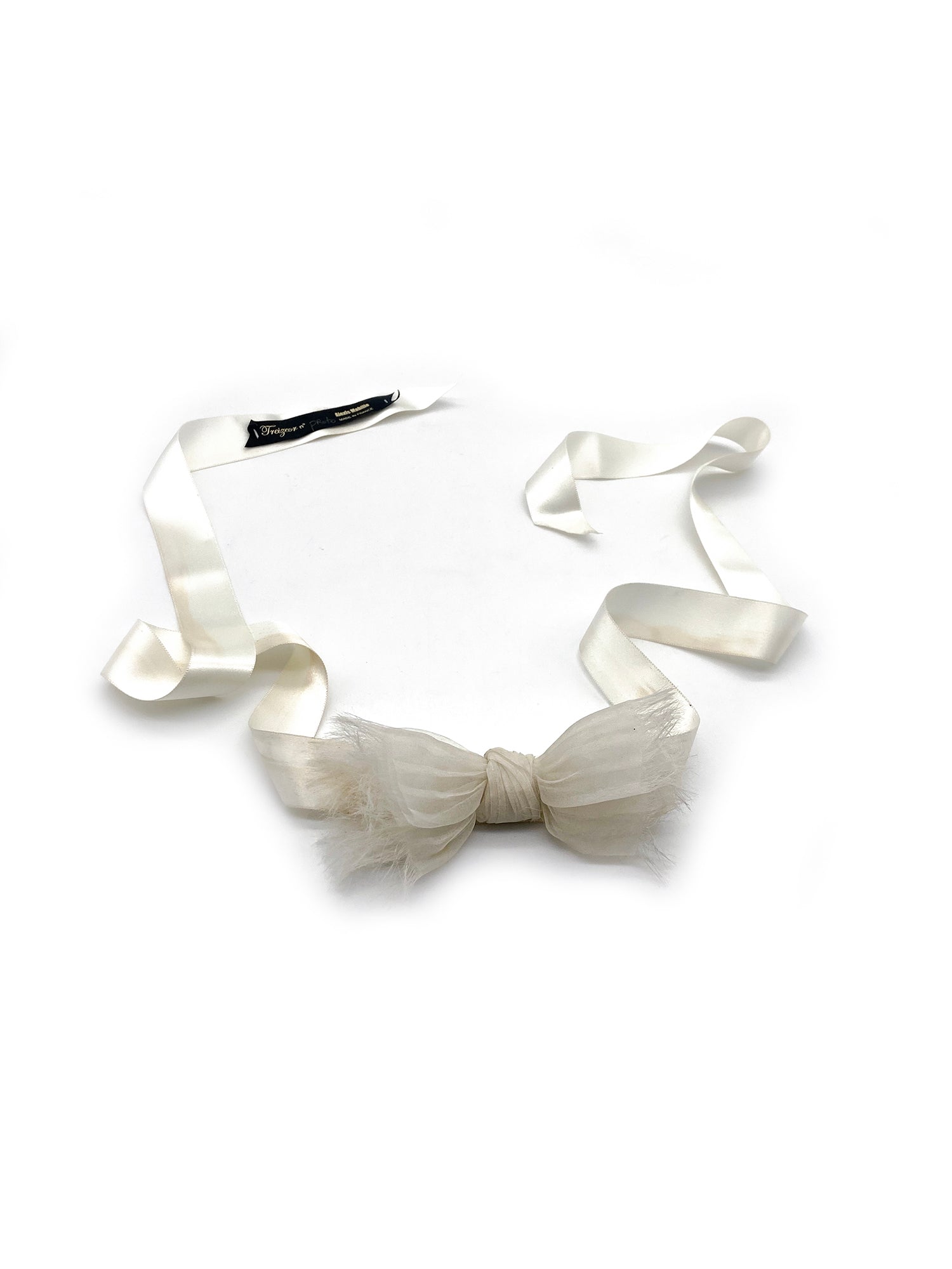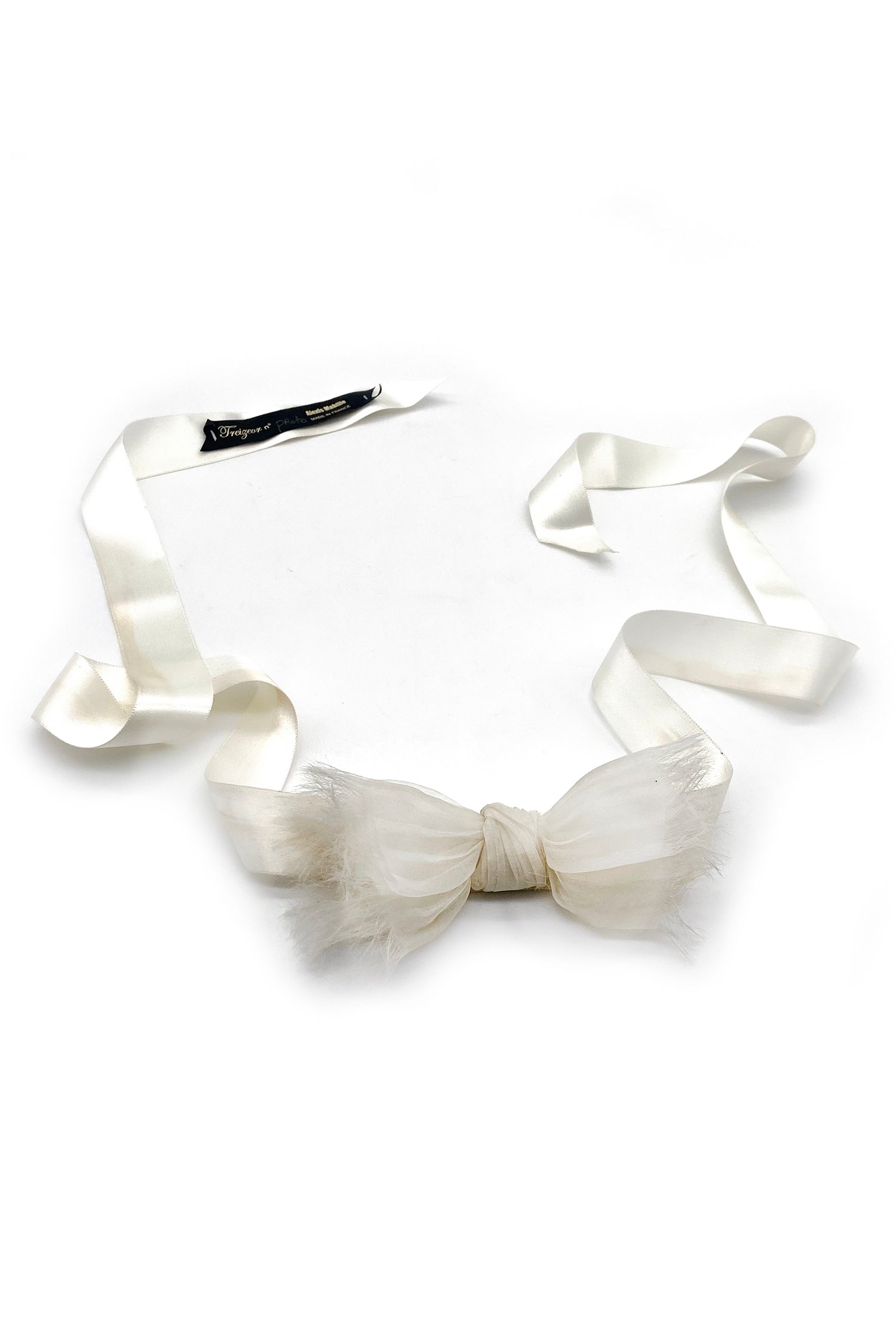 An Alexis Mabille off white chiffon bow tie with a white ribbon to tie around the neck as or in the hair. The bow has a delicate feathered fray detail along the edges of the bow.