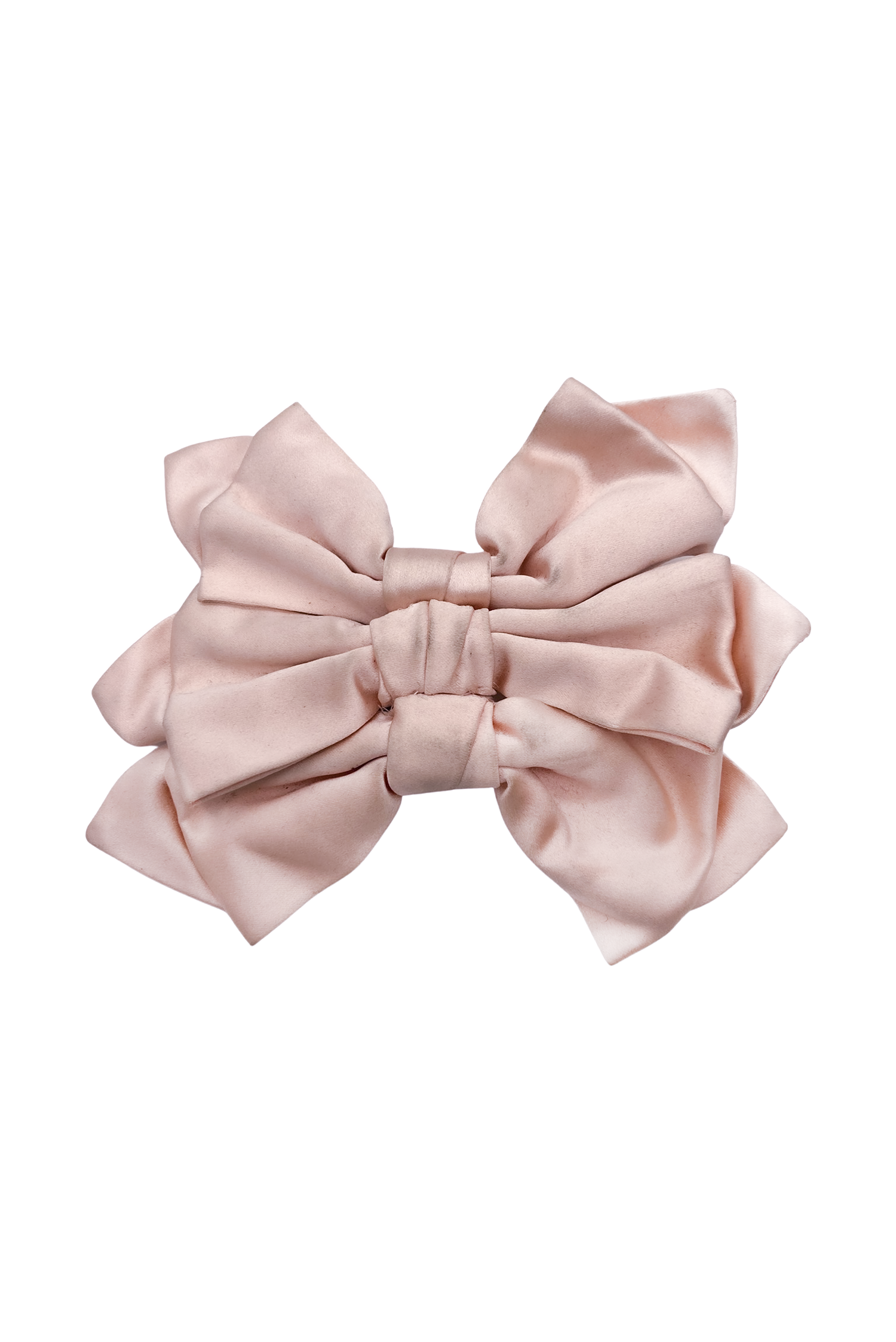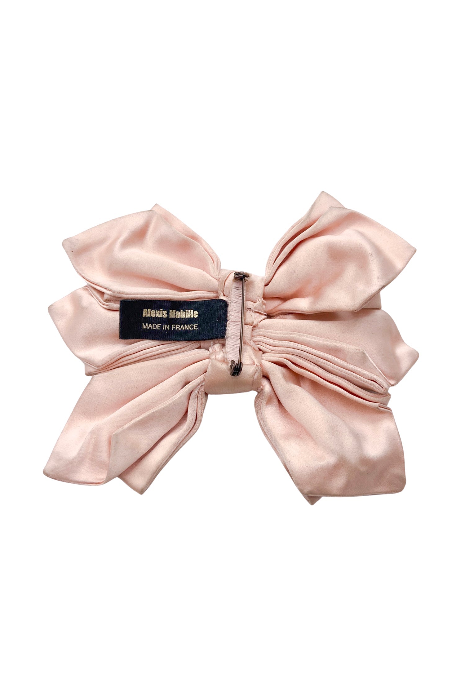 An Alexis Mabille baby pink broache with three bows stacked on top of each other. The bows have a pin and circle lock backing.