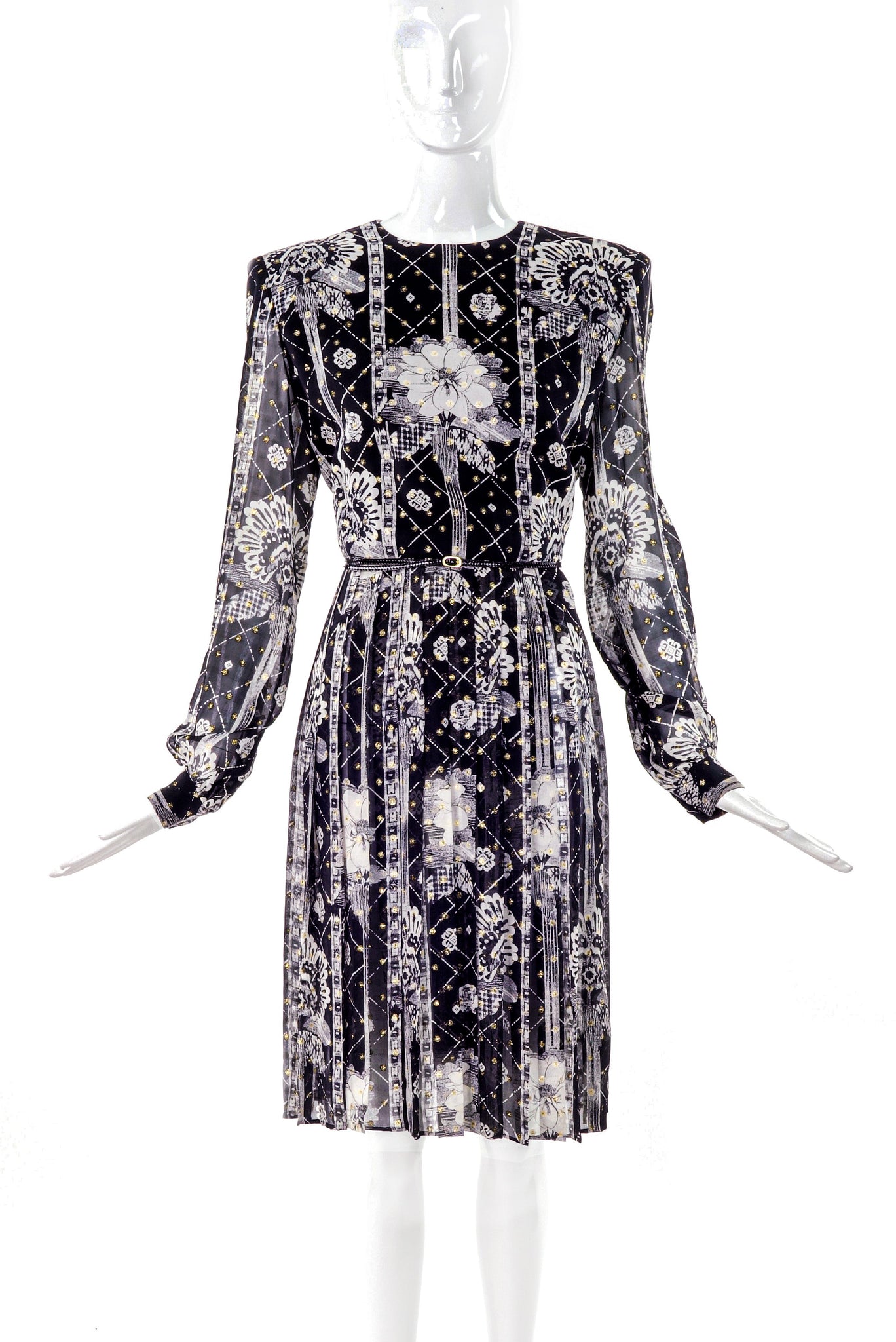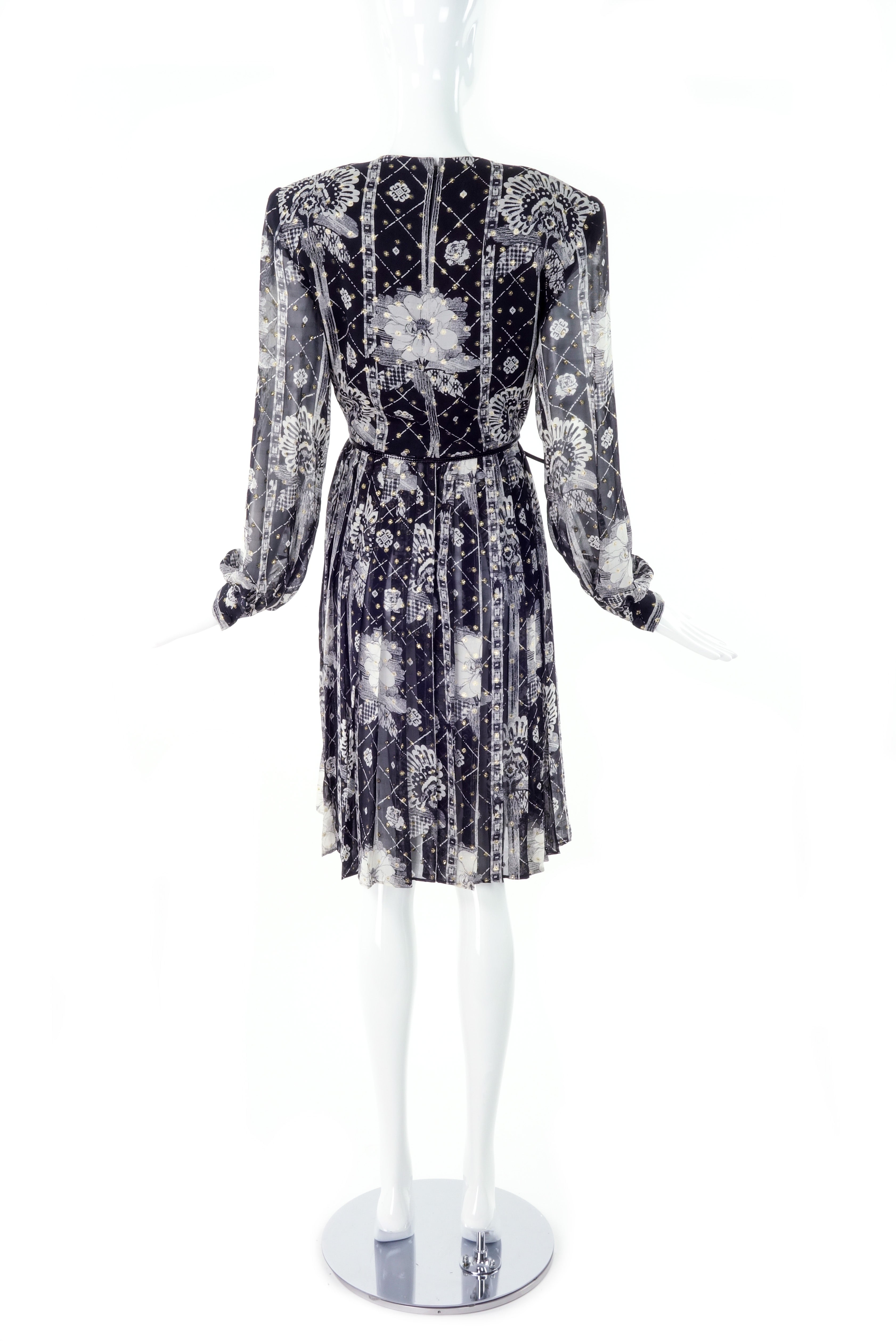 A vintage André Laug black and white floral print chiffon long sleeve knee-length dress with the Joan Crawford sequel classic Hollywood power shoulders.